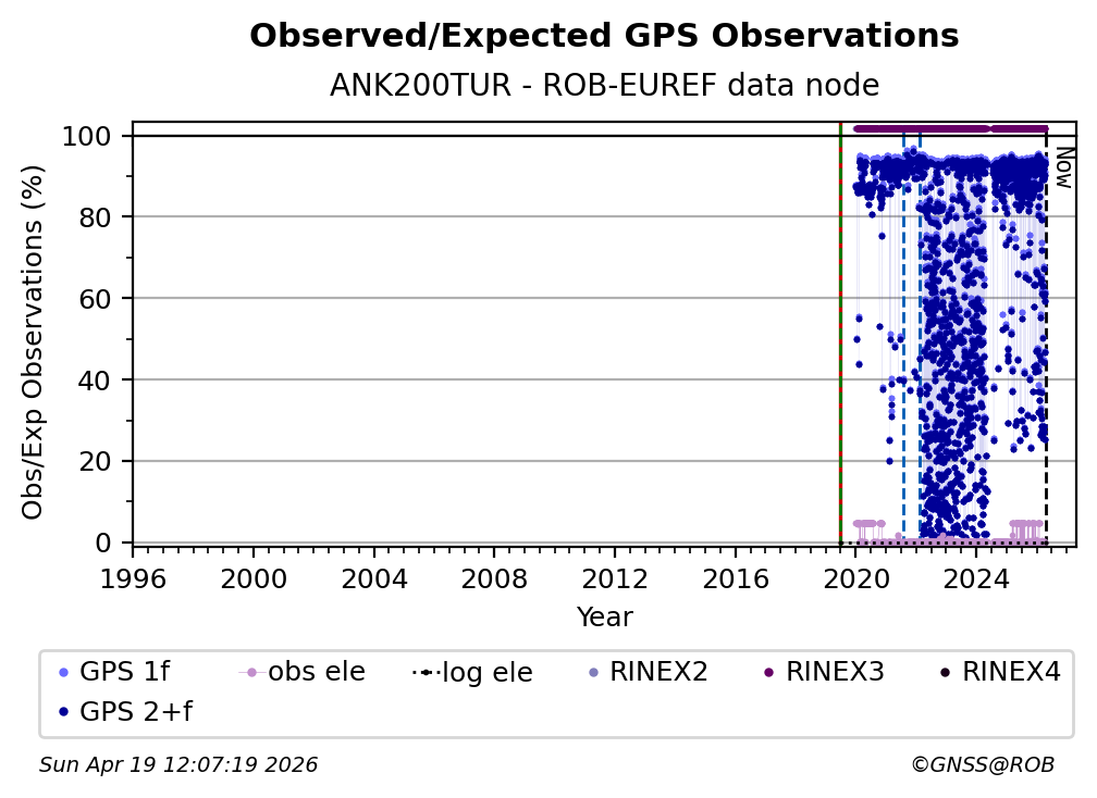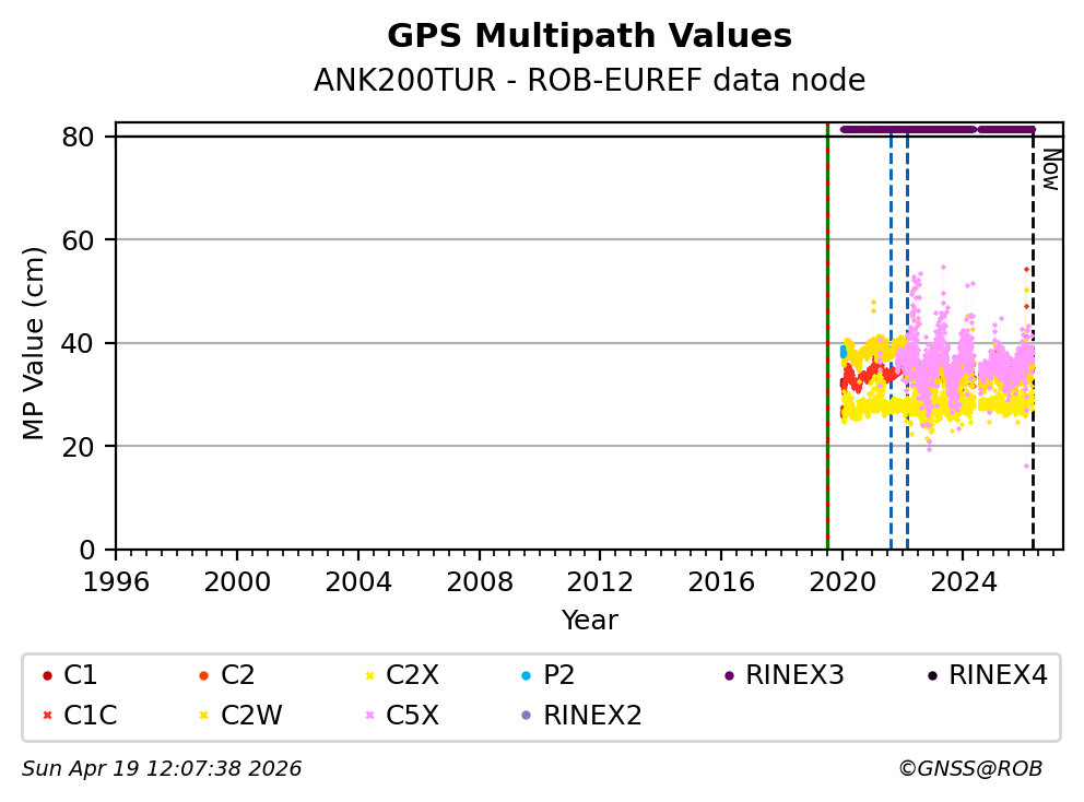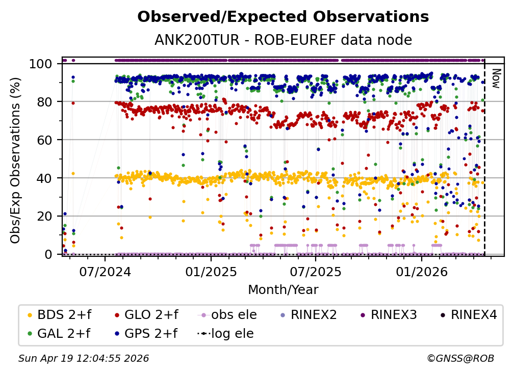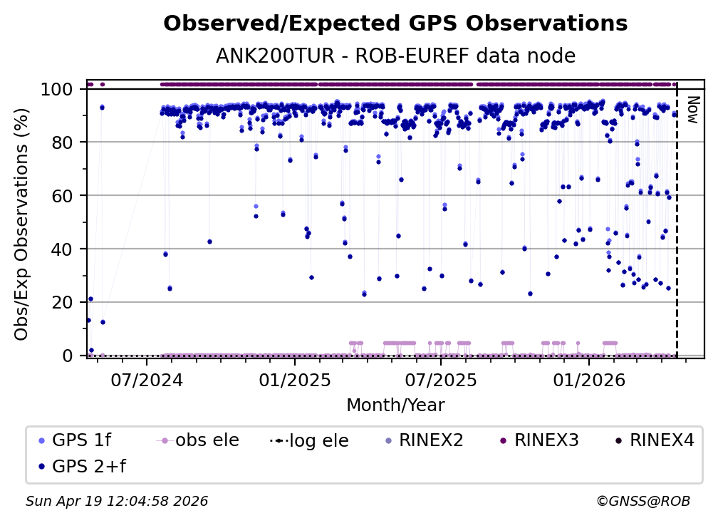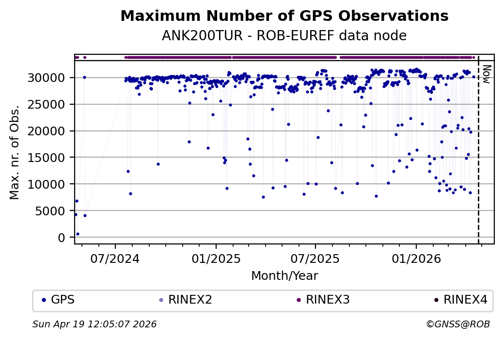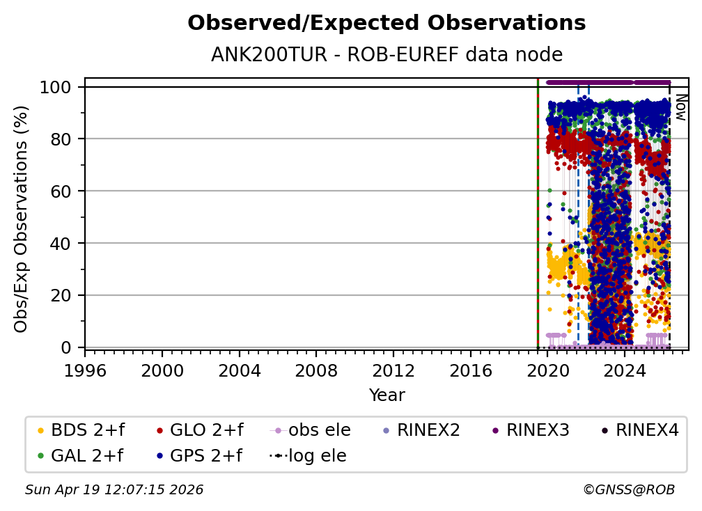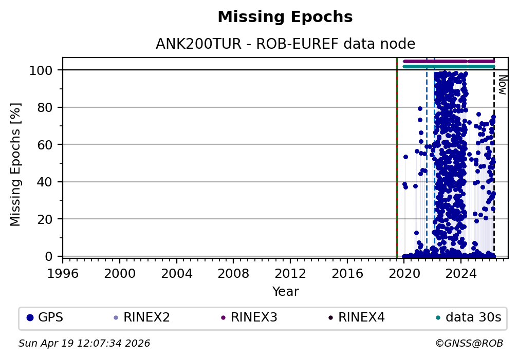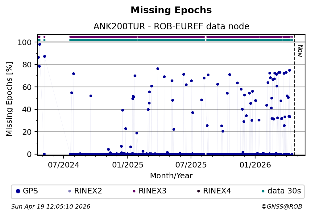 The plots below present the long-term tracking performance of the EPOS-GNSS station ANK200TUR based on the daily RINEX data available from the ROB-EUREF EPOS-GNSS data node. The data quality metrics have been computed at the data node using the G-Nut/Anubis software.