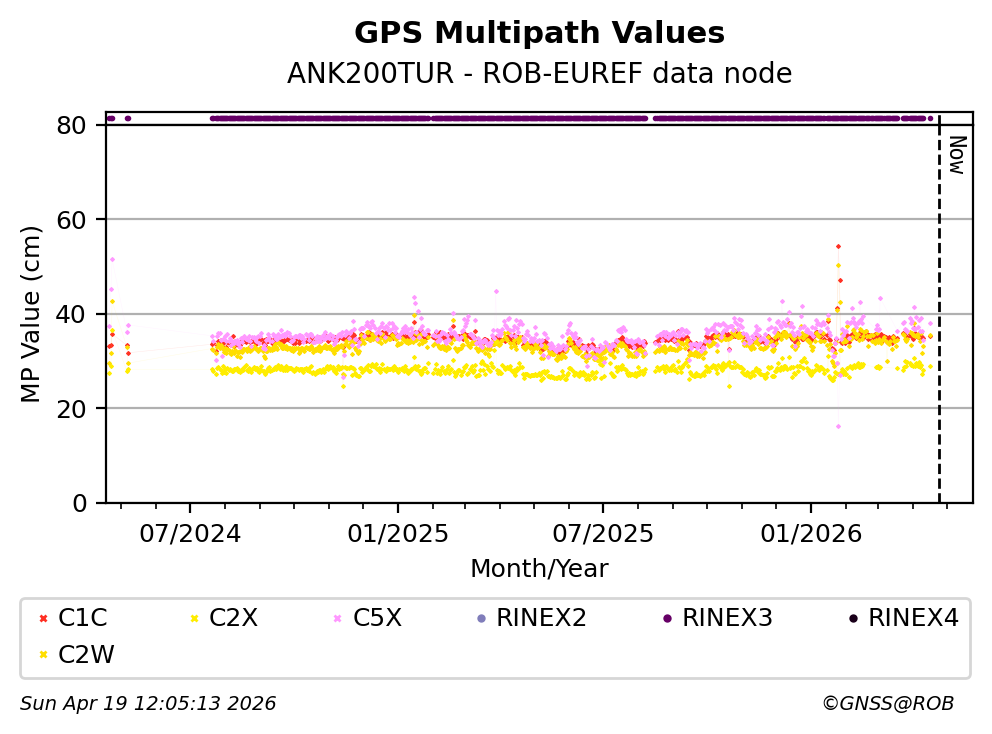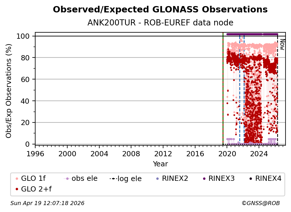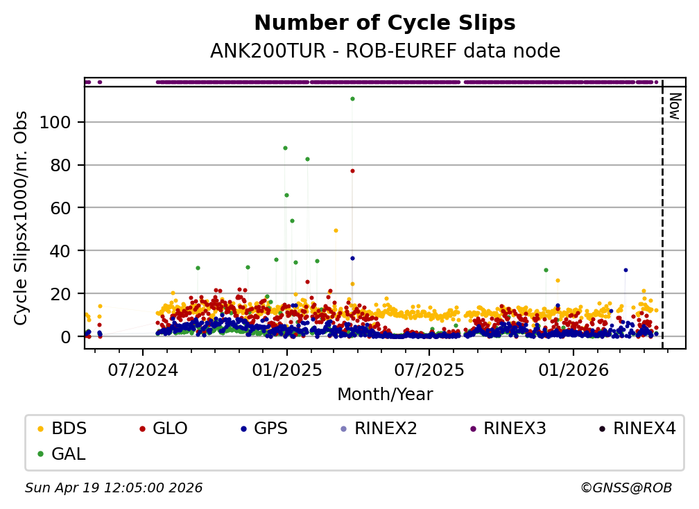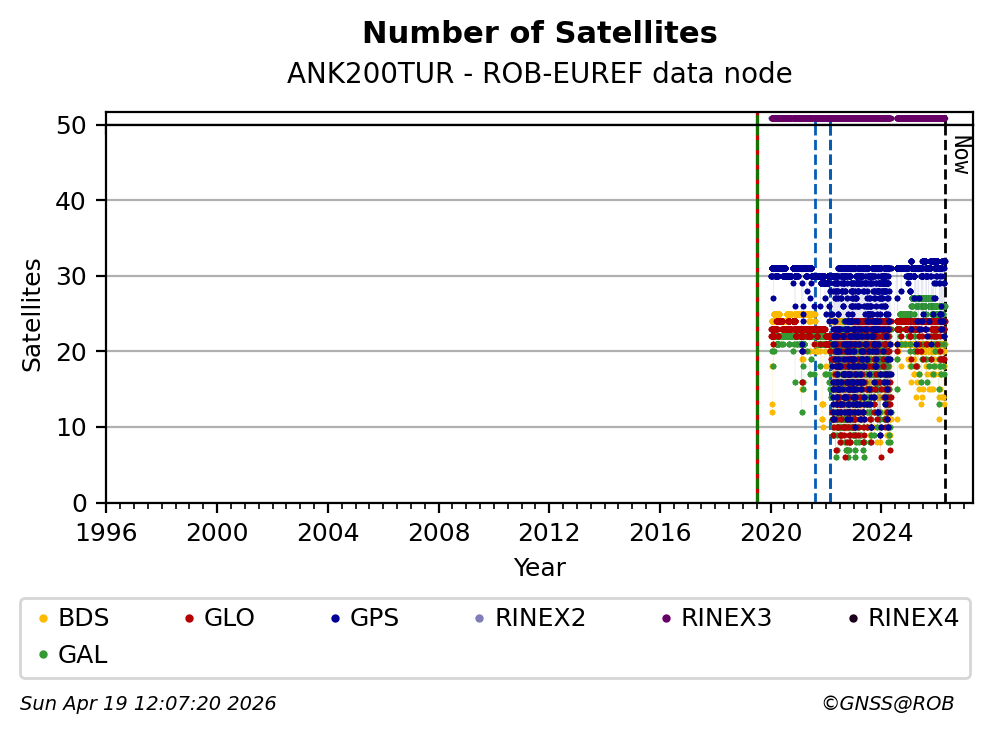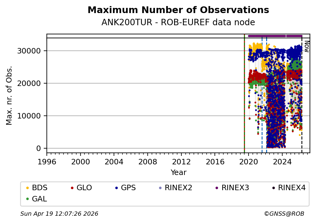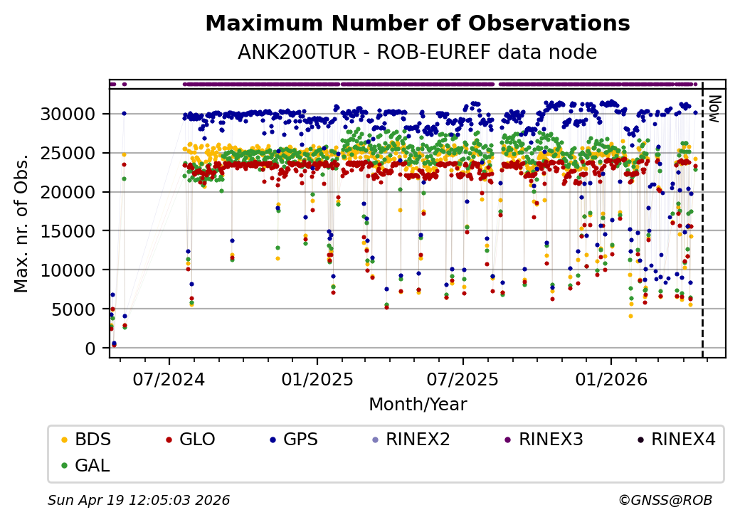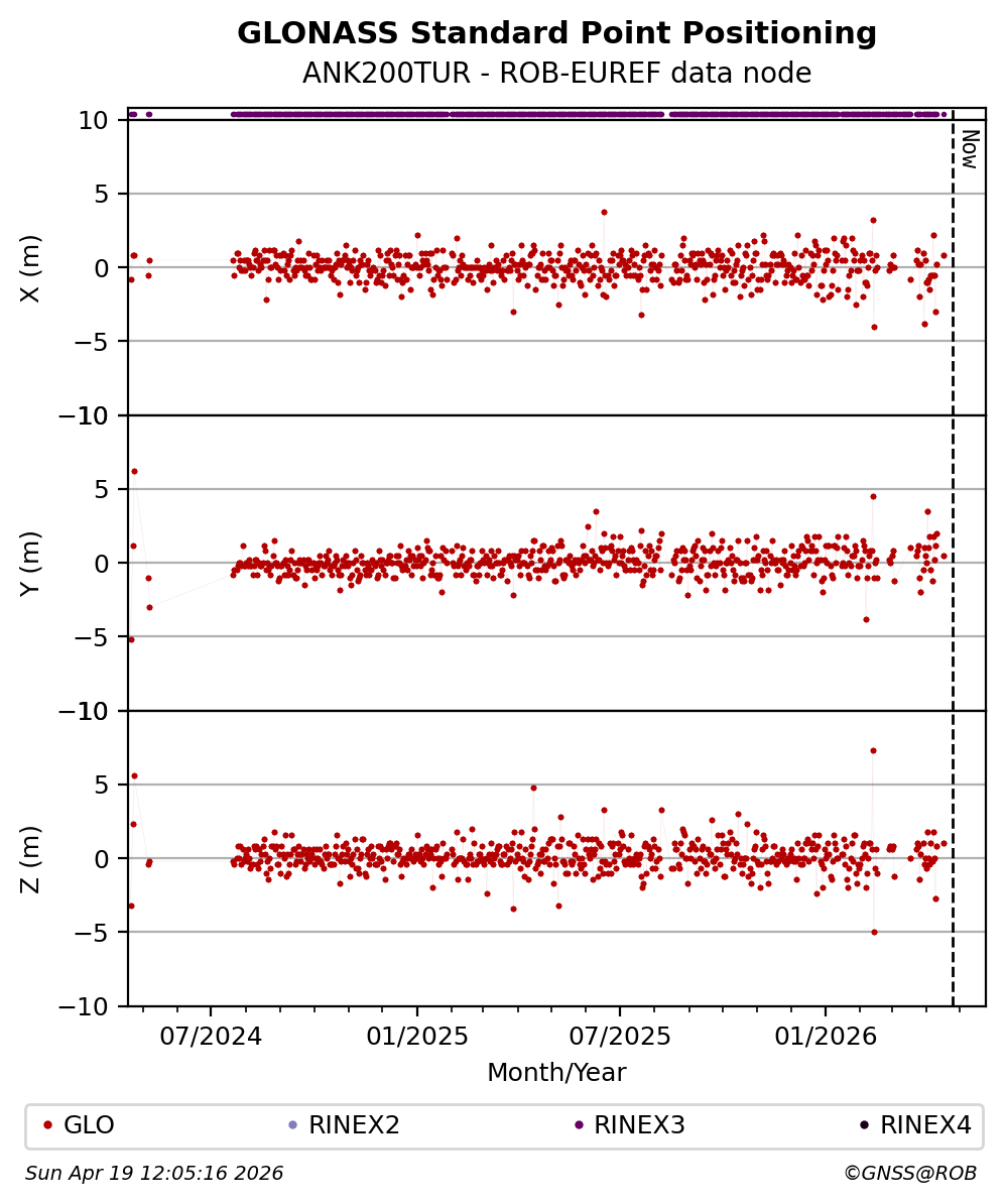 The plots below present the long-term tracking performance of the EPOS-GNSS station ANK200TUR based on the daily RINEX data available from the ROB-EUREF EPOS-GNSS data node. The data quality metrics have been computed at the data node using the G-Nut/Anubis software.