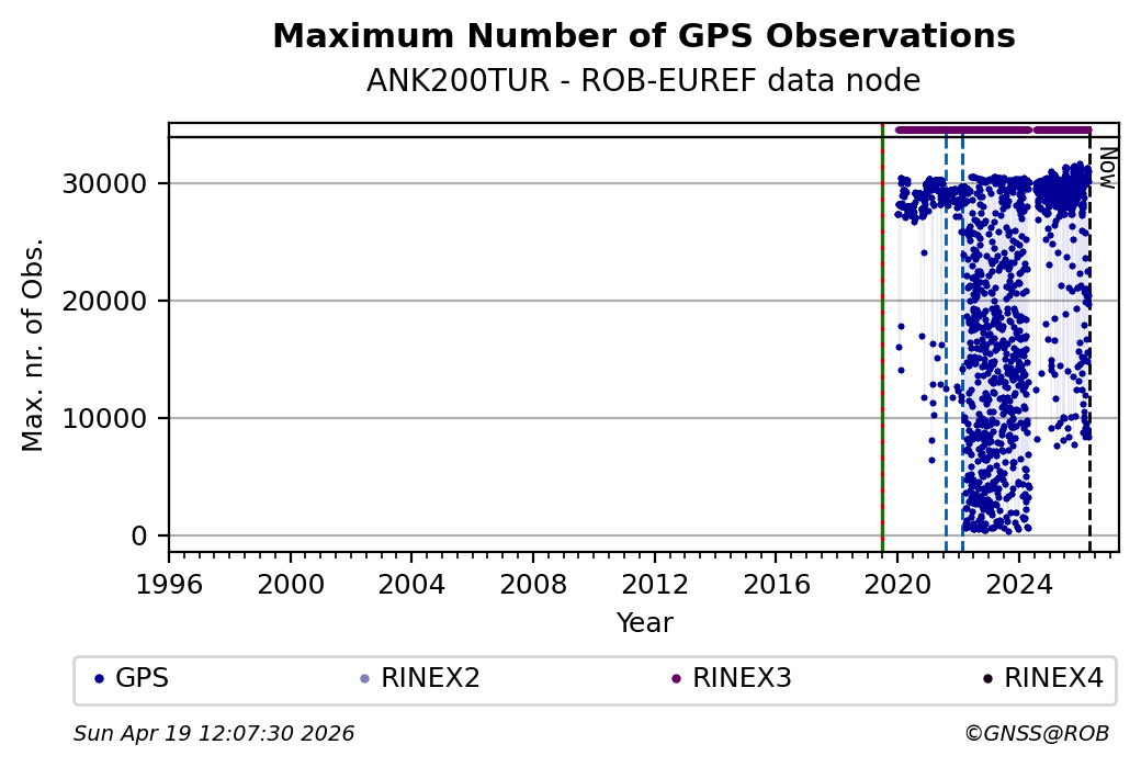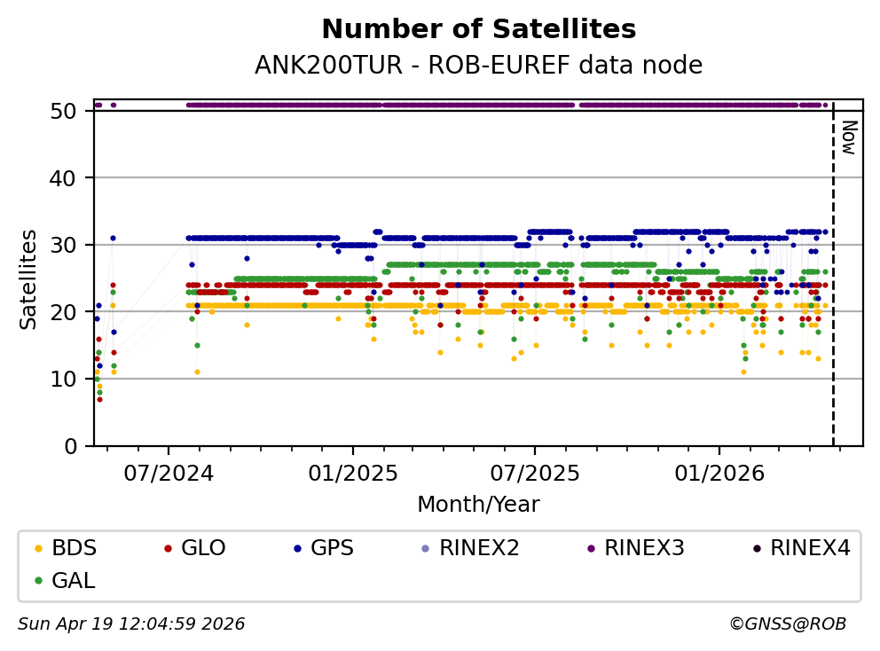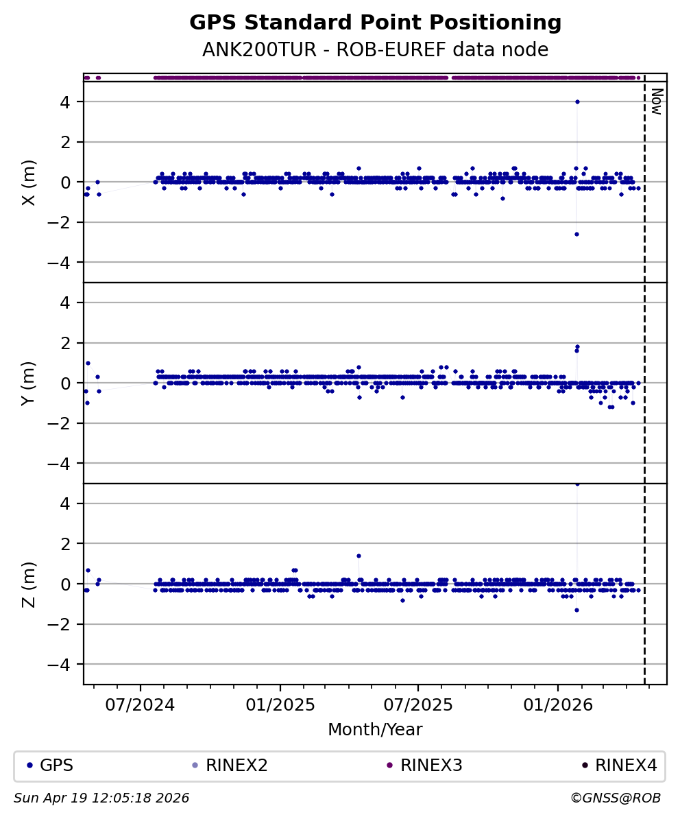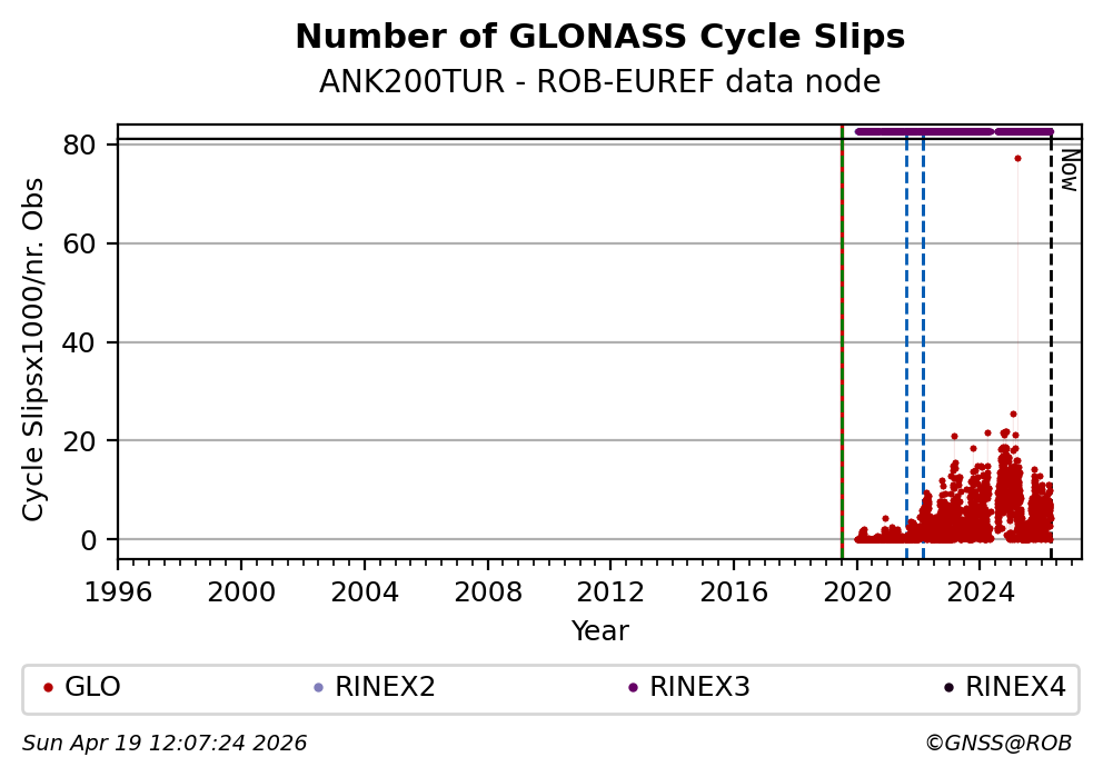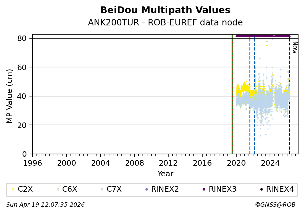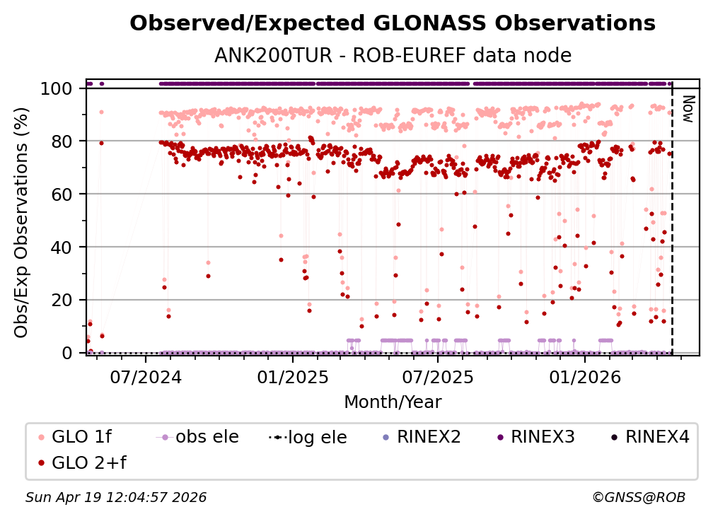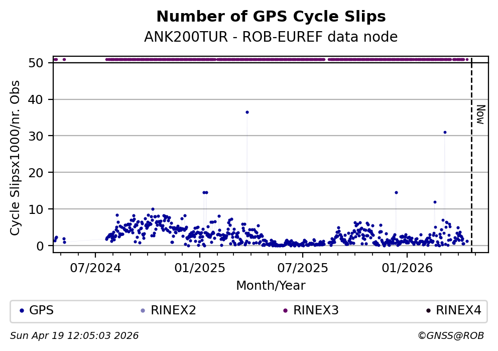 The plots below present the long-term tracking performance of the EPOS-GNSS station ANK200TUR based on the daily RINEX data available from the ROB-EUREF EPOS-GNSS data node. The data quality metrics have been computed at the data node using the G-Nut/Anubis software.