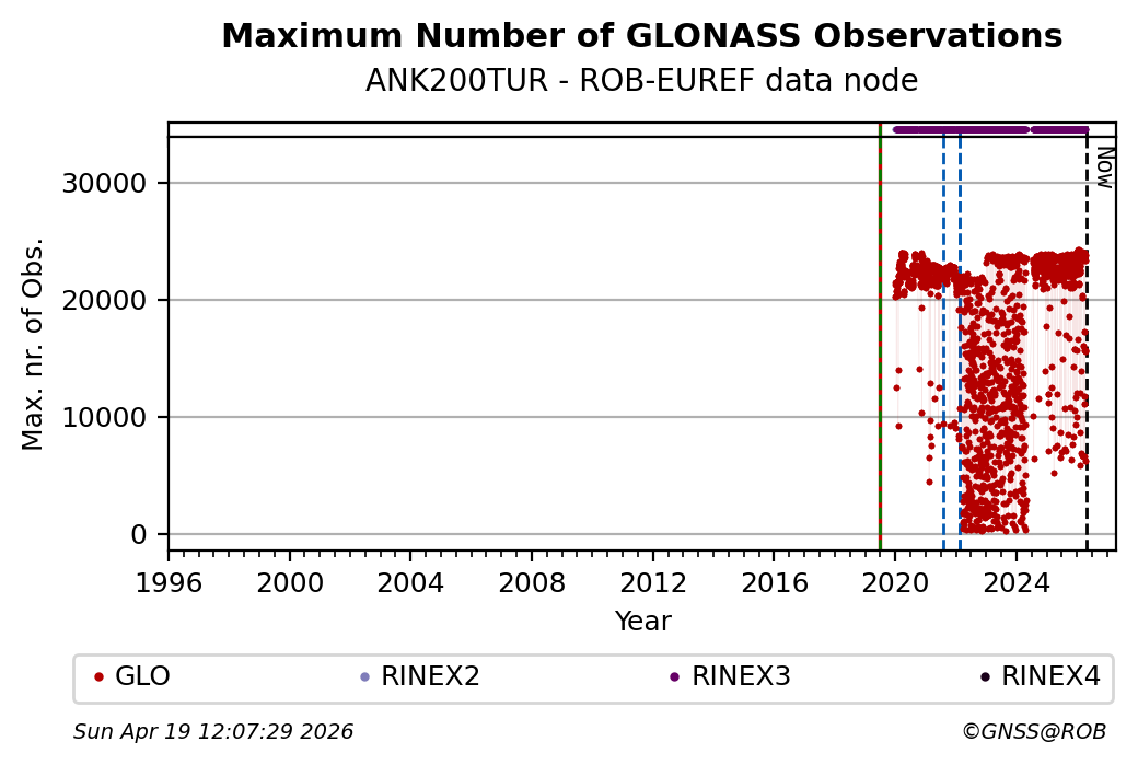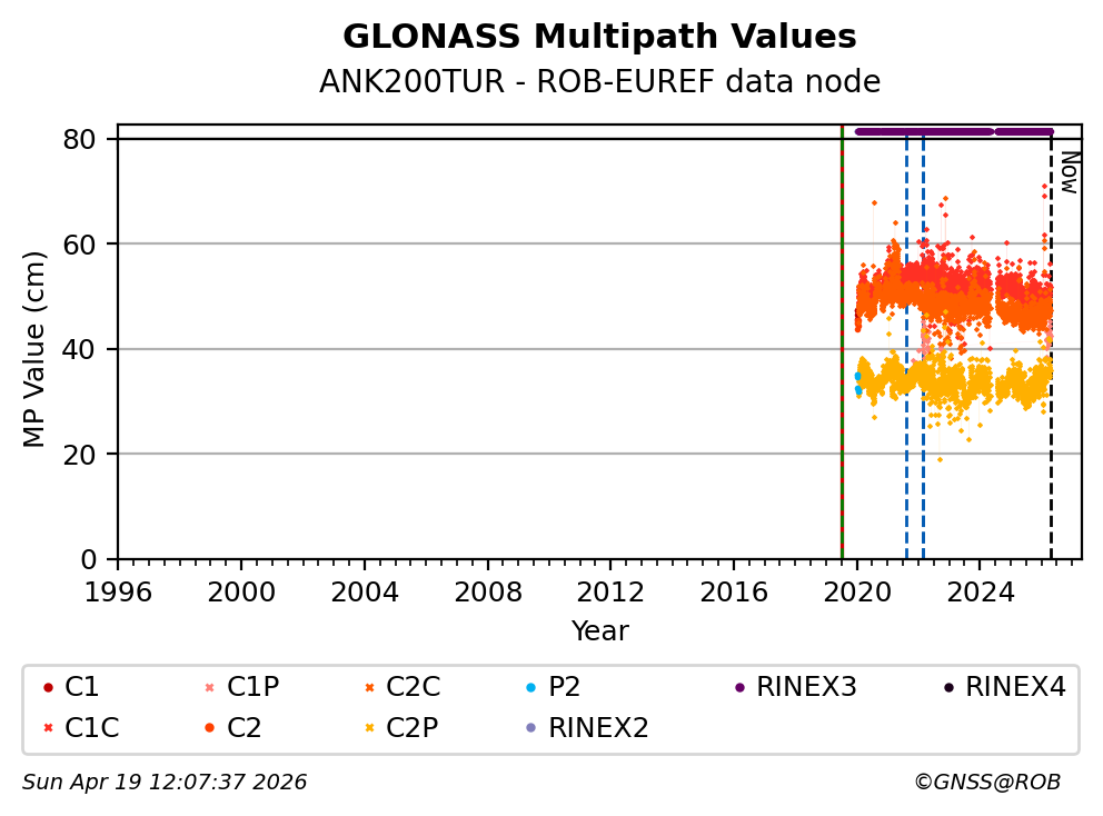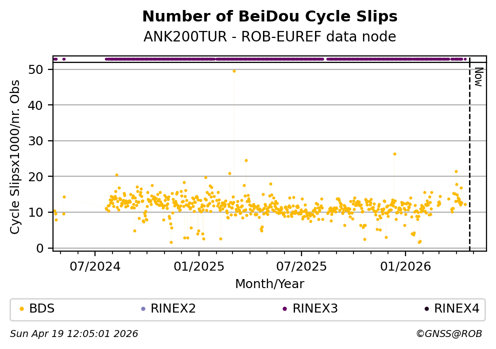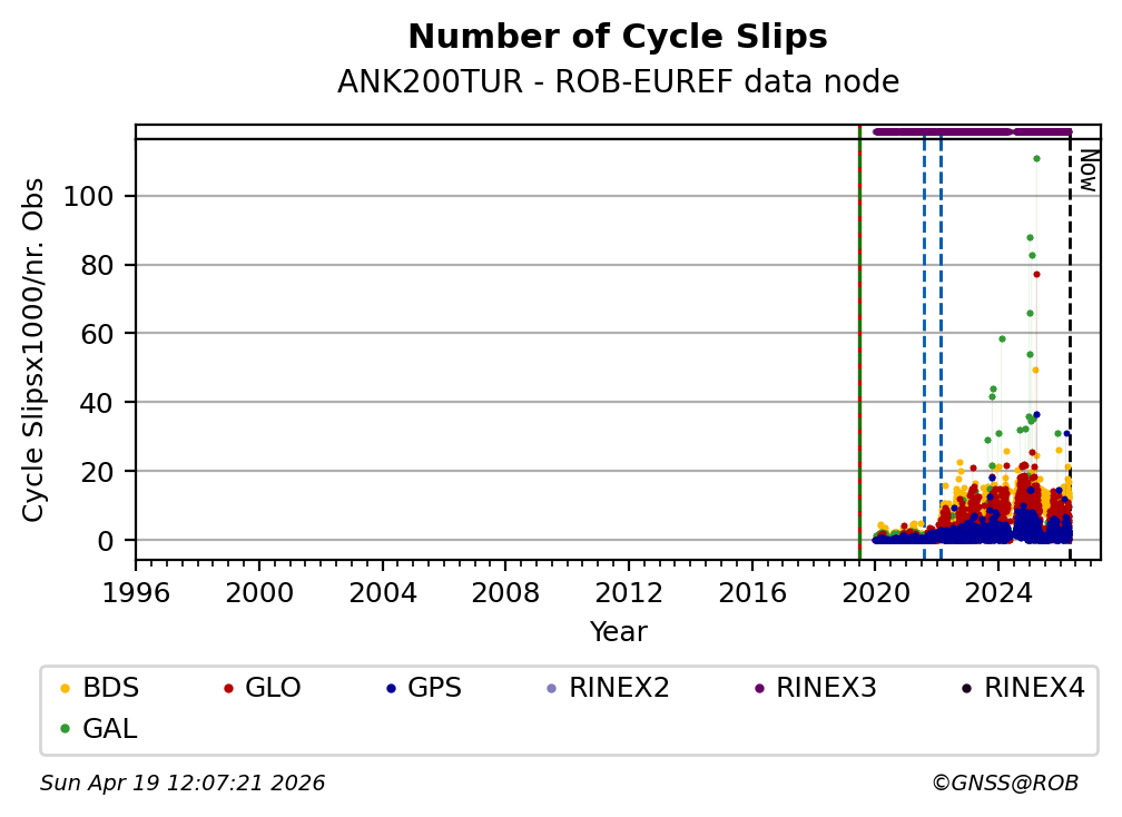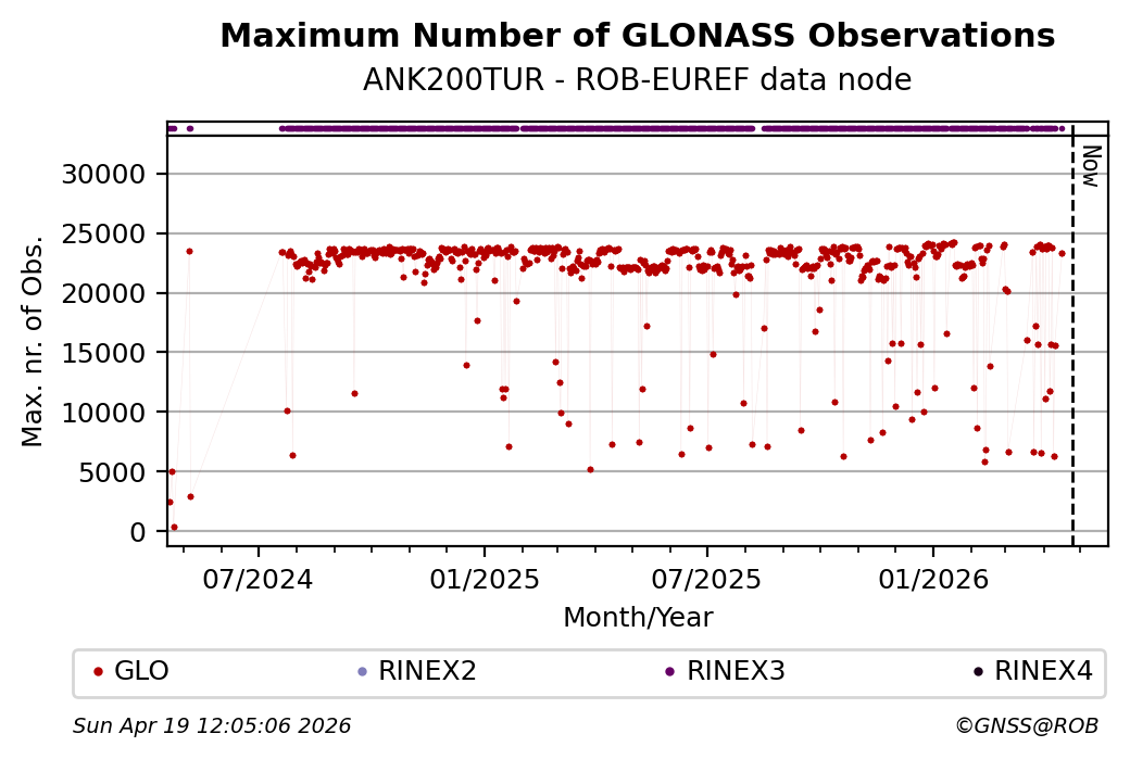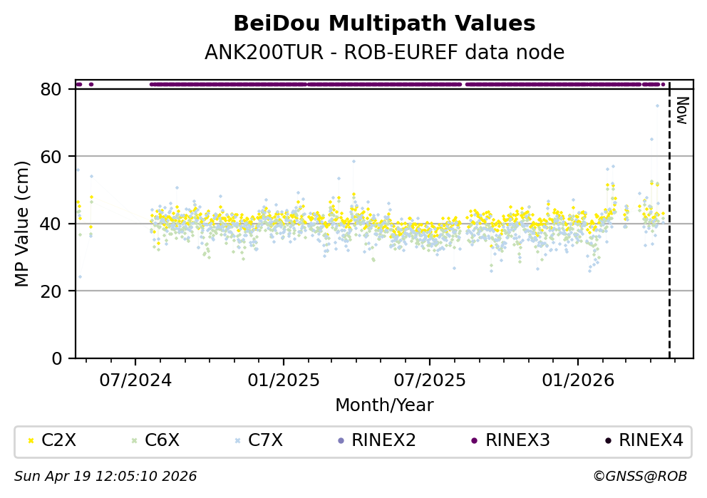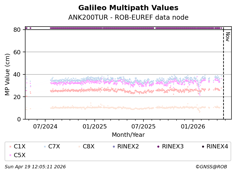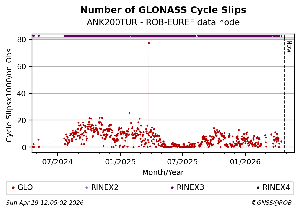 The plots below present the long-term tracking performance of the EPOS-GNSS station ANK200TUR based on the daily RINEX data available from the ROB-EUREF EPOS-GNSS data node. The data quality metrics have been computed at the data node using the G-Nut/Anubis software.