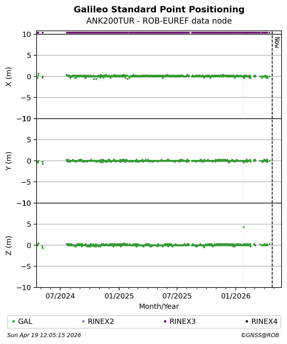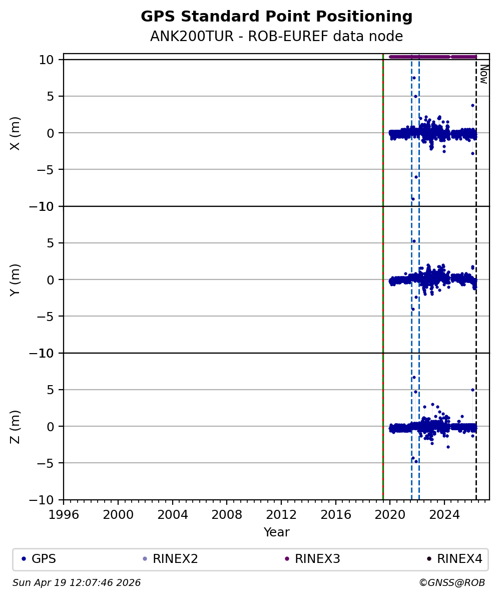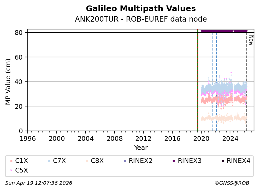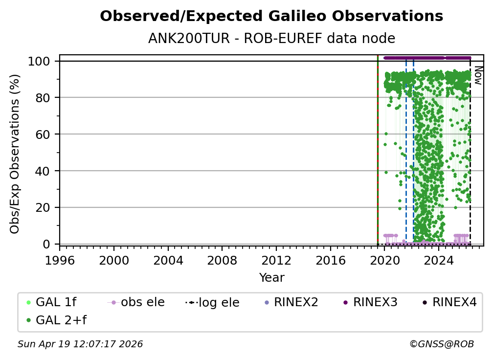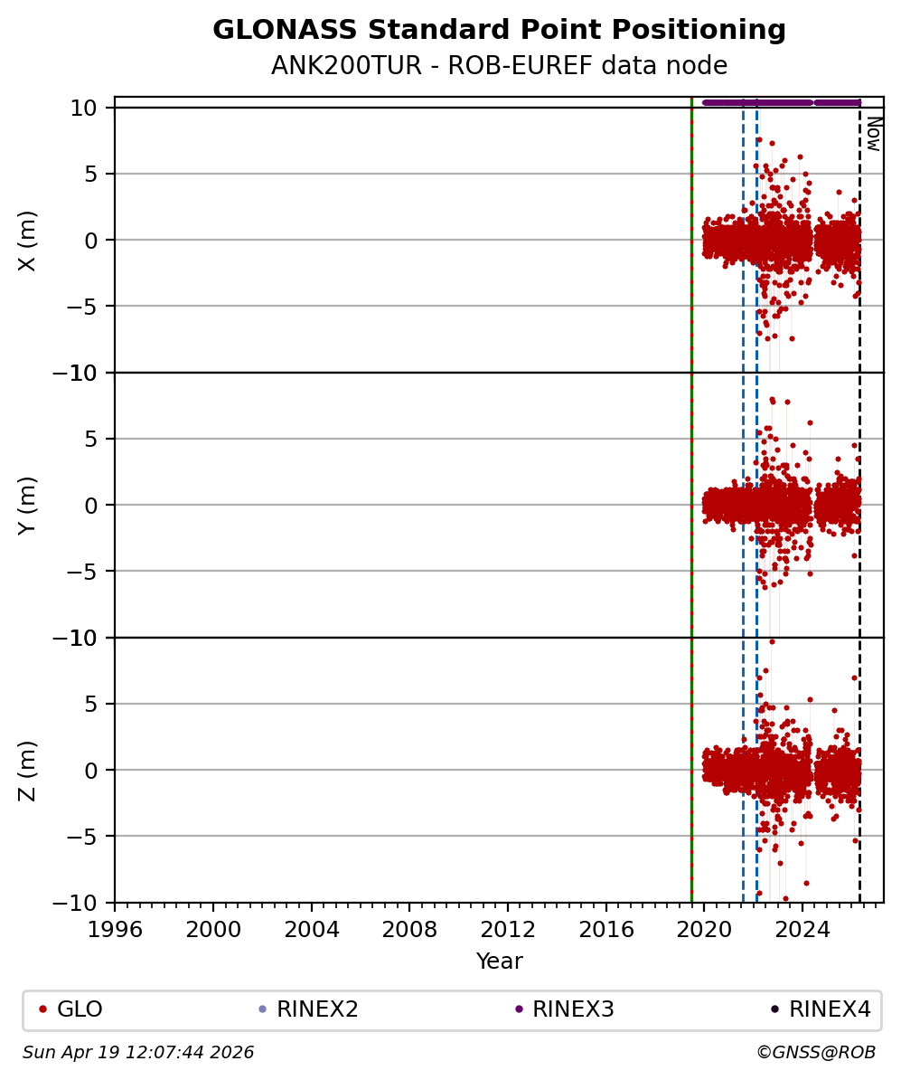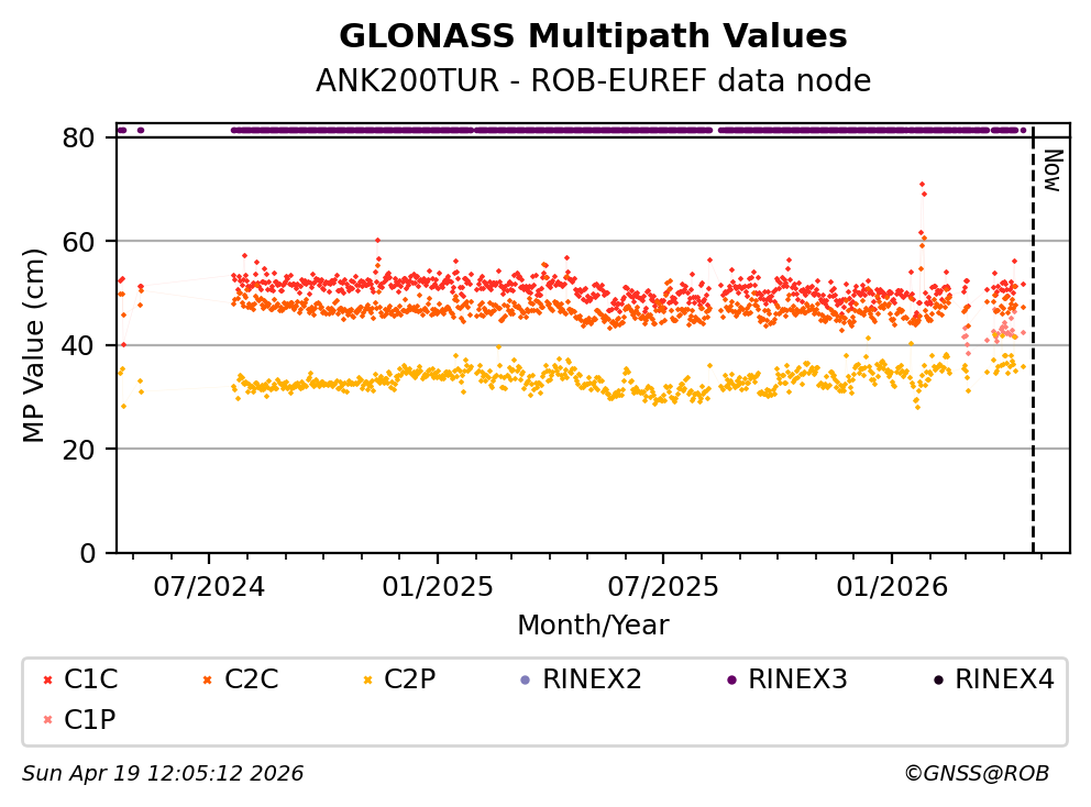 The plots below present the long-term tracking performance of the EPOS-GNSS station ANK200TUR based on the daily RINEX data available from the ROB-EUREF EPOS-GNSS data node. The data quality metrics have been computed at the data node using the G-Nut/Anubis software.