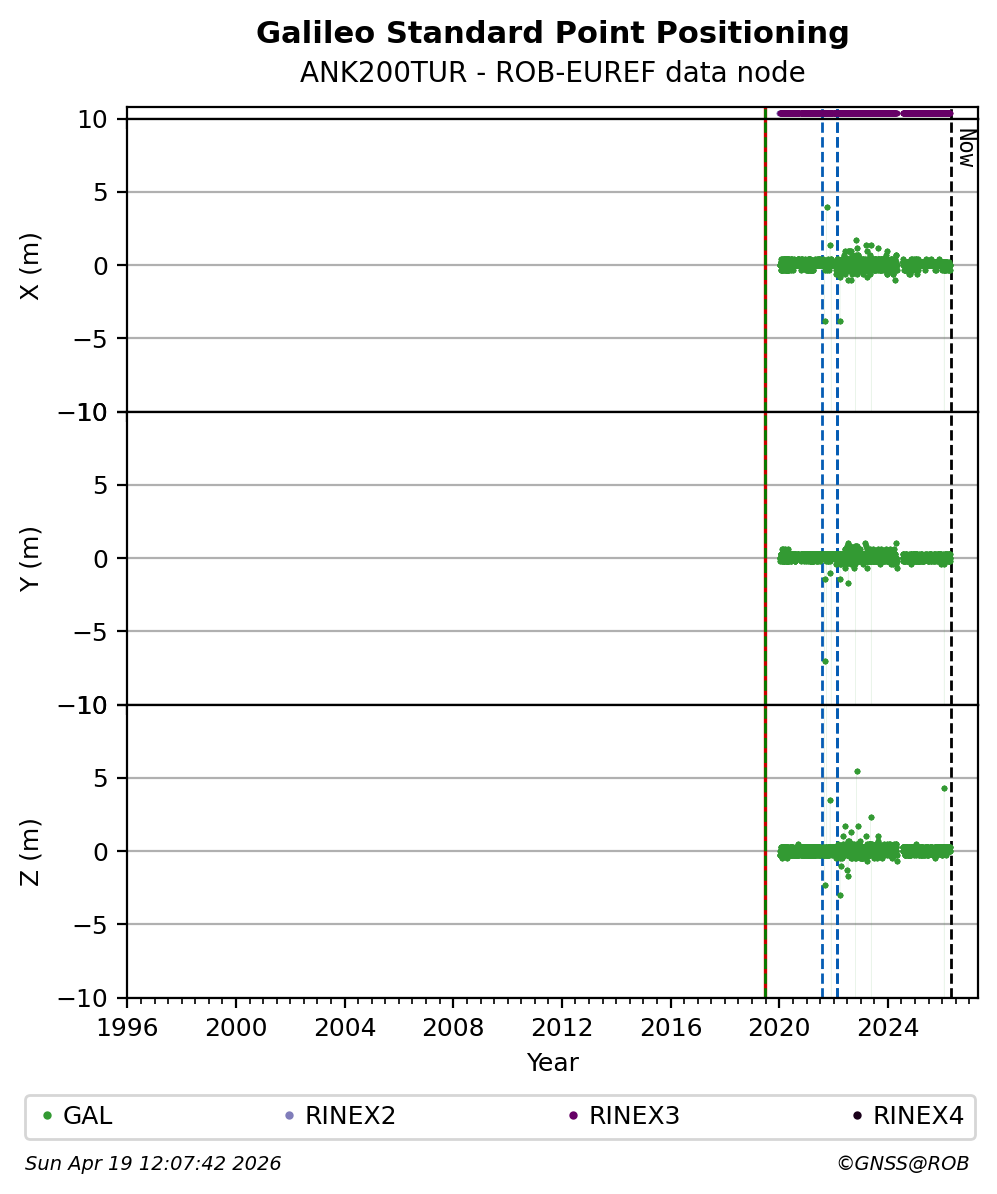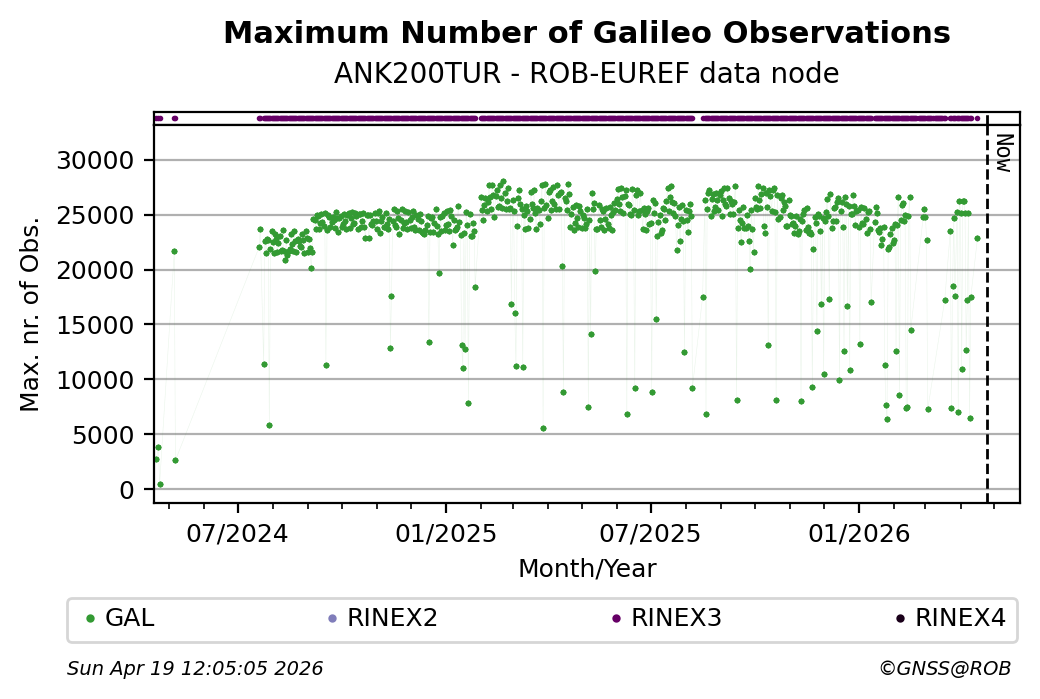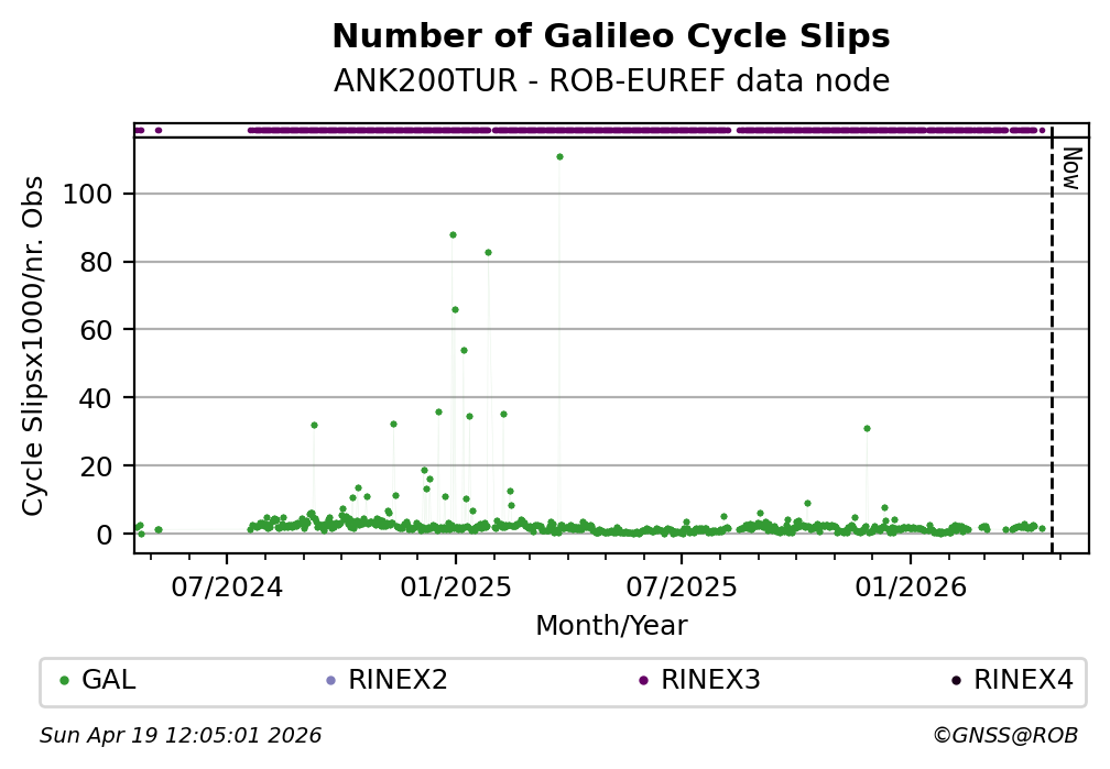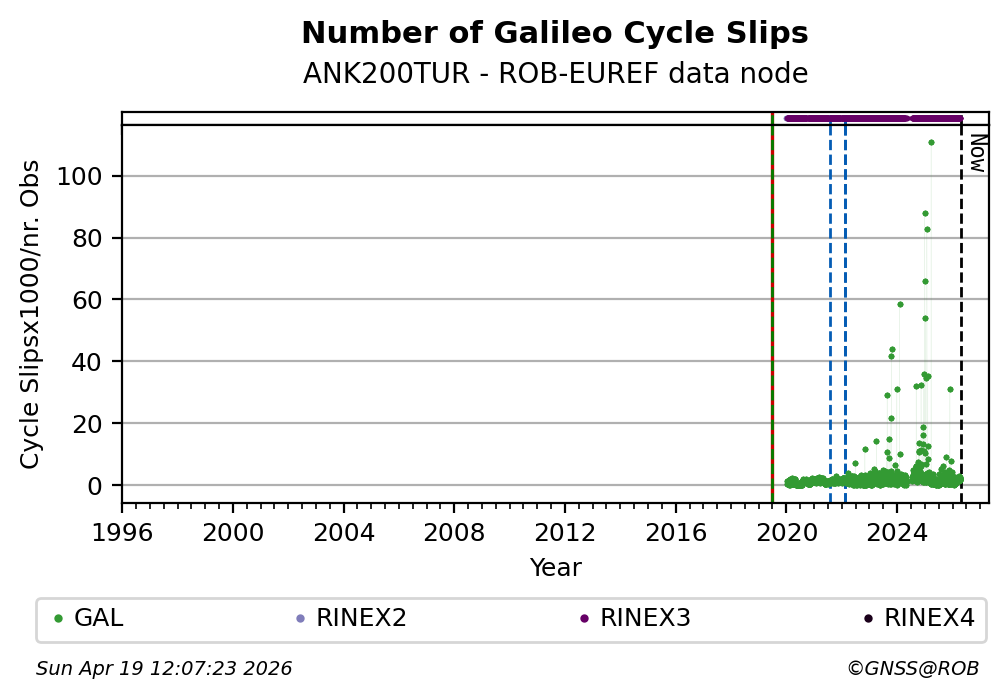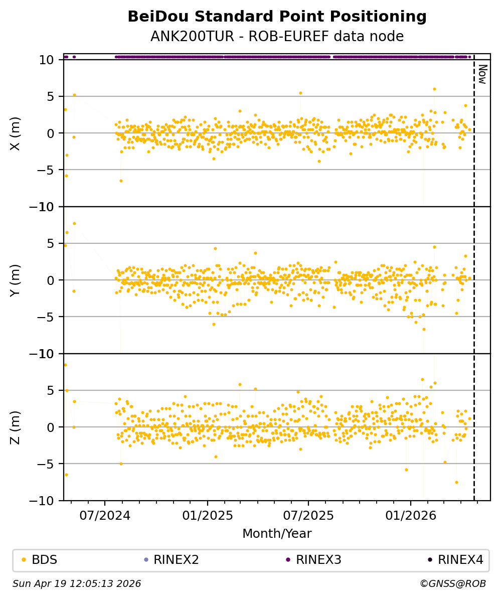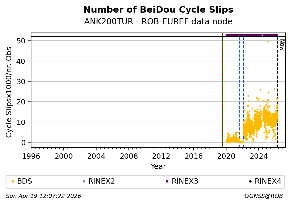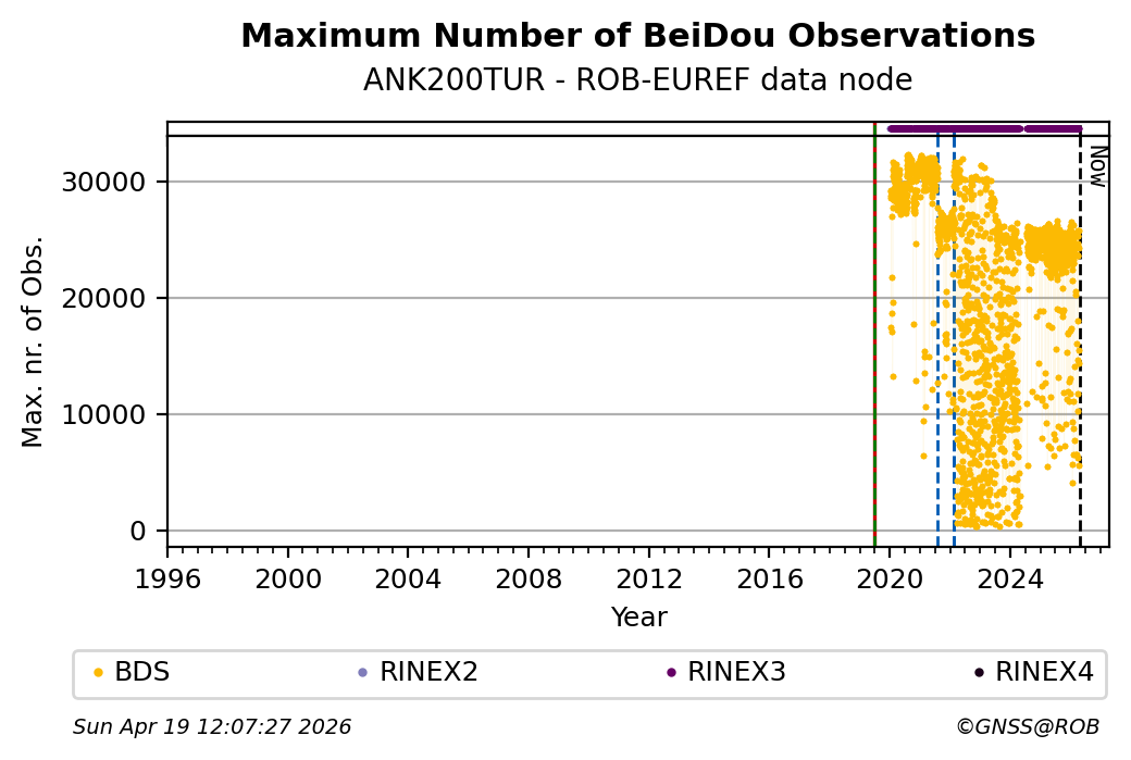 The plots below present the long-term tracking performance of the EPOS-GNSS station ANK200TUR based on the daily RINEX data available from the ROB-EUREF EPOS-GNSS data node. The data quality metrics have been computed at the data node using the G-Nut/Anubis software.