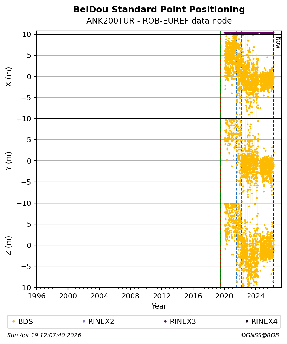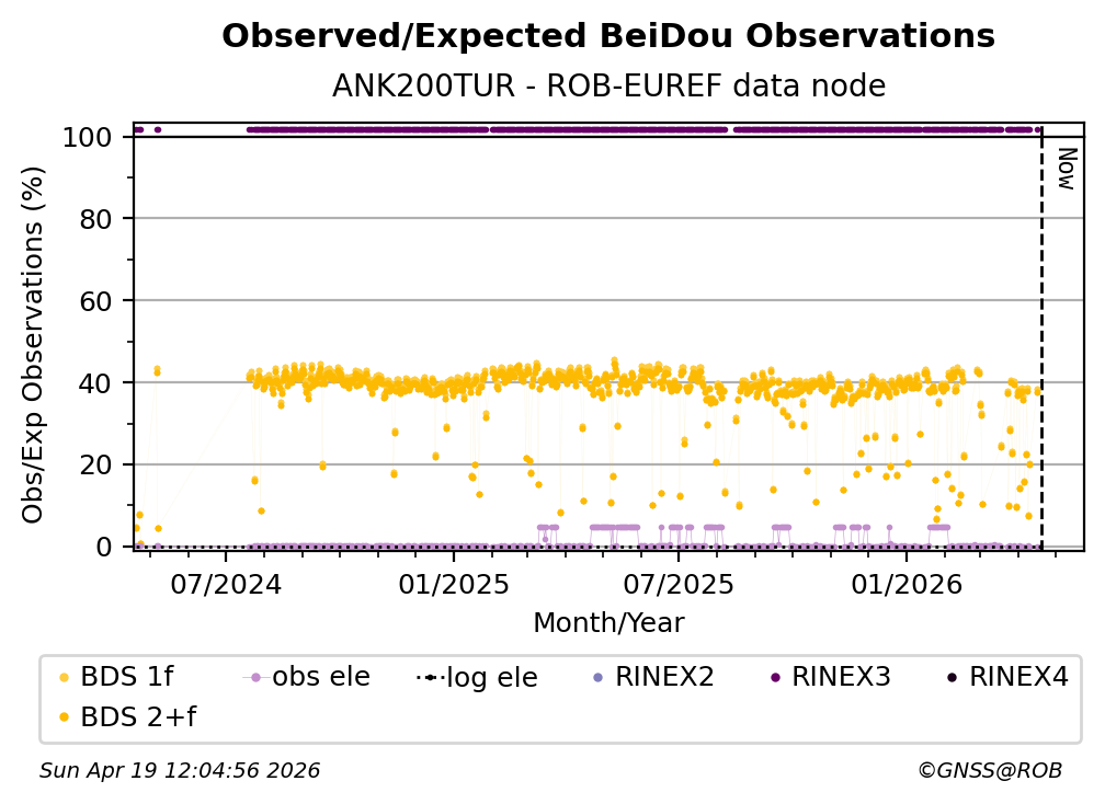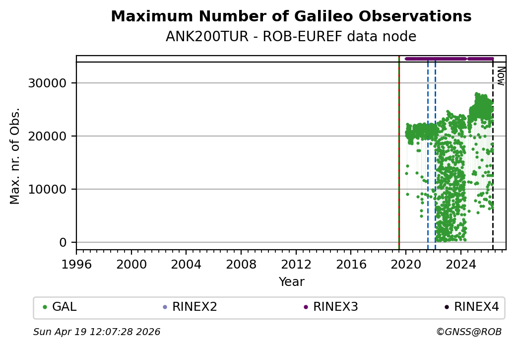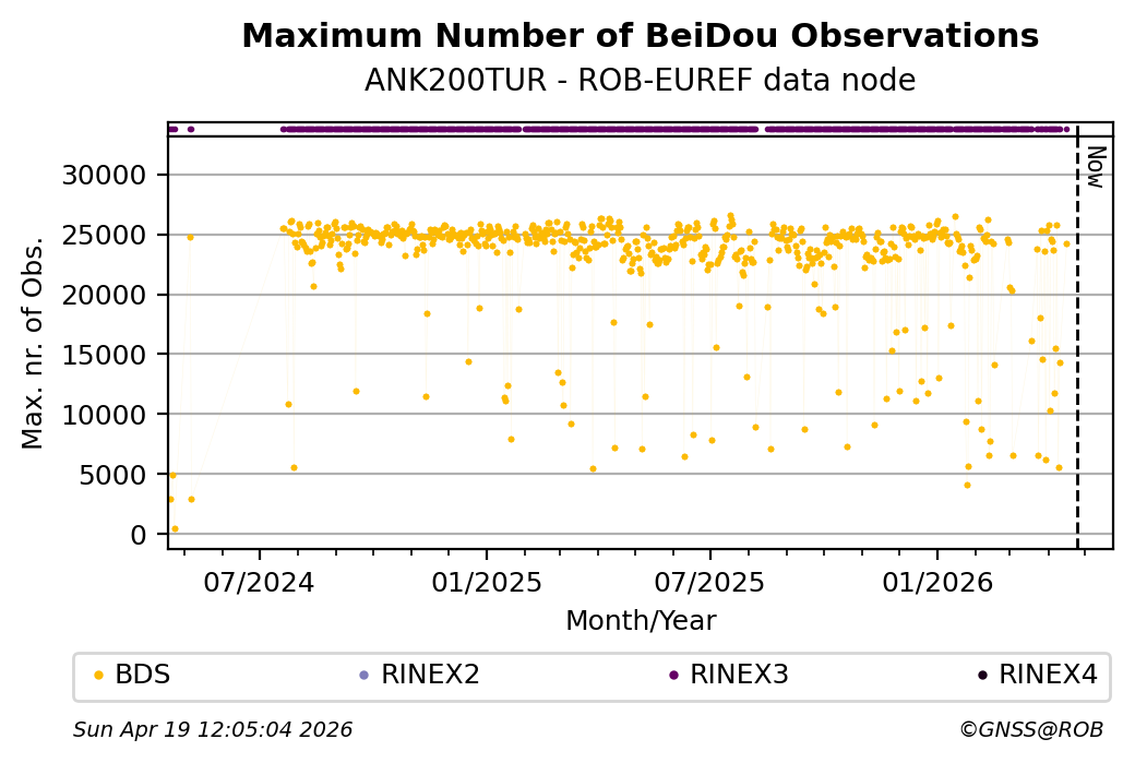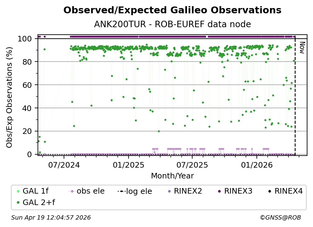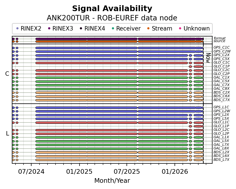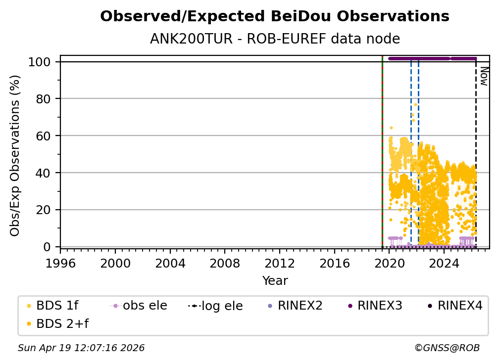 The plots below present the long-term tracking performance of the EPOS-GNSS station ANK200TUR based on the daily RINEX data available from the ROB-EUREF EPOS-GNSS data node. The data quality metrics have been computed at the data node using the G-Nut/Anubis software.