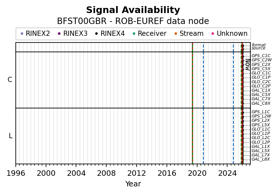 Red vertical lines, green and blue vertical dotted lines indicate respectively a change of antenna, receiver or receiver configuration (including firmware) as indicated by the station manager in the station site log available from the M3G GNSS Metadata Catalog. The purple points in the top of the plot indicate the daily RINEX data availability at the data node.