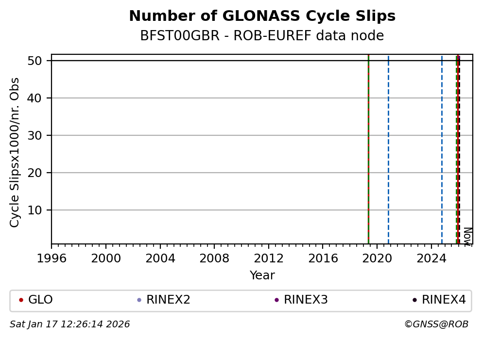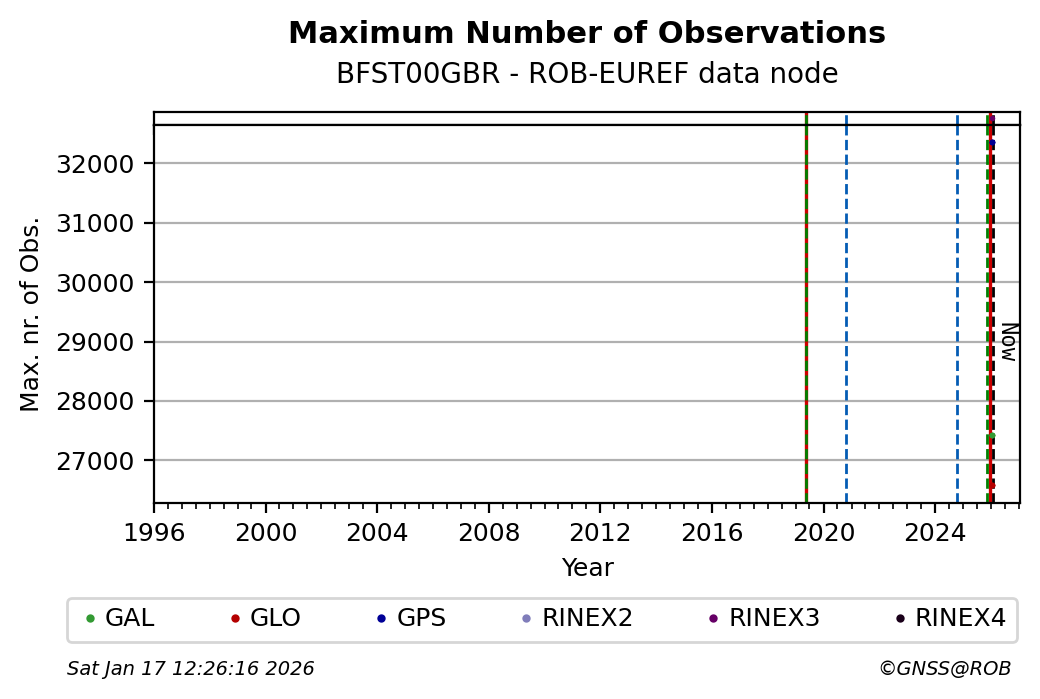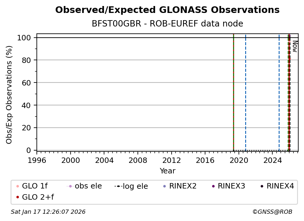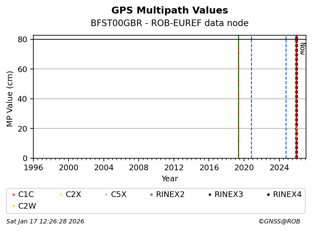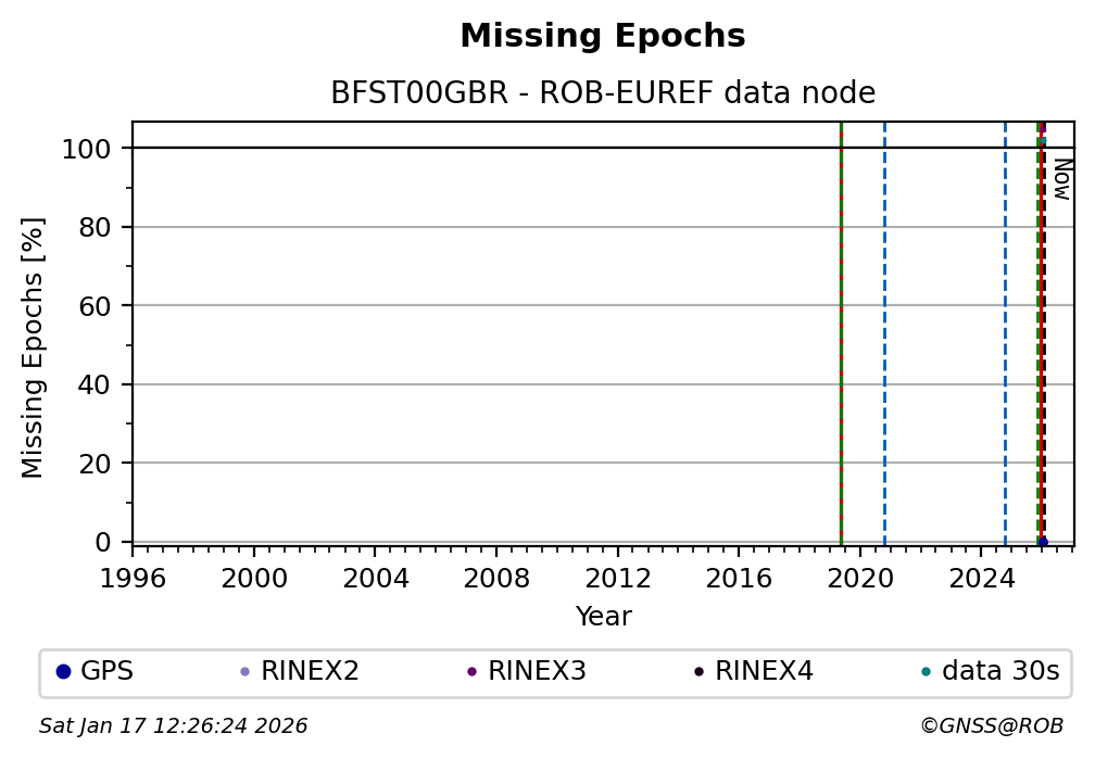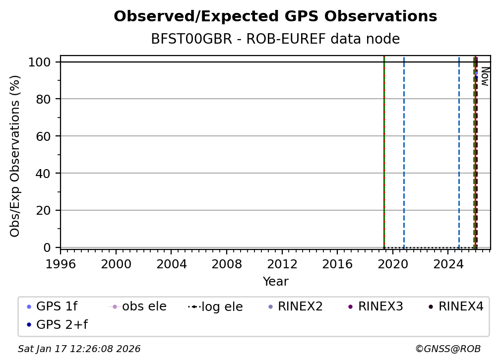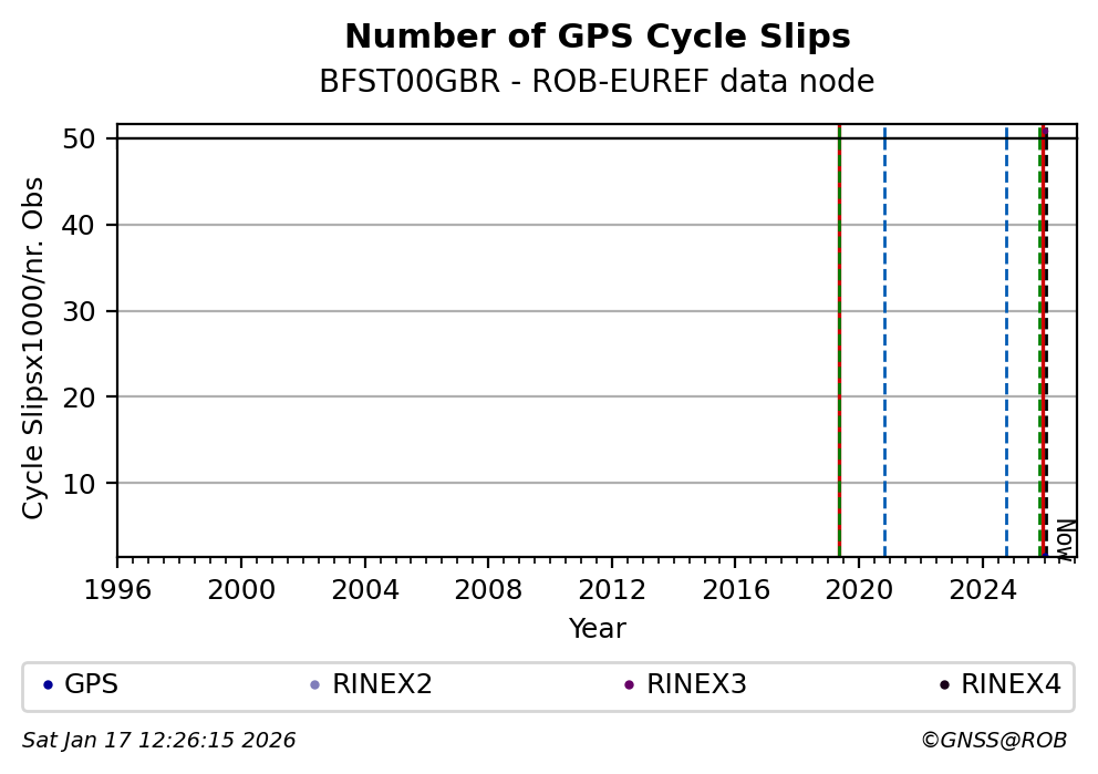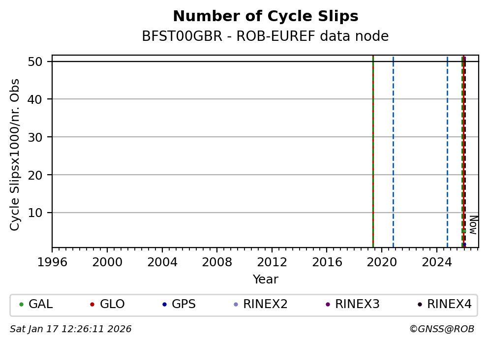 The plots below present the long-term tracking performance of the EPOS-GNSS station BFST00GBR based on the daily RINEX data available from the ROB-EUREF EPOS-GNSS data node. The data quality metrics have been computed at the data node using the G-Nut/Anubis software.