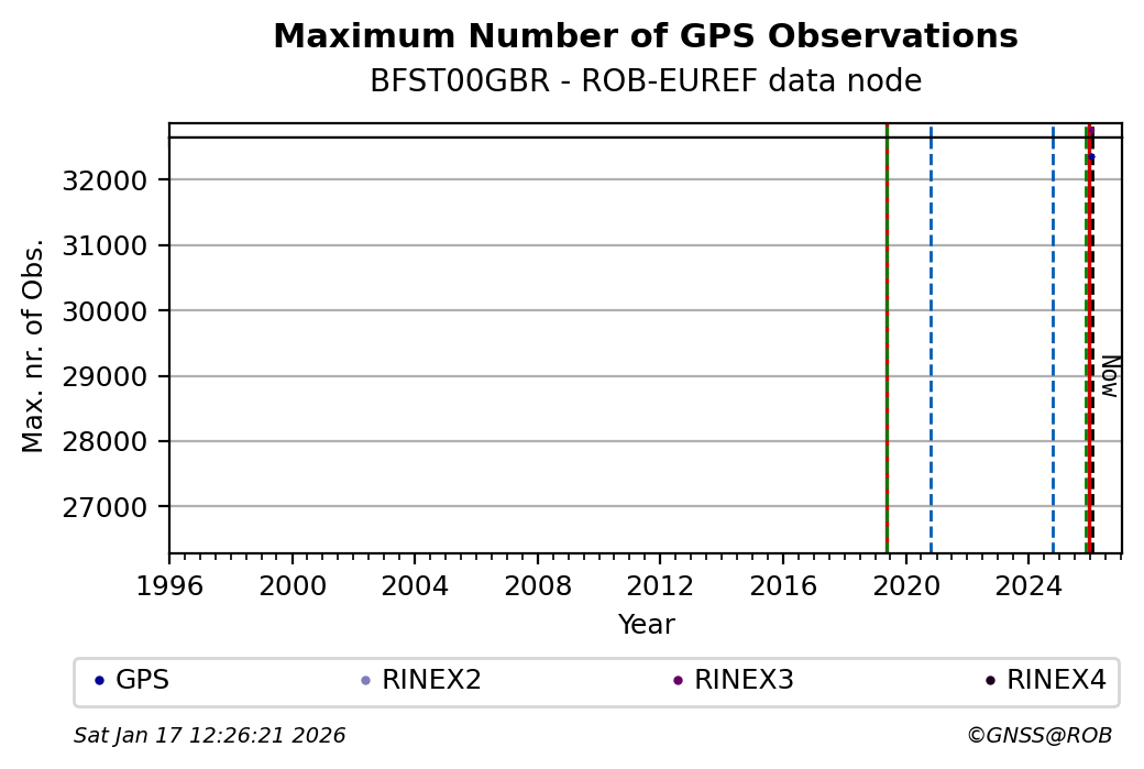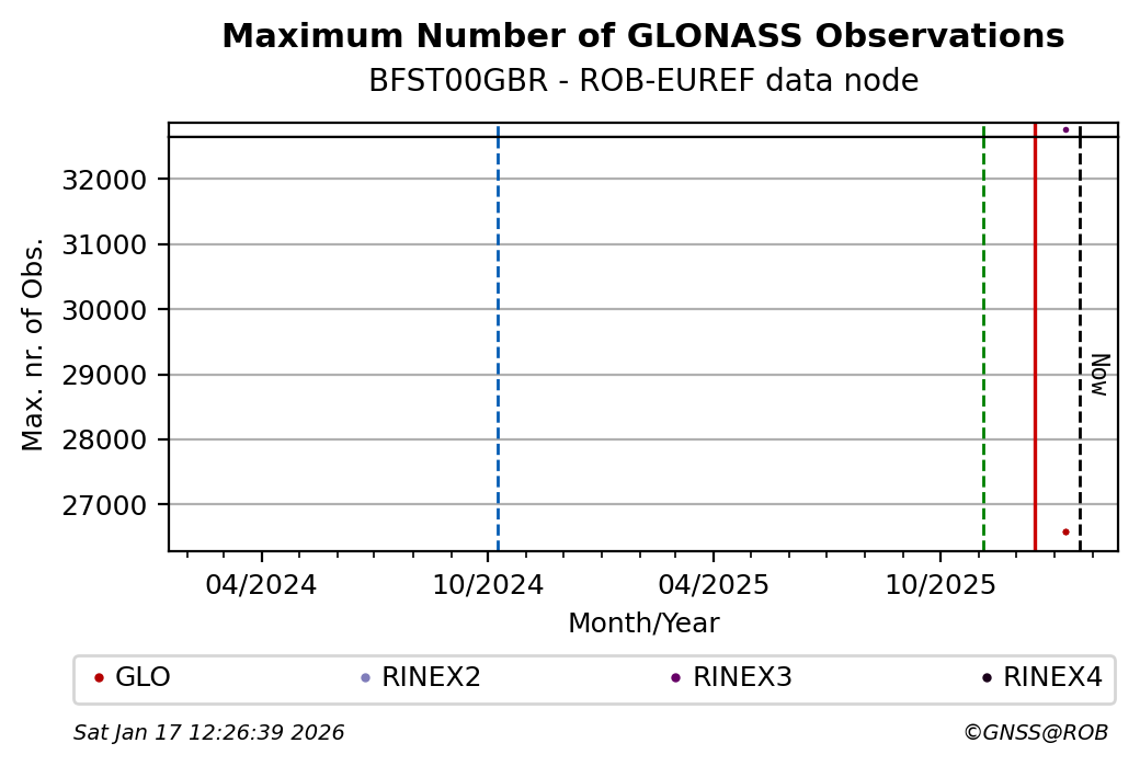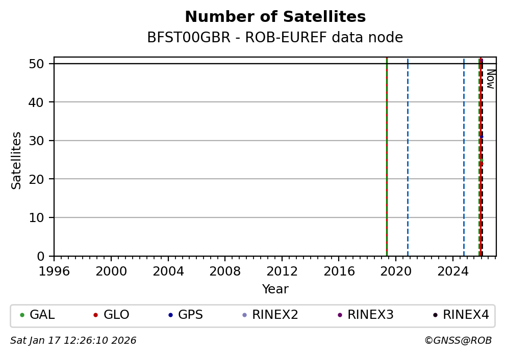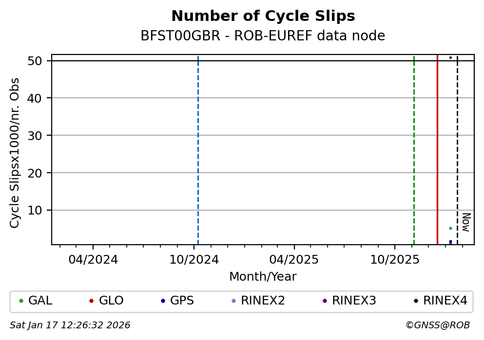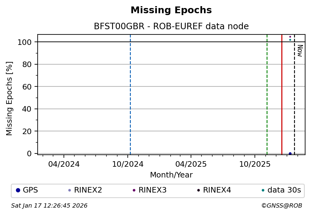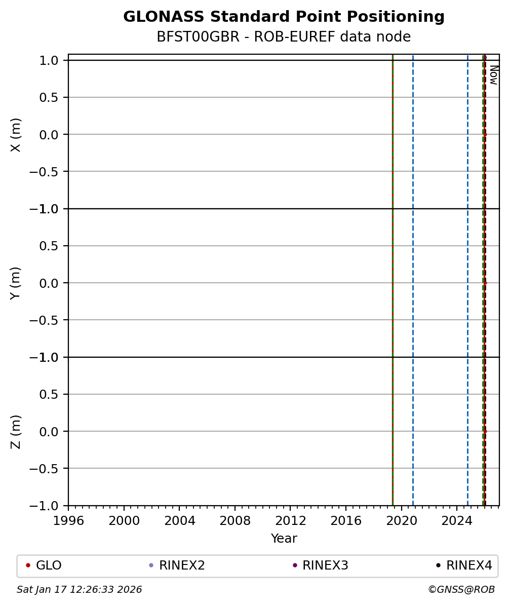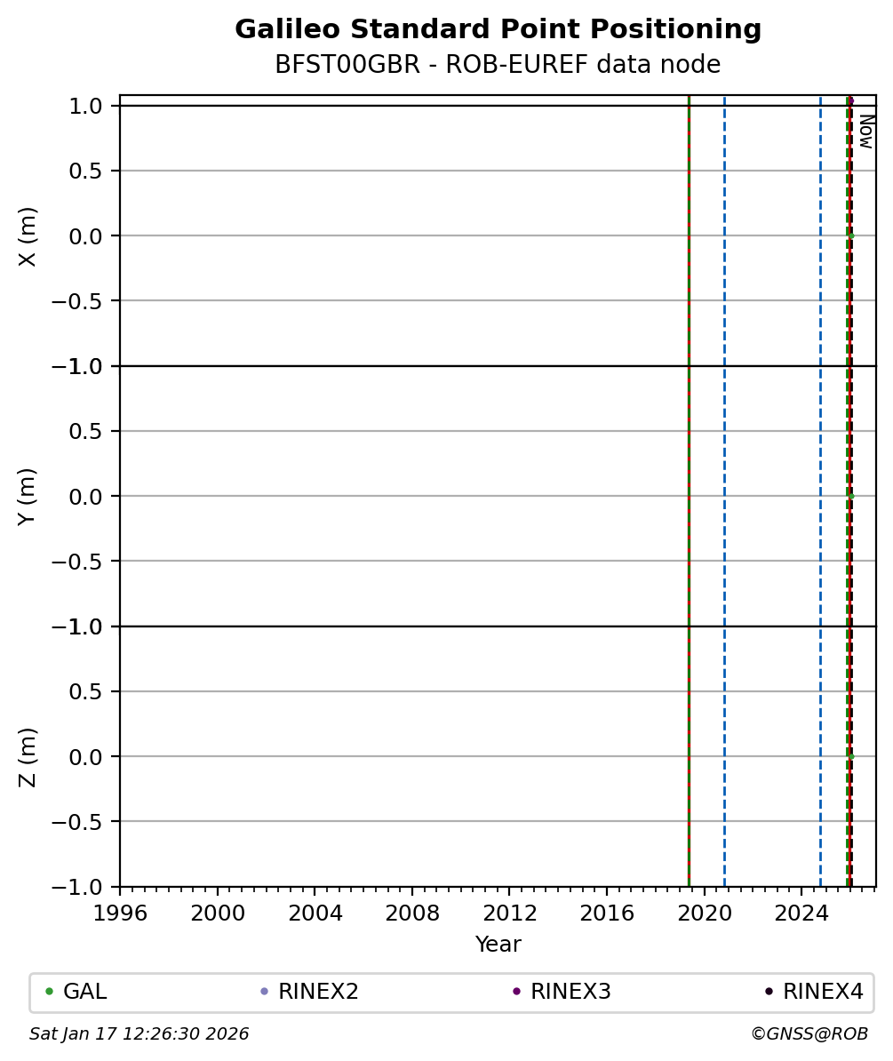 The plots below present the long-term tracking performance of the EPOS-GNSS station BFST00GBR based on the daily RINEX data available from the ROB-EUREF EPOS-GNSS data node. The data quality metrics have been computed at the data node using the G-Nut/Anubis software.