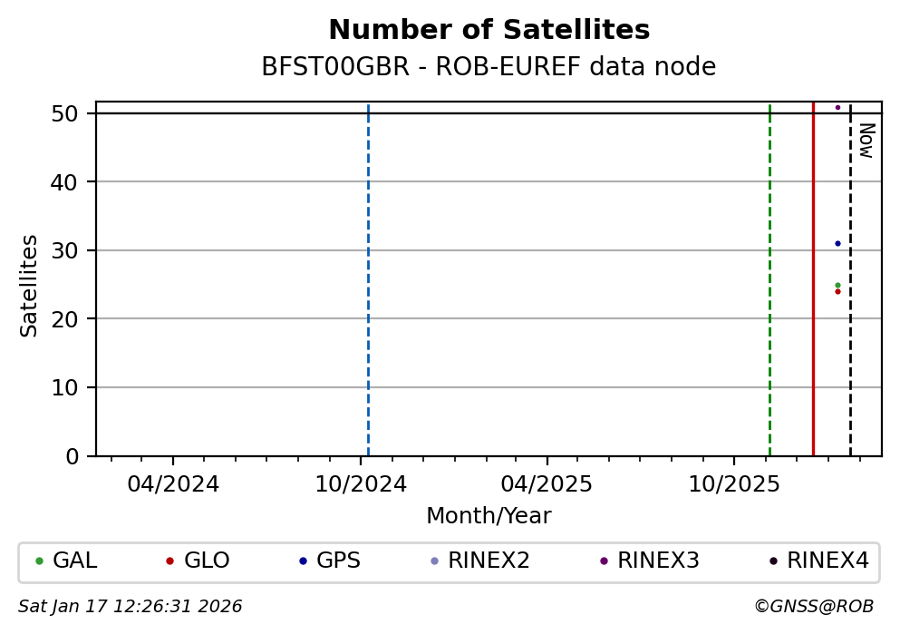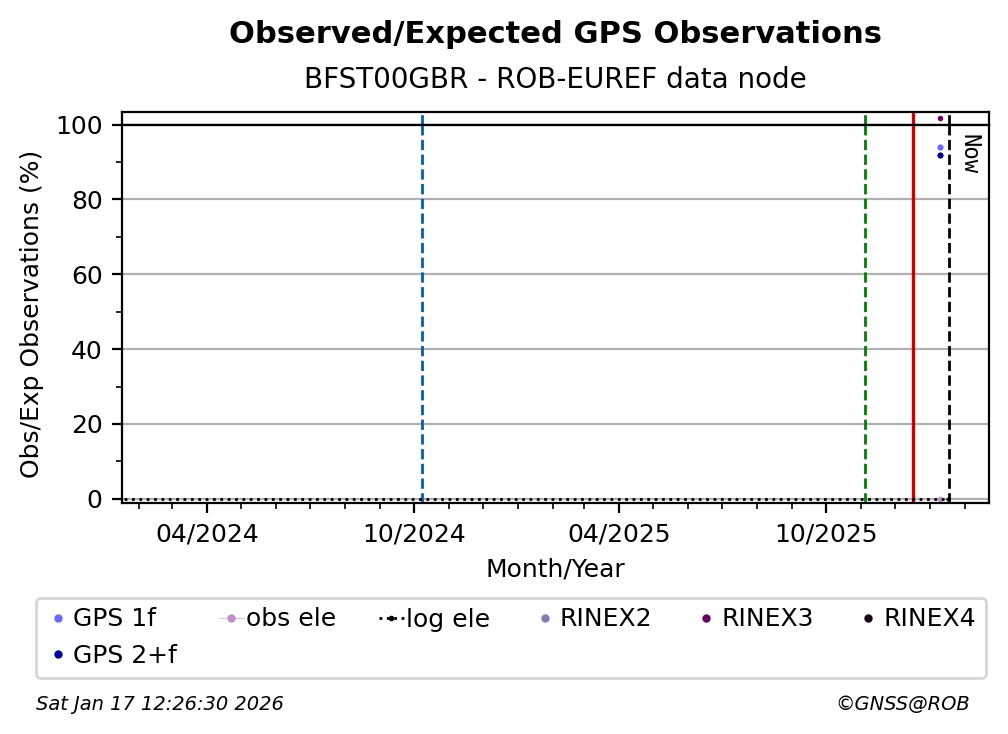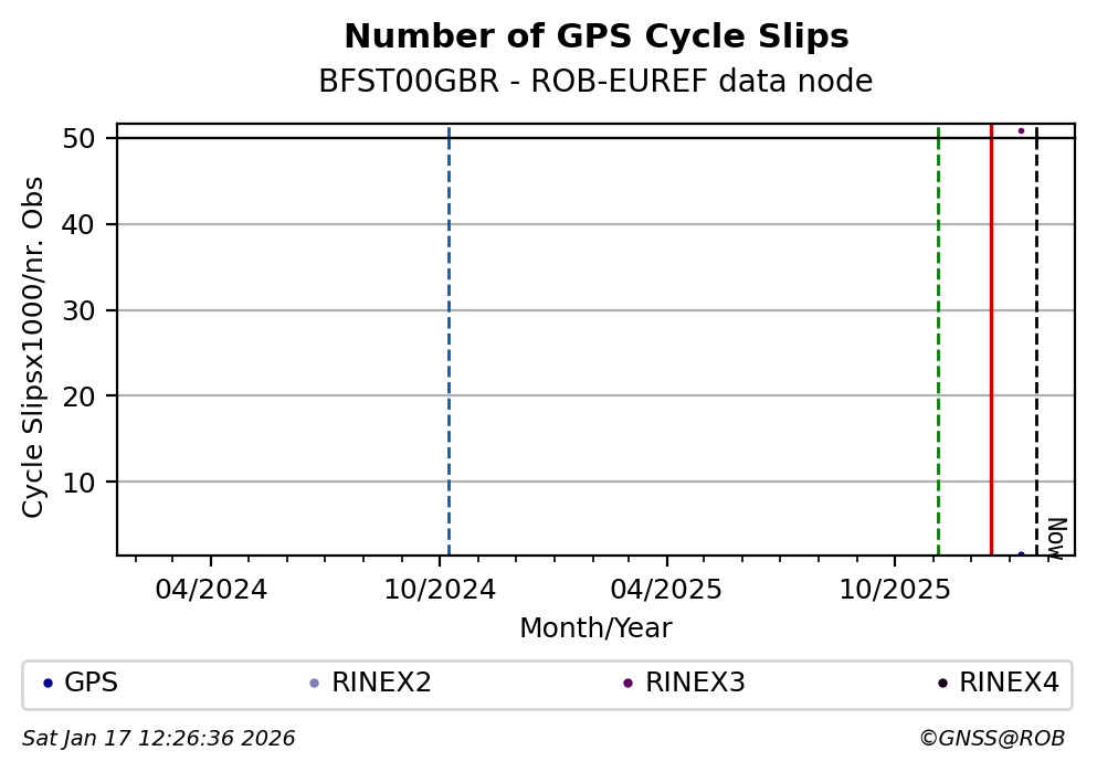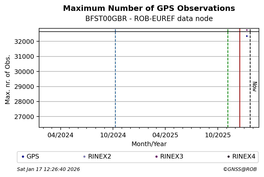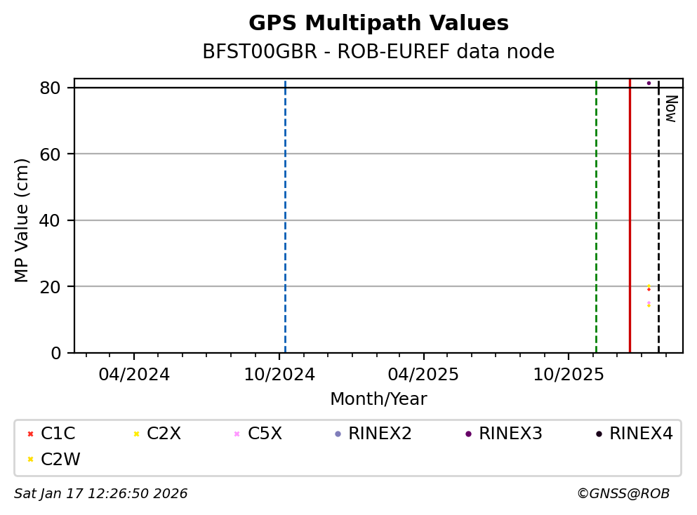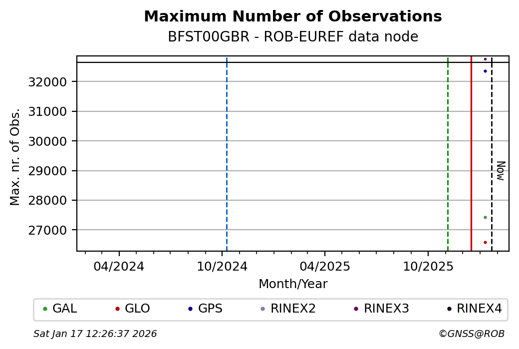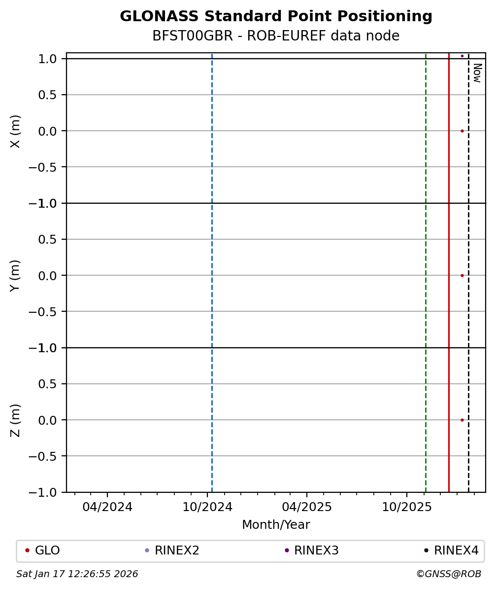 The plots below present the long-term tracking performance of the EPOS-GNSS station BFST00GBR based on the daily RINEX data available from the ROB-EUREF EPOS-GNSS data node. The data quality metrics have been computed at the data node using the G-Nut/Anubis software.