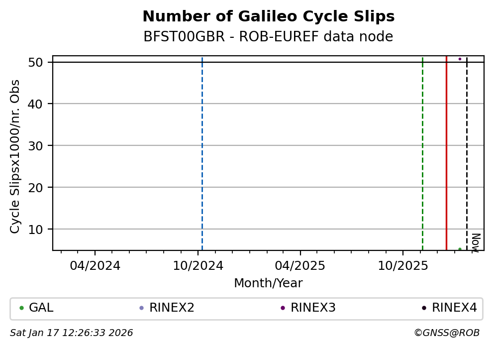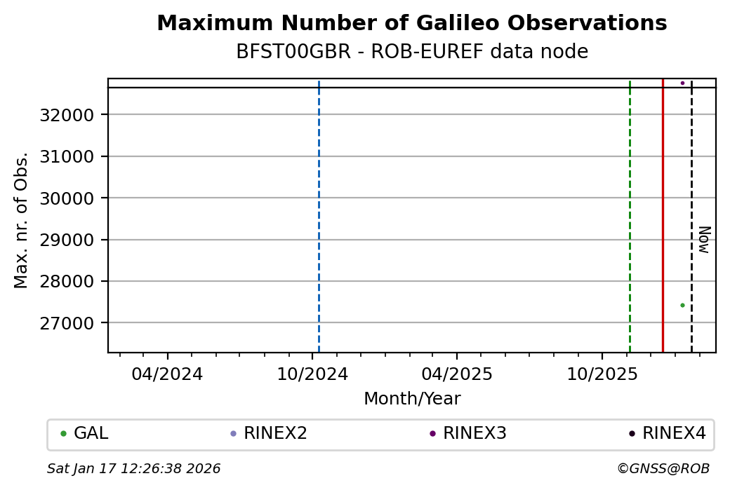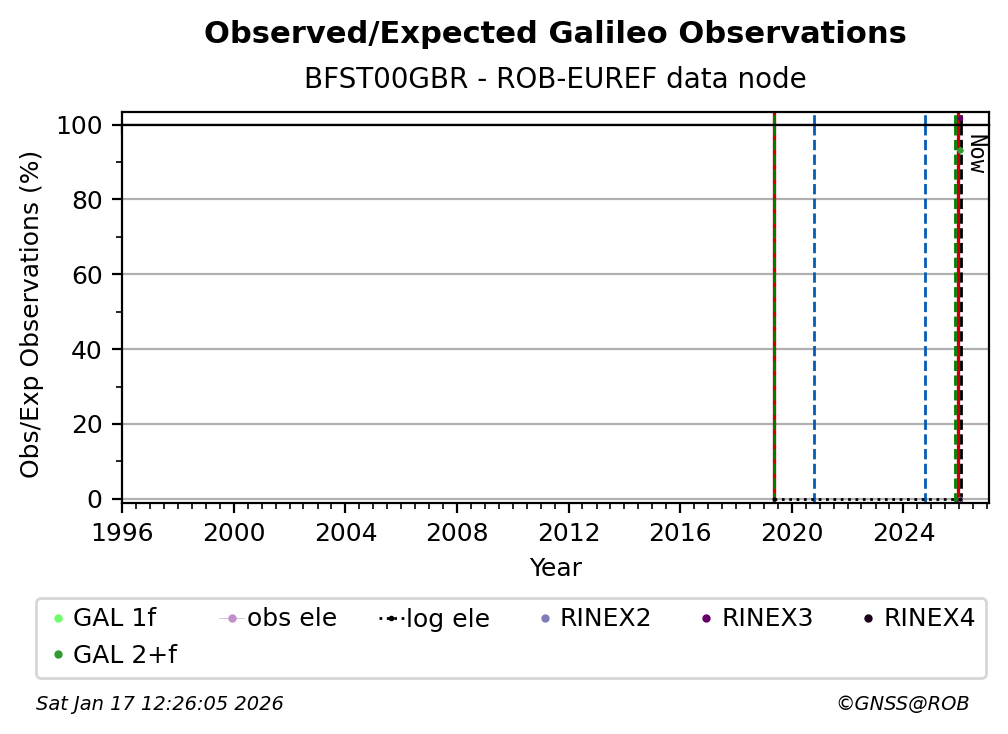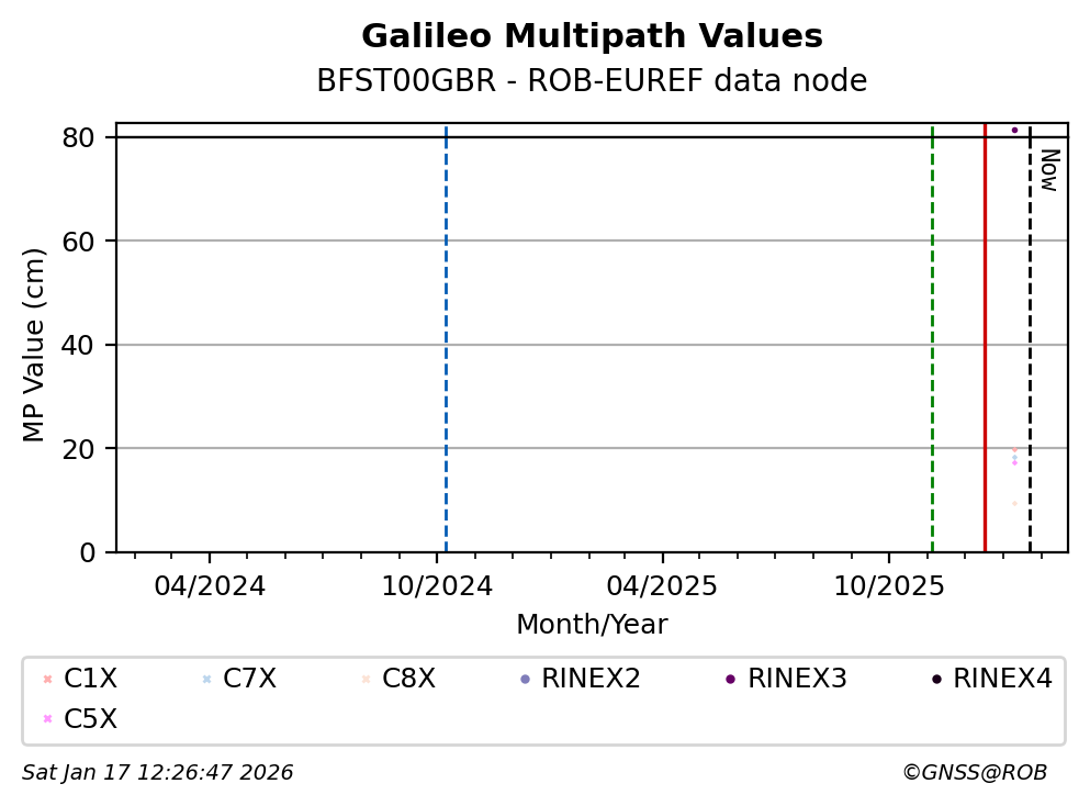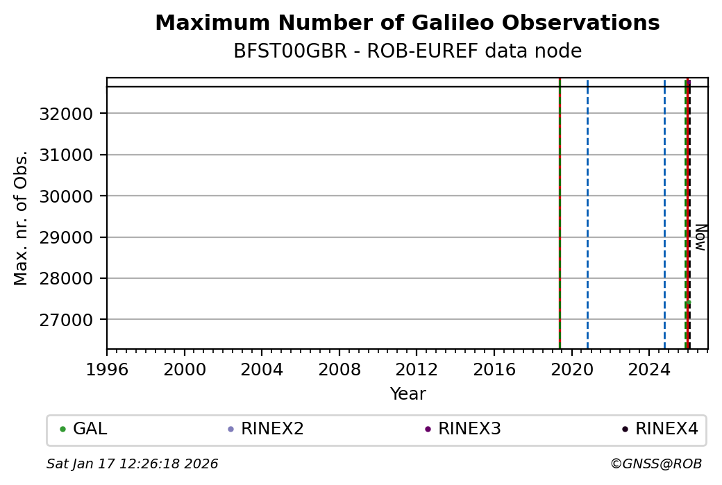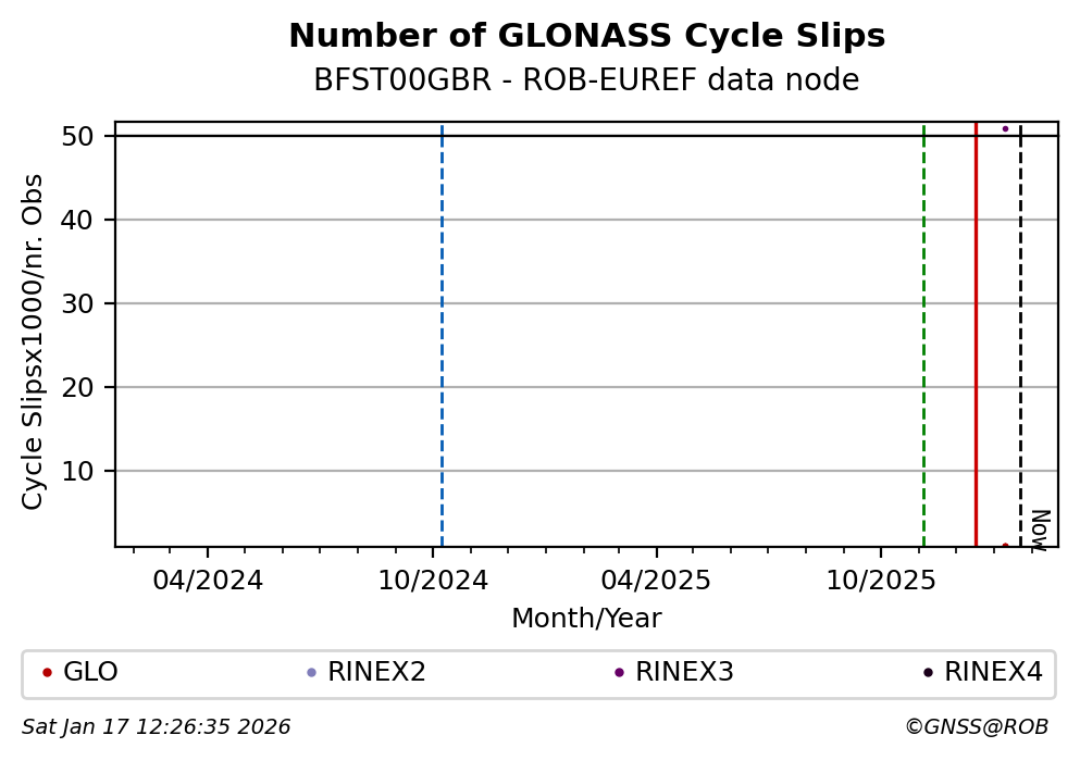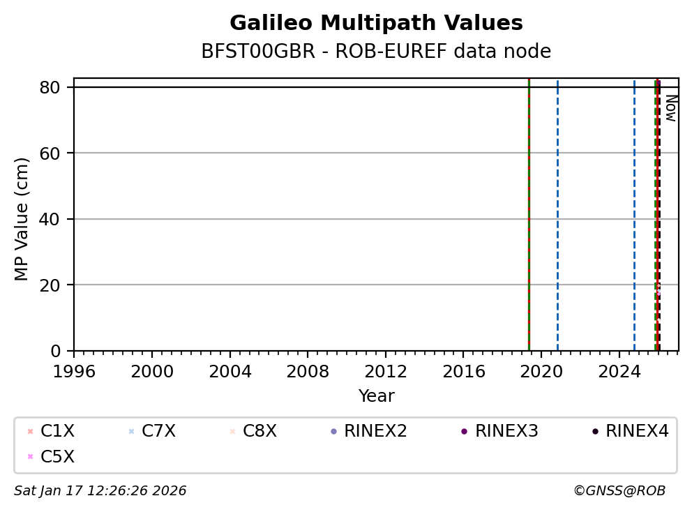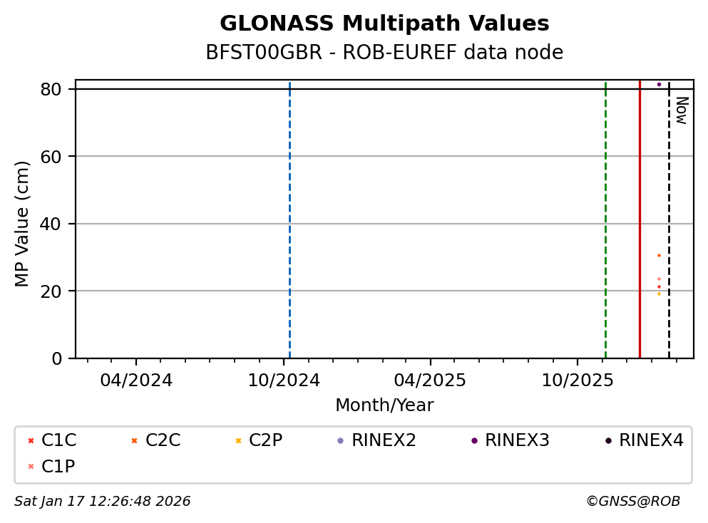 The plots below present the long-term tracking performance of the EPOS-GNSS station BFST00GBR based on the daily RINEX data available from the ROB-EUREF EPOS-GNSS data node. The data quality metrics have been computed at the data node using the G-Nut/Anubis software.
