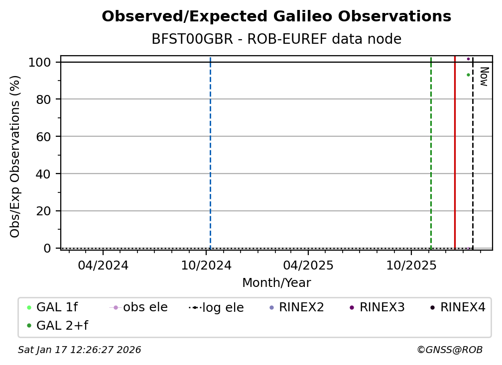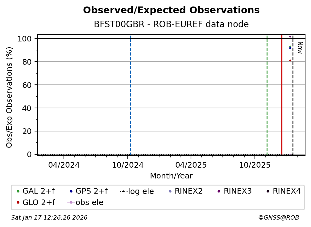 The percentage corresponds, for each constellation tracked by the station, to the ratio of the number of observations in the daily RINEX file with respect to the number of expected observations: