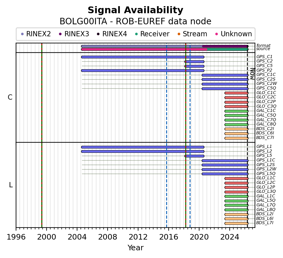Red vertical lines, green and blue vertical dotted lines indicate respectively a change of antenna, receiver or receiver configuration (including firmware) as indicated by the station manager in the station site log available from the M3G GNSS Metadata Catalog. The purple points in the top of the plot indicate the daily RINEX data availability at the data node.