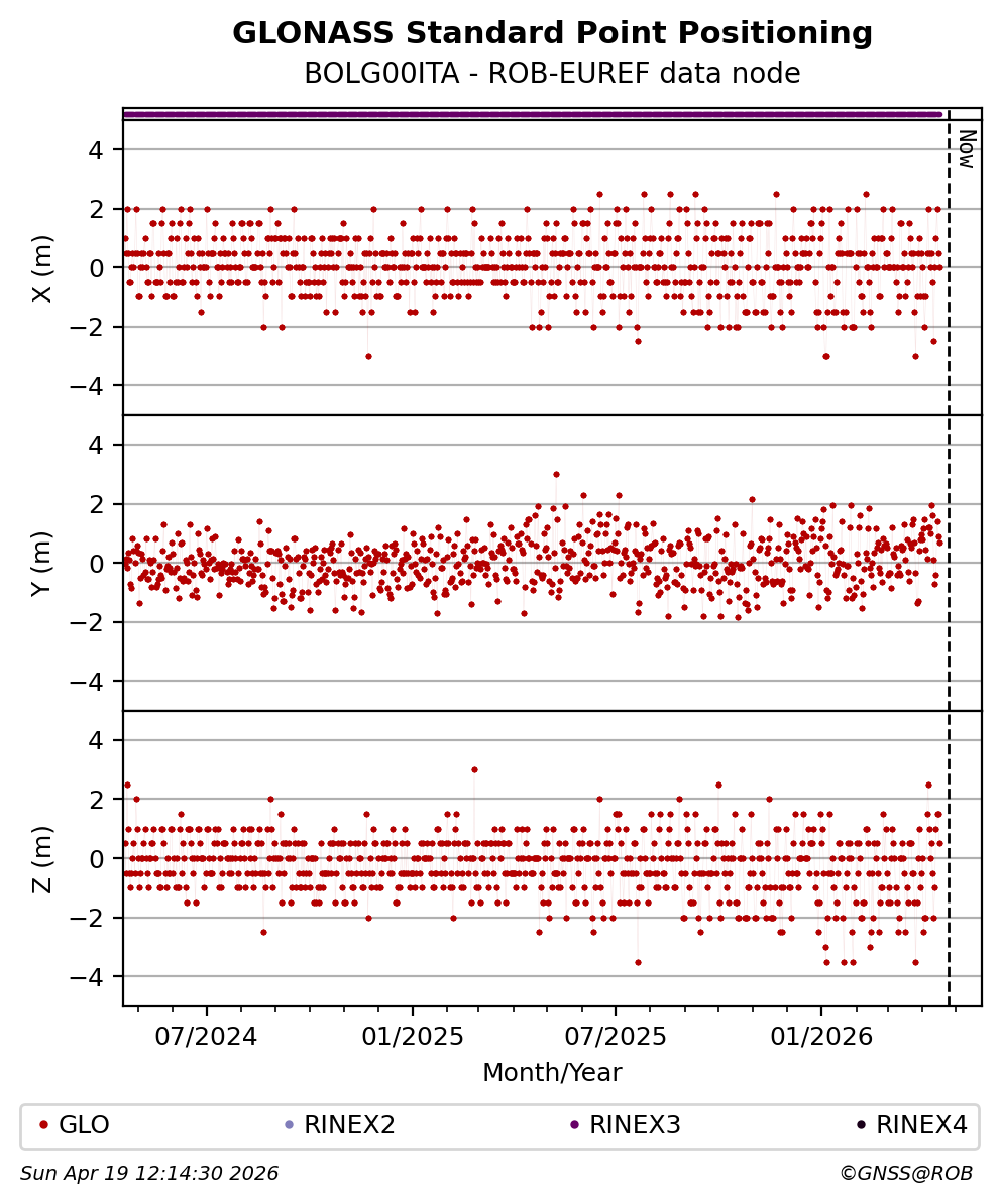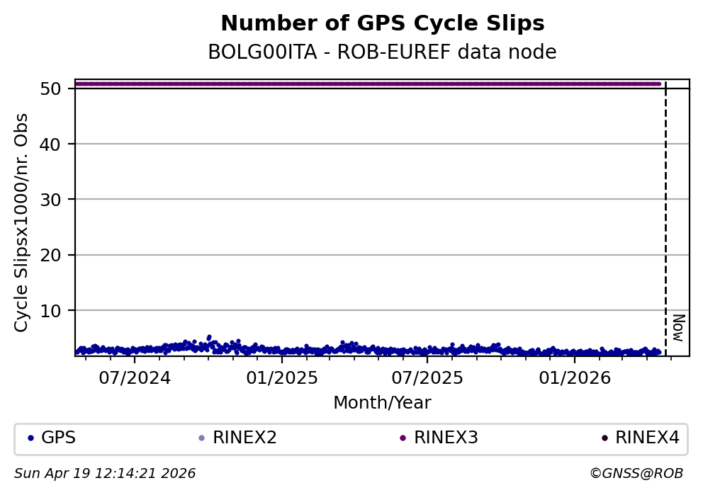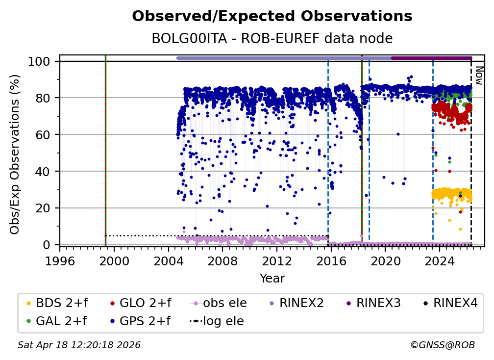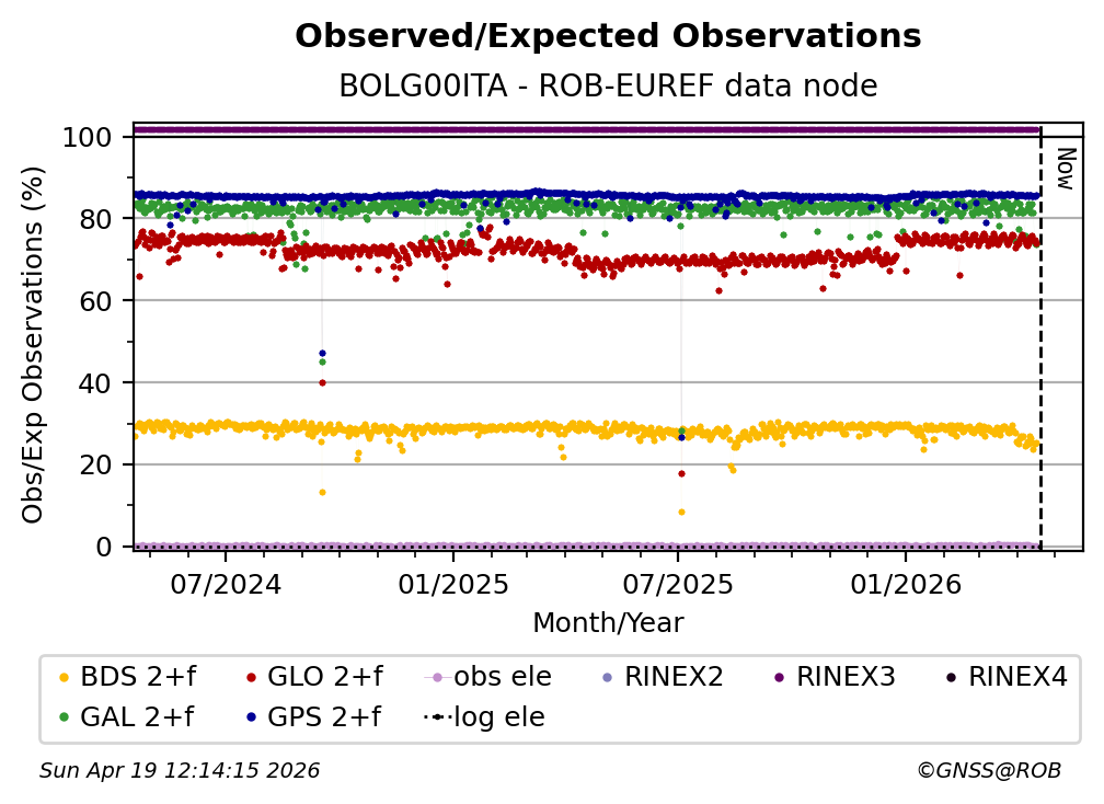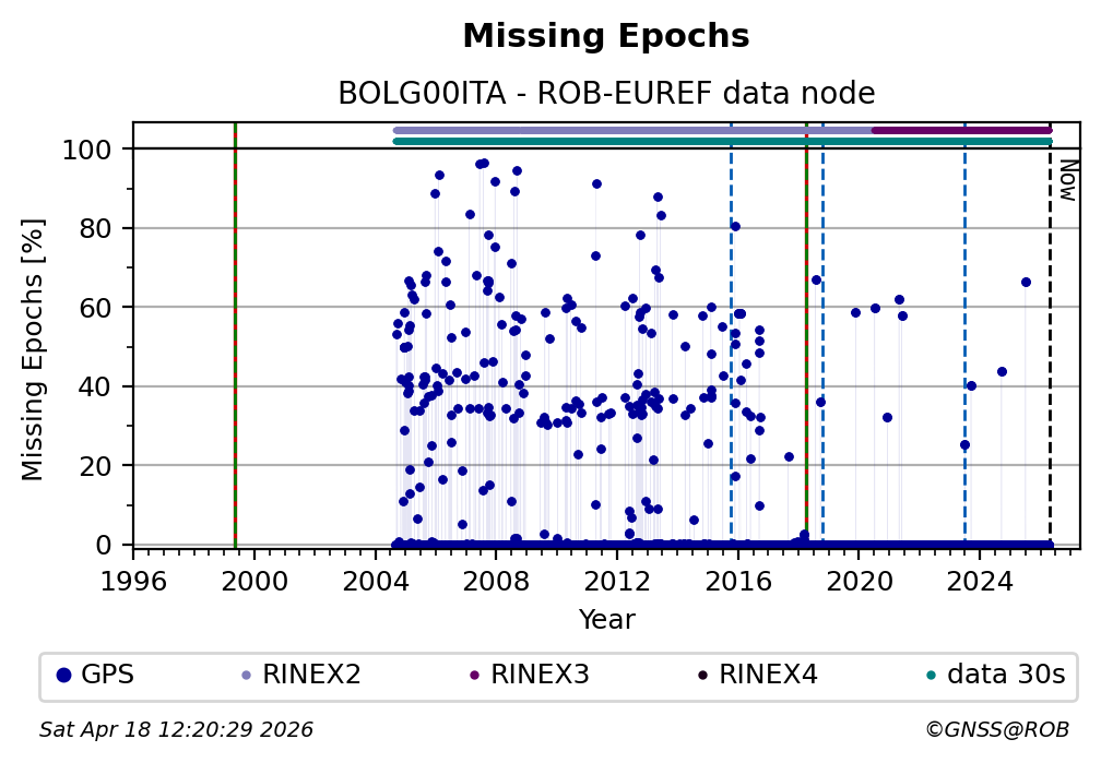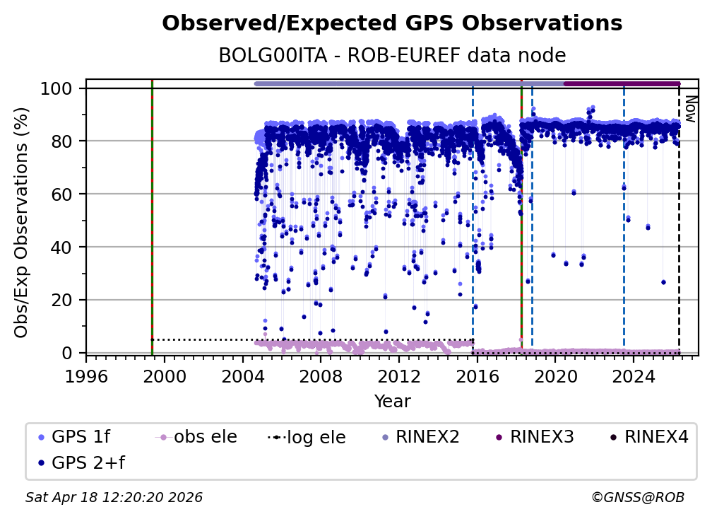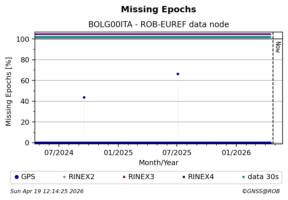 The plots below present the long-term tracking performance of the EPOS-GNSS station BOLG00ITA based on the daily RINEX data available from the ROB-EUREF EPOS-GNSS data node. The data quality metrics have been computed at the data node using the G-Nut/Anubis software.