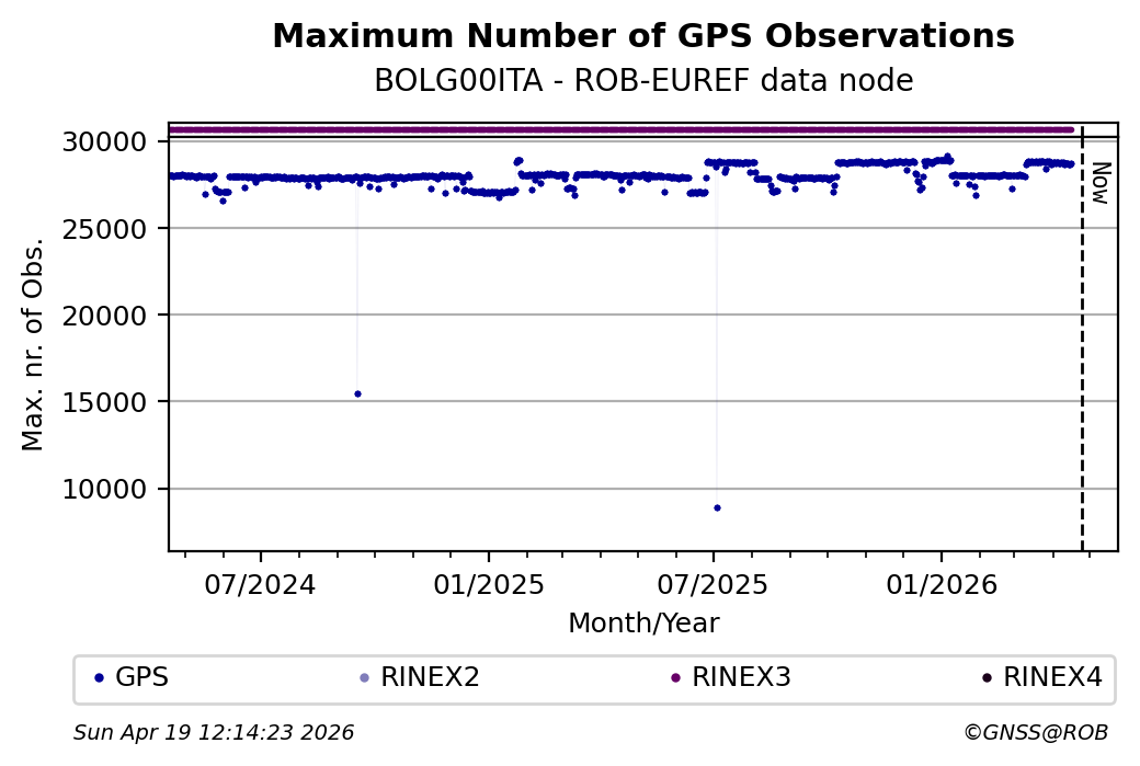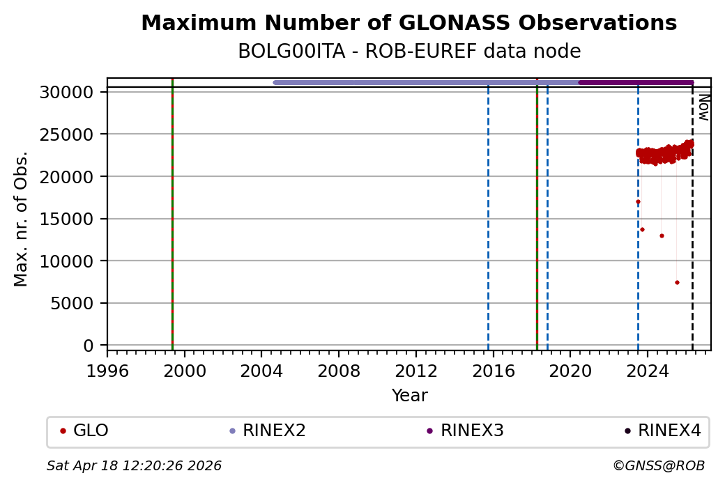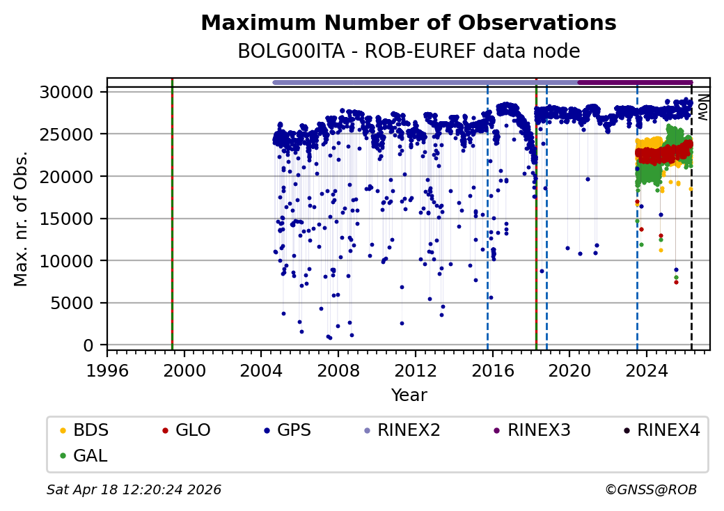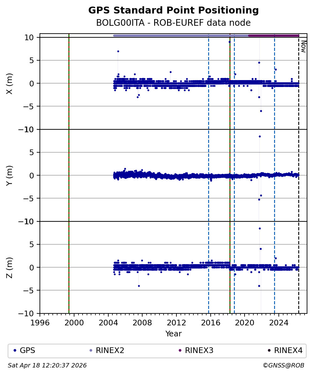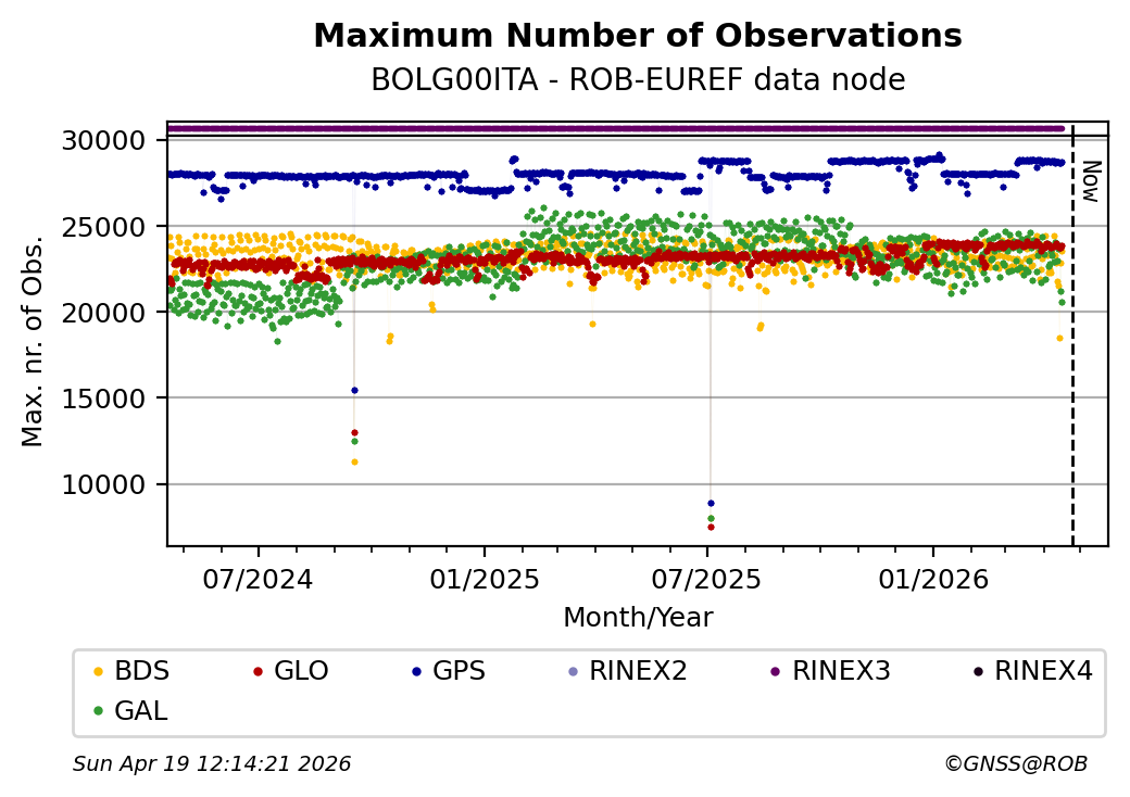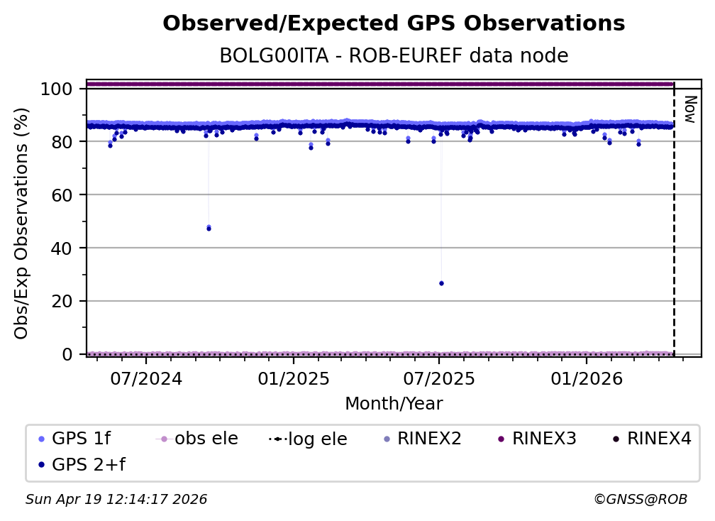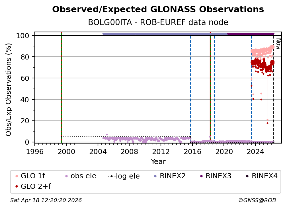 The plots below present the long-term tracking performance of the EPOS-GNSS station BOLG00ITA based on the daily RINEX data available from the ROB-EUREF EPOS-GNSS data node. The data quality metrics have been computed at the data node using the G-Nut/Anubis software.