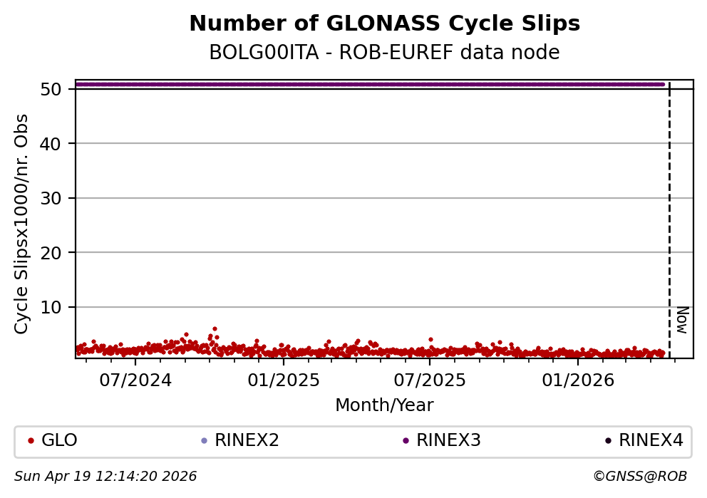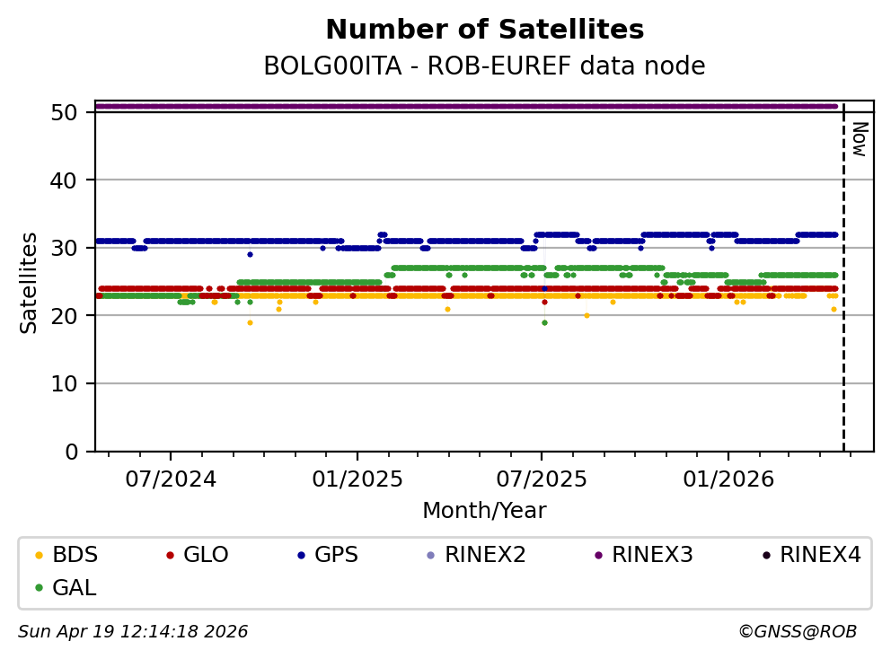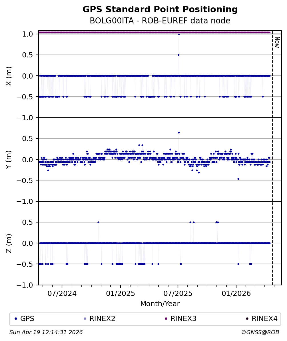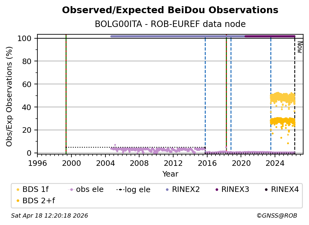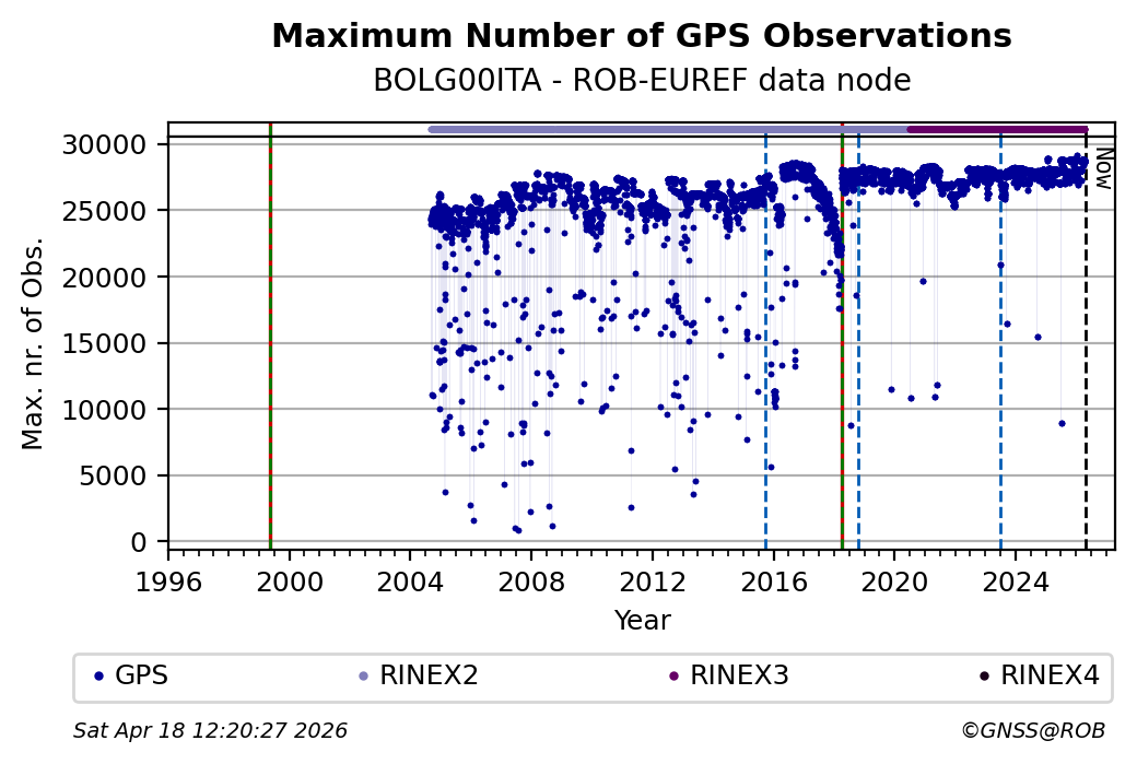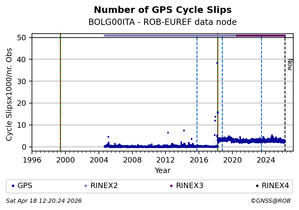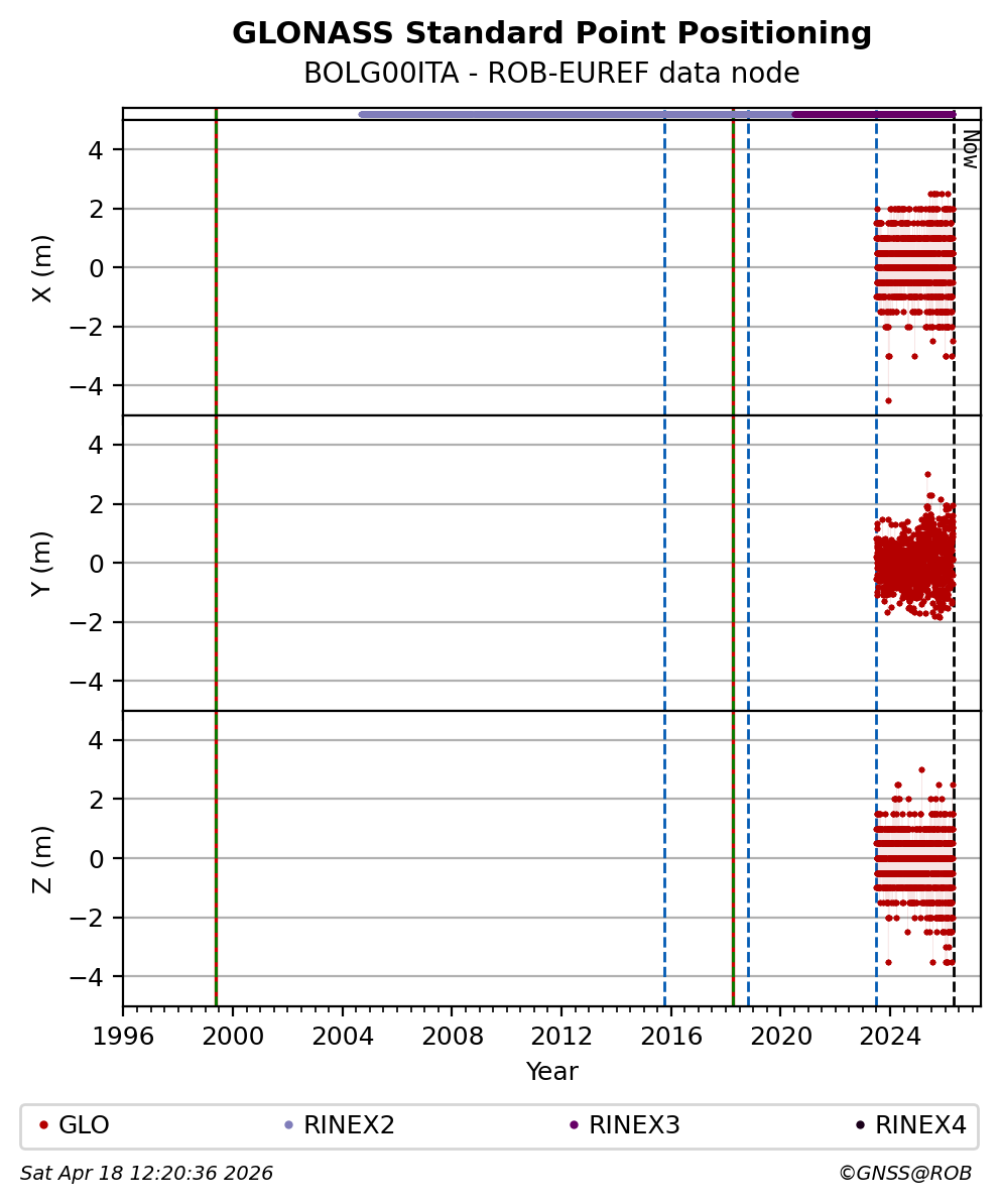The plots below present the long-term tracking performance of the EPOS-GNSS station BOLG00ITA based on the daily RINEX data available from the ROB-EUREF EPOS-GNSS data node. The data quality metrics have been computed at the data node using the G-Nut/Anubis software.