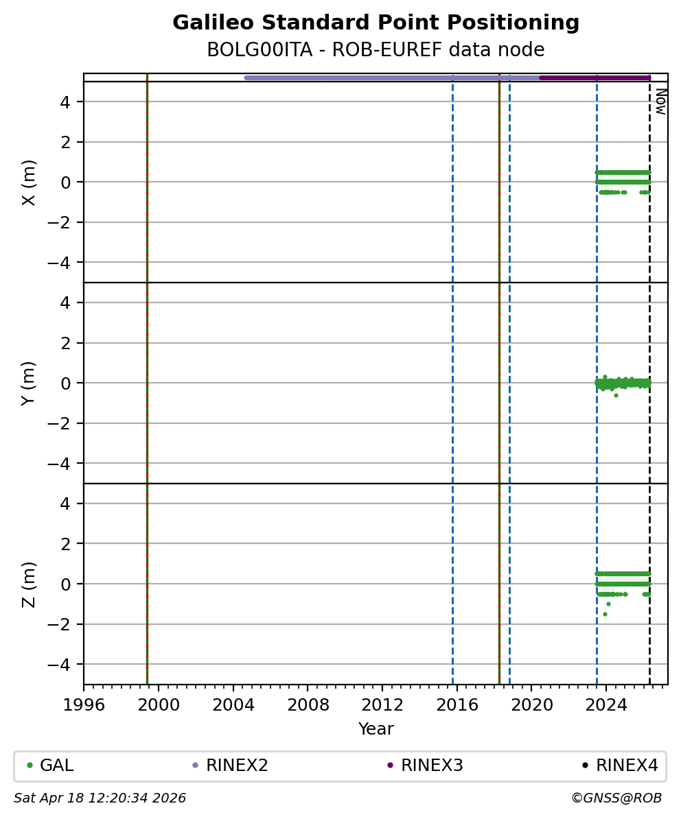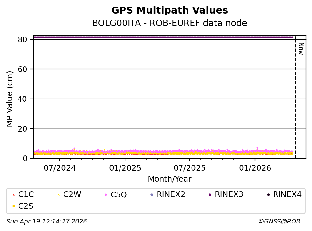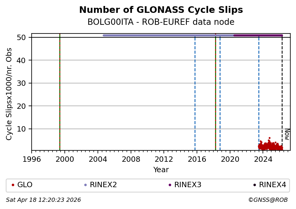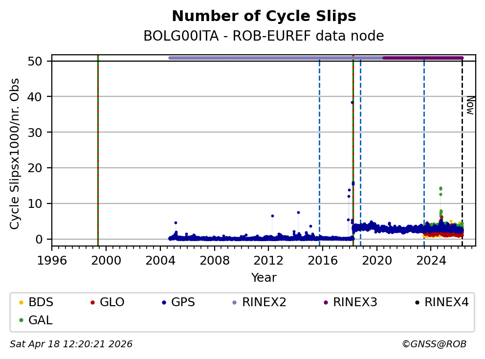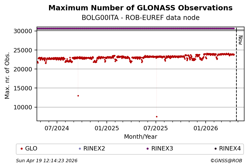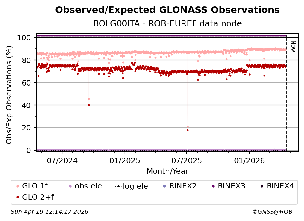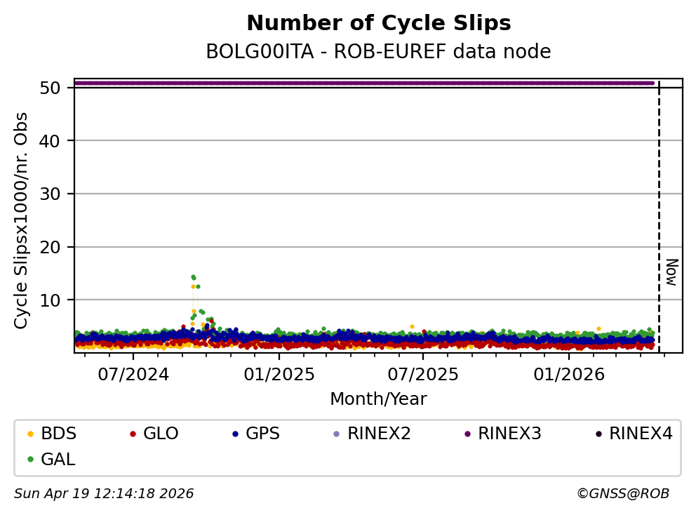 The plots below present the long-term tracking performance of the EPOS-GNSS station BOLG00ITA based on the daily RINEX data available from the ROB-EUREF EPOS-GNSS data node. The data quality metrics have been computed at the data node using the G-Nut/Anubis software.