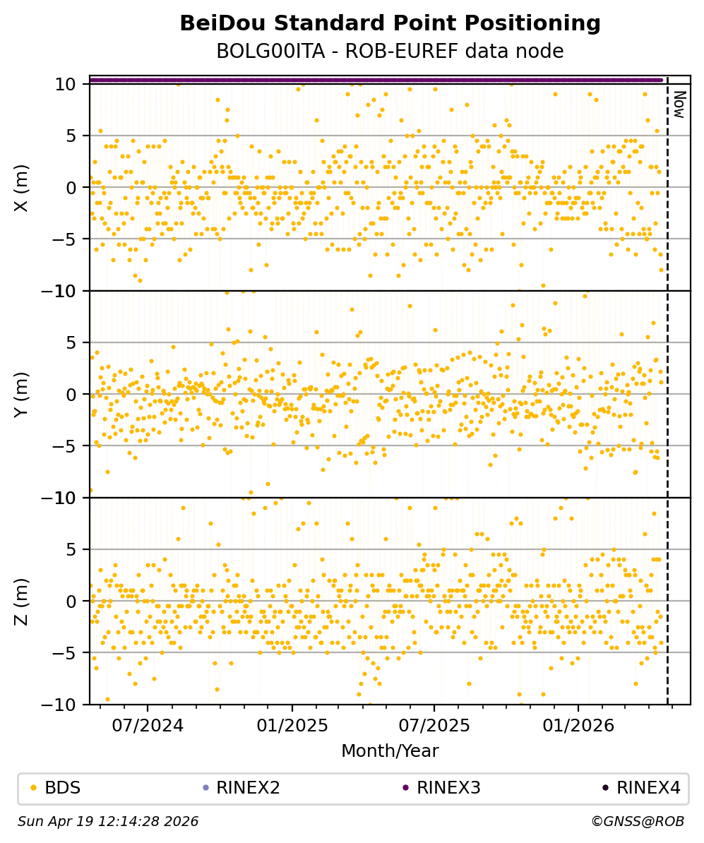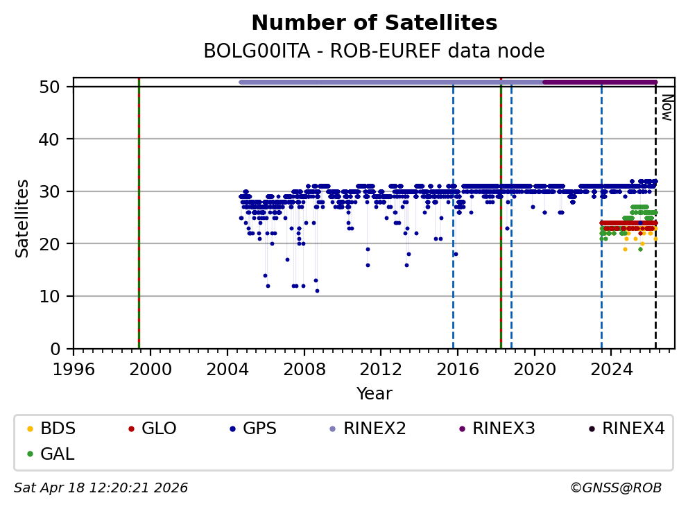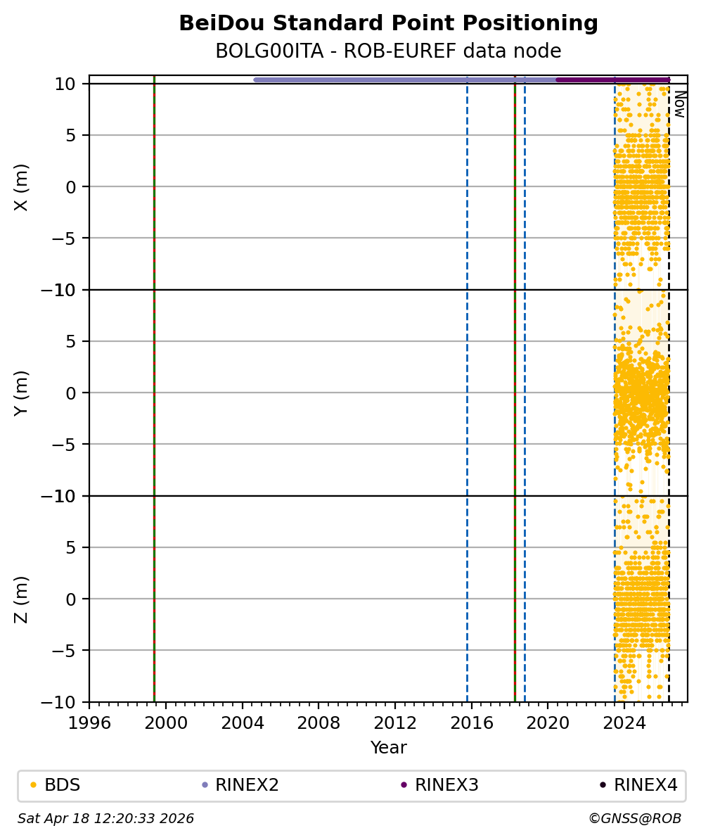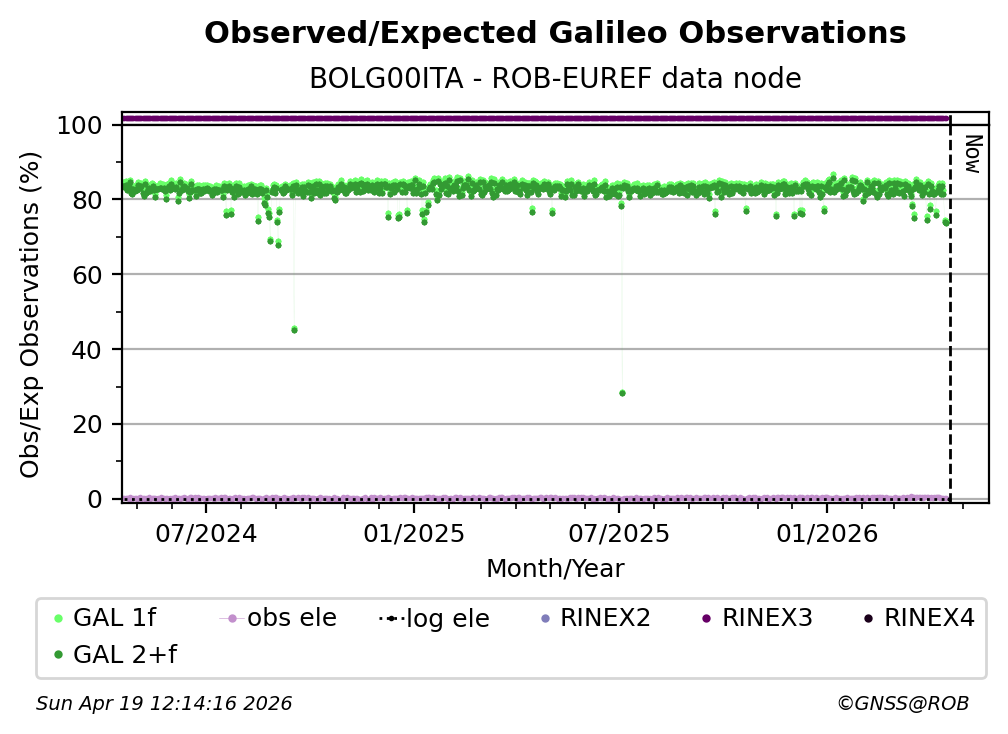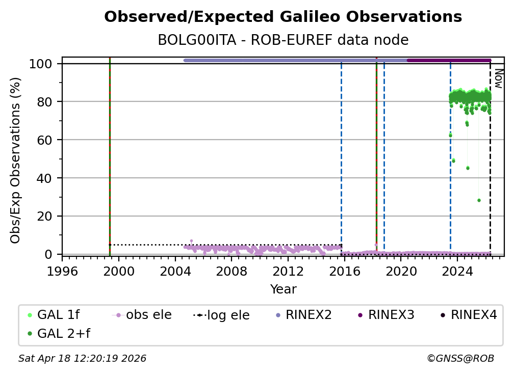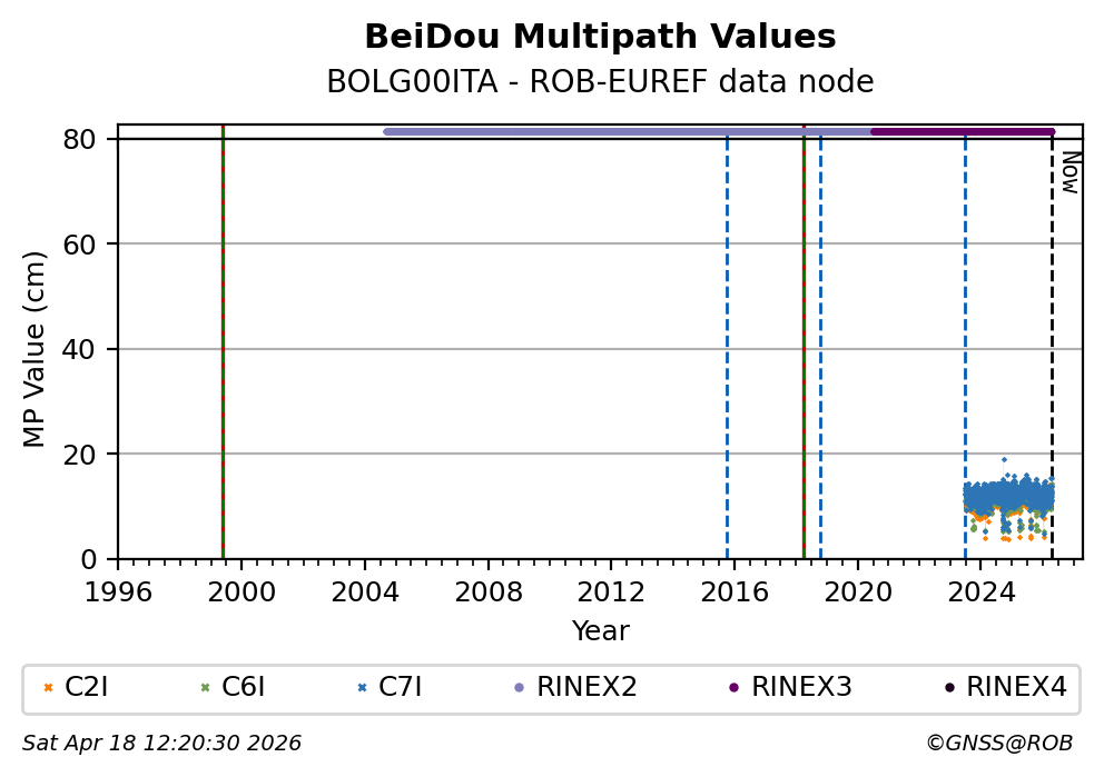 The plots below present the long-term tracking performance of the EPOS-GNSS station BOLG00ITA based on the daily RINEX data available from the ROB-EUREF EPOS-GNSS data node. The data quality metrics have been computed at the data node using the G-Nut/Anubis software.
