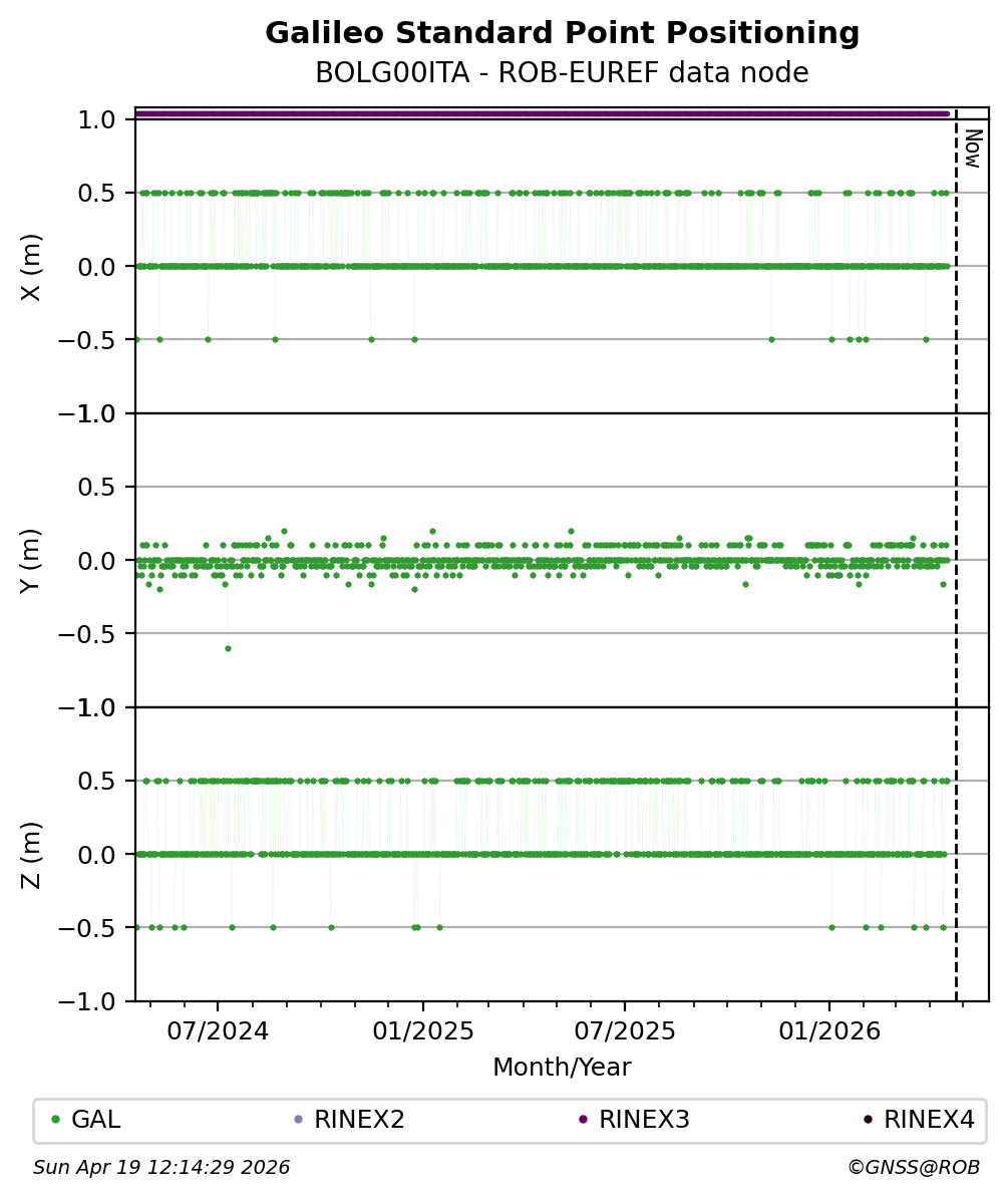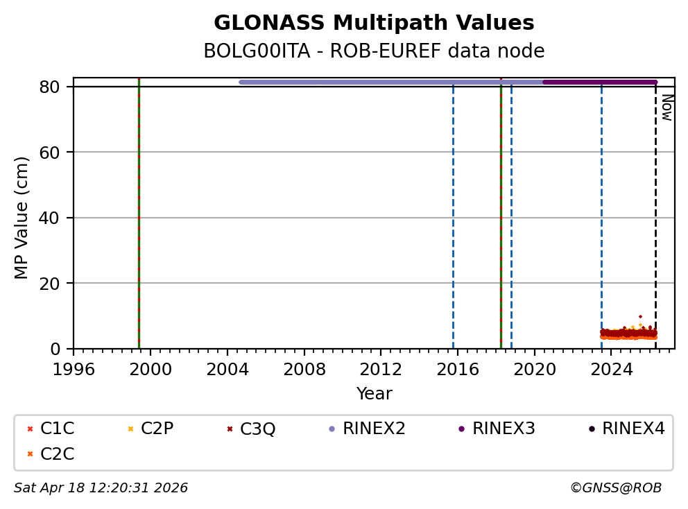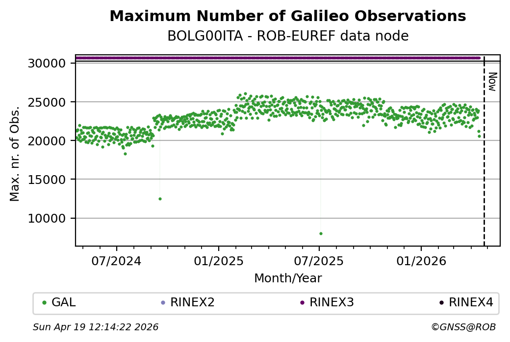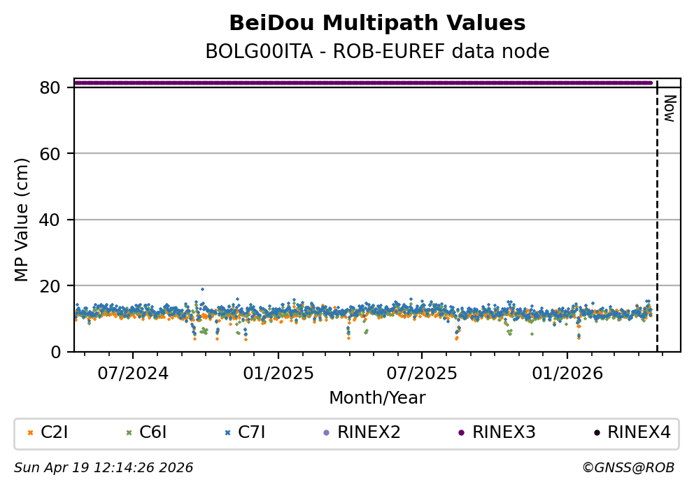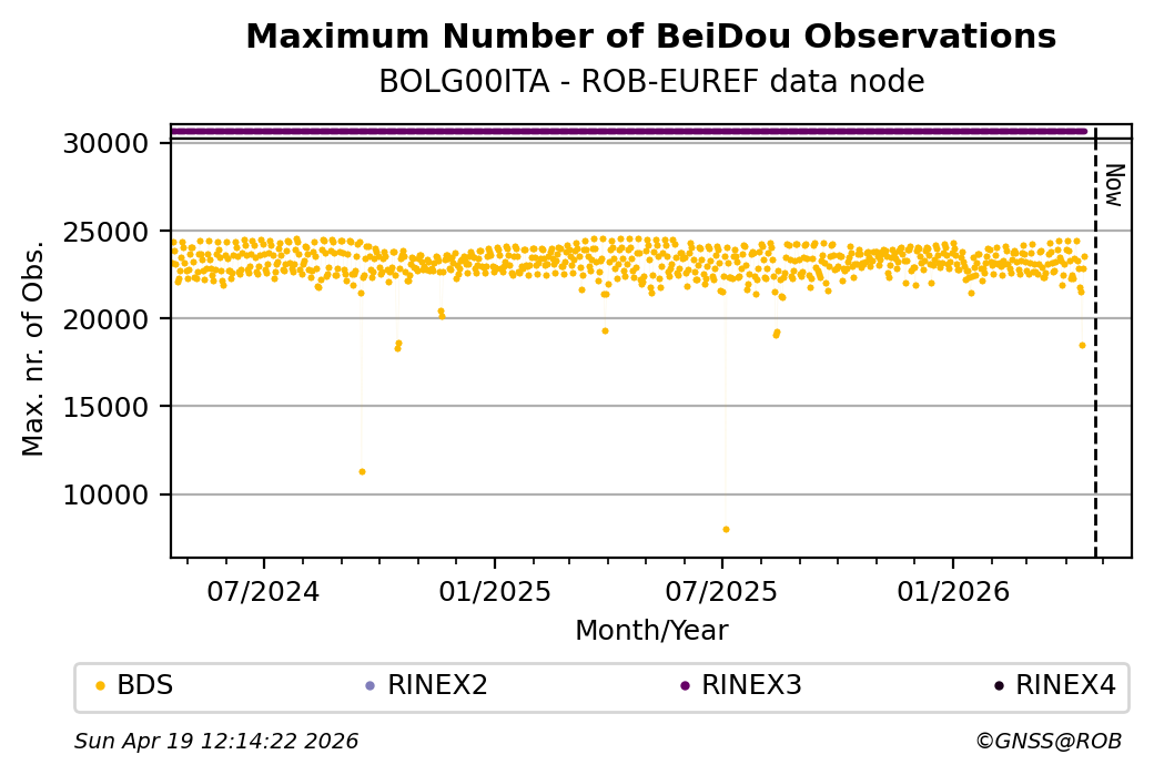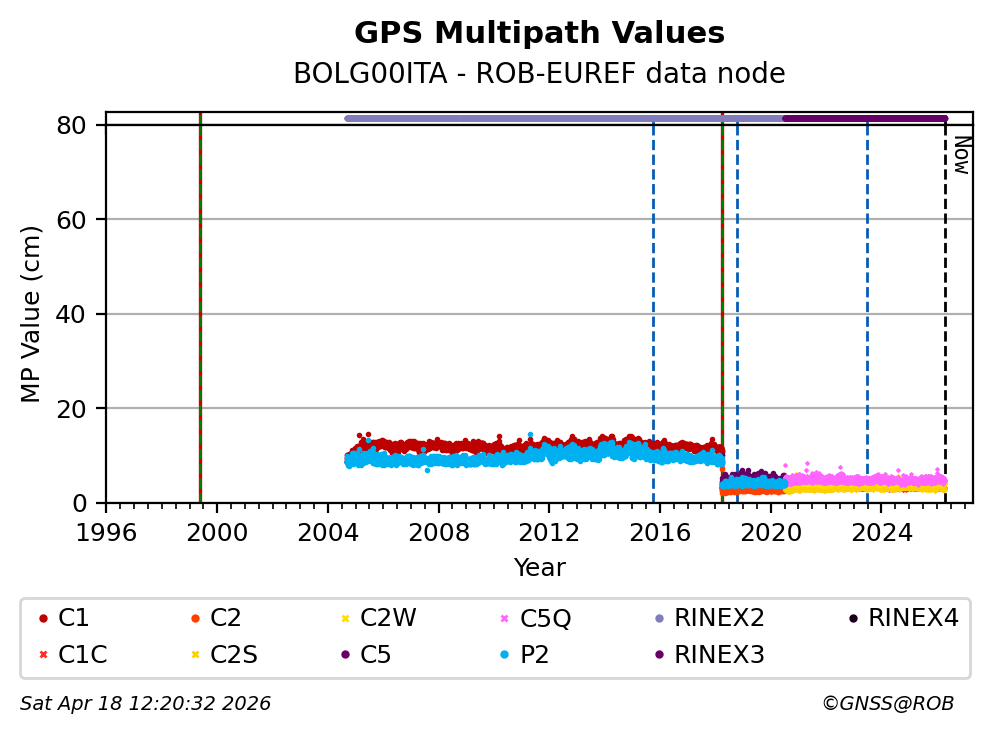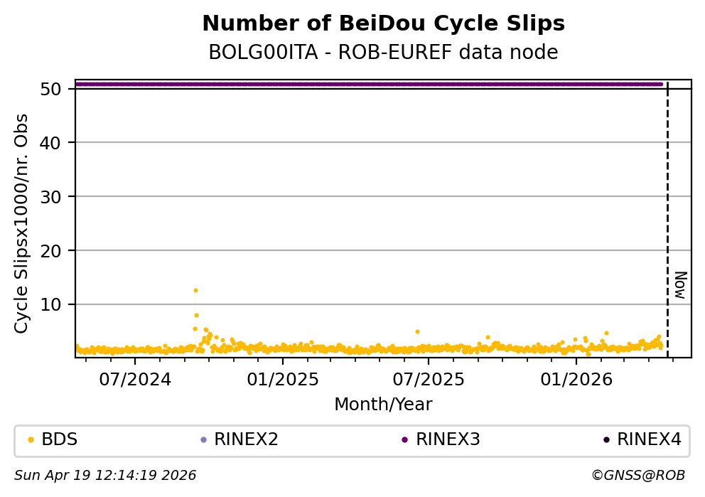 The plots below present the long-term tracking performance of the EPOS-GNSS station BOLG00ITA based on the daily RINEX data available from the ROB-EUREF EPOS-GNSS data node. The data quality metrics have been computed at the data node using the G-Nut/Anubis software.