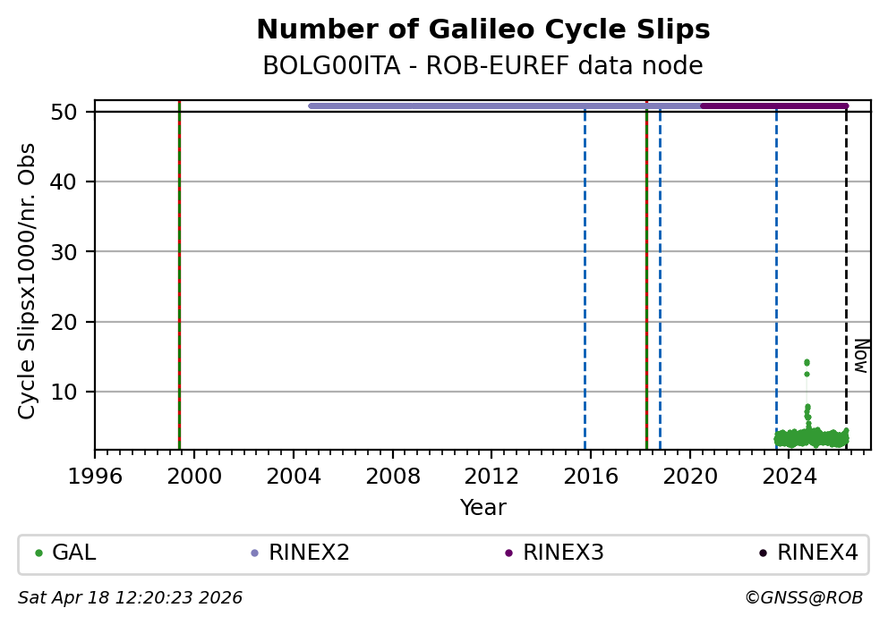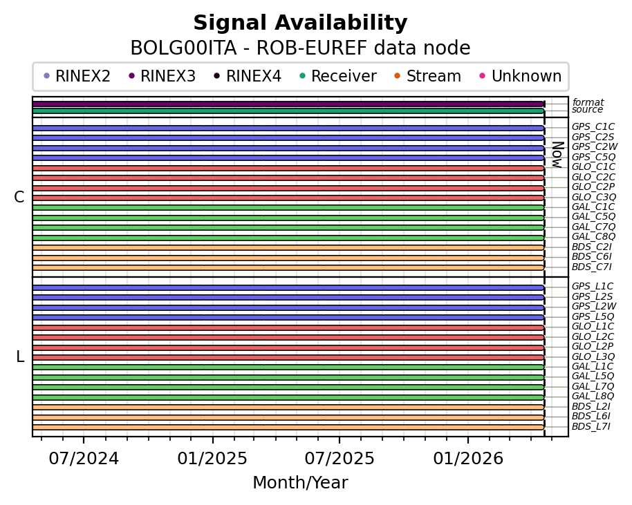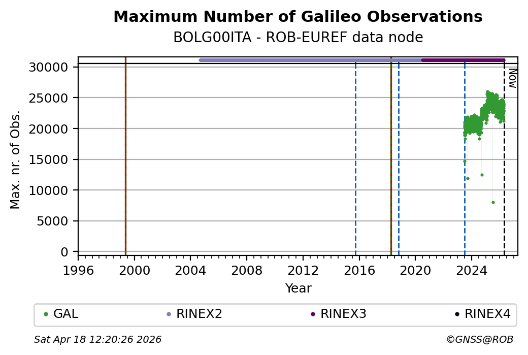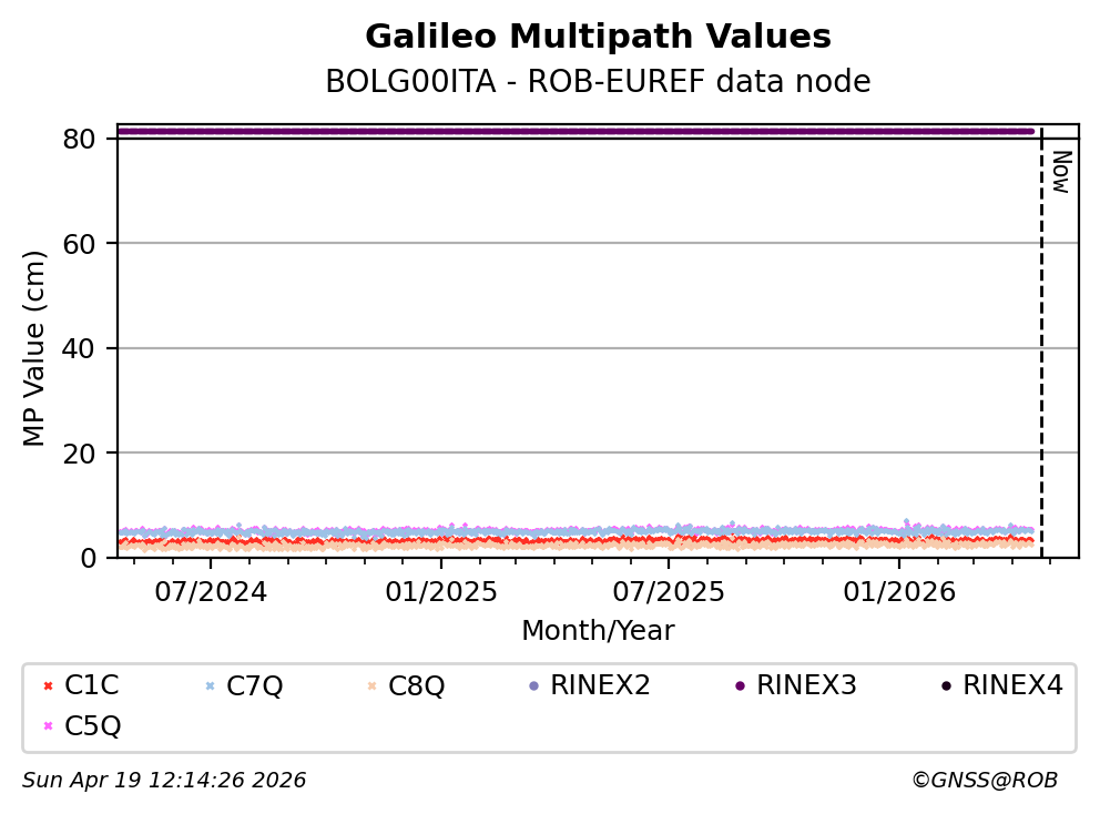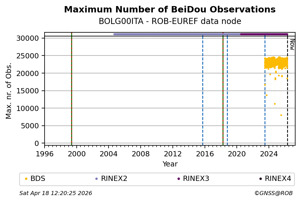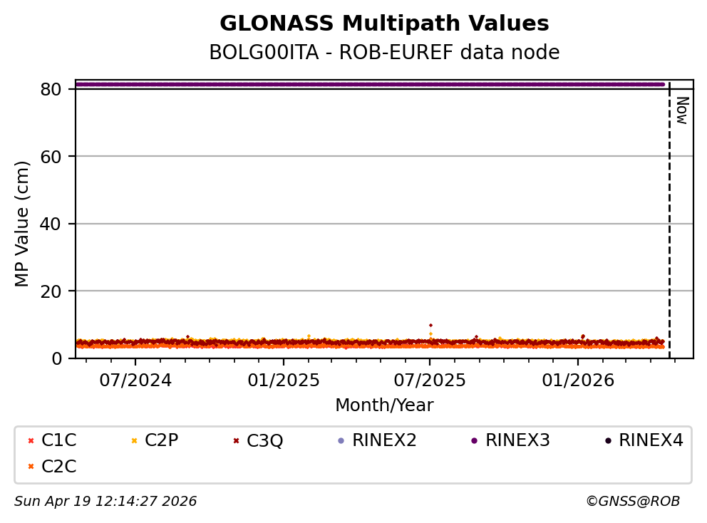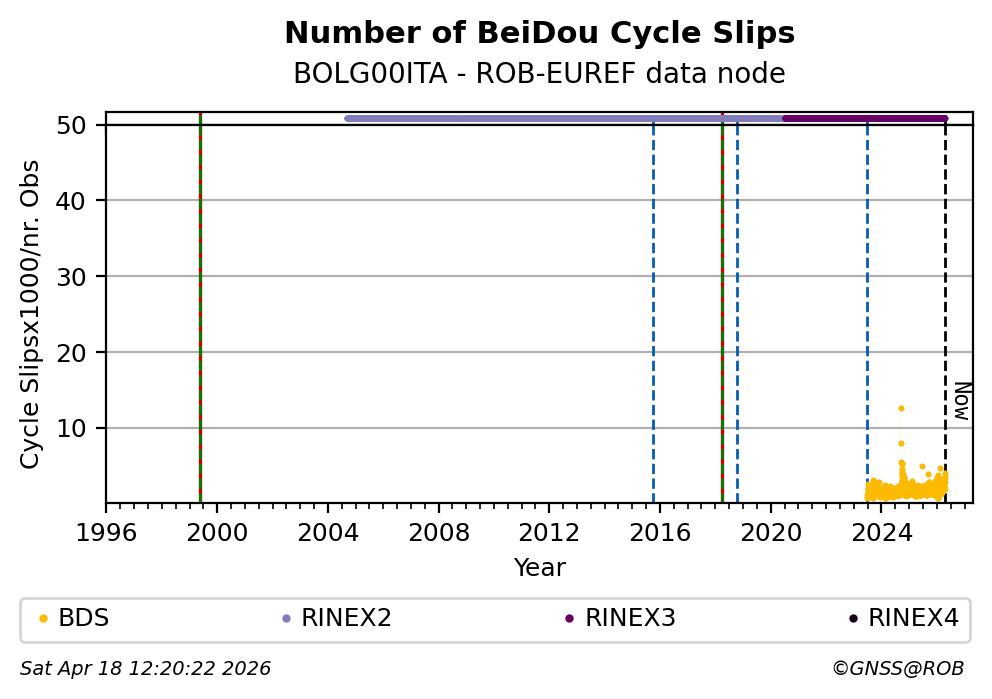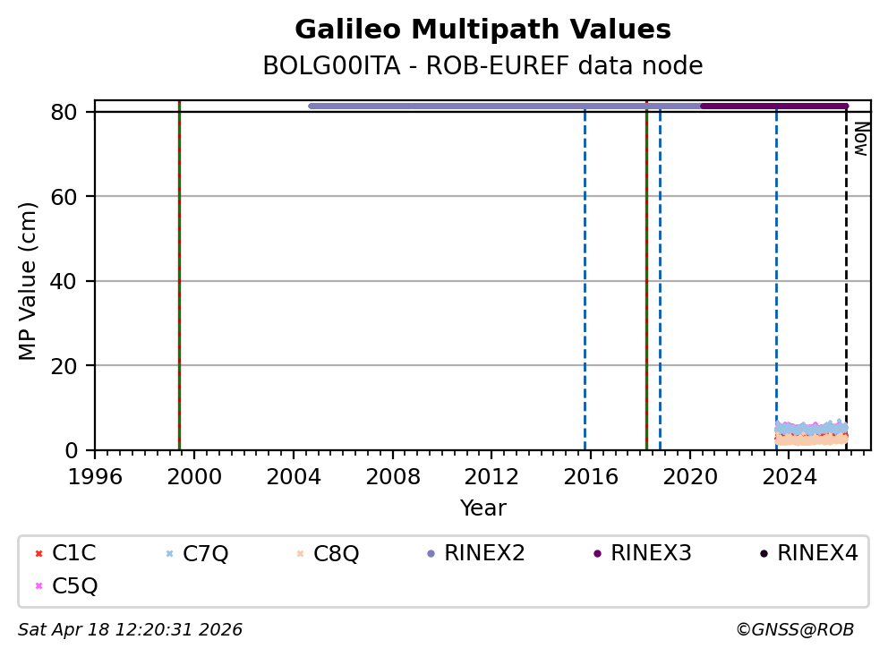 The plots below present the long-term tracking performance of the EPOS-GNSS station BOLG00ITA based on the daily RINEX data available from the ROB-EUREF EPOS-GNSS data node. The data quality metrics have been computed at the data node using the G-Nut/Anubis software.