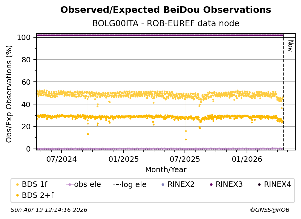 The percentage corresponds, for each constellation tracked by the station, to the ratio of the number of observations in the daily RINEX file with respect to the number of expected observations: