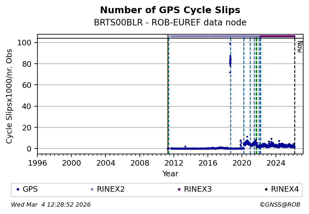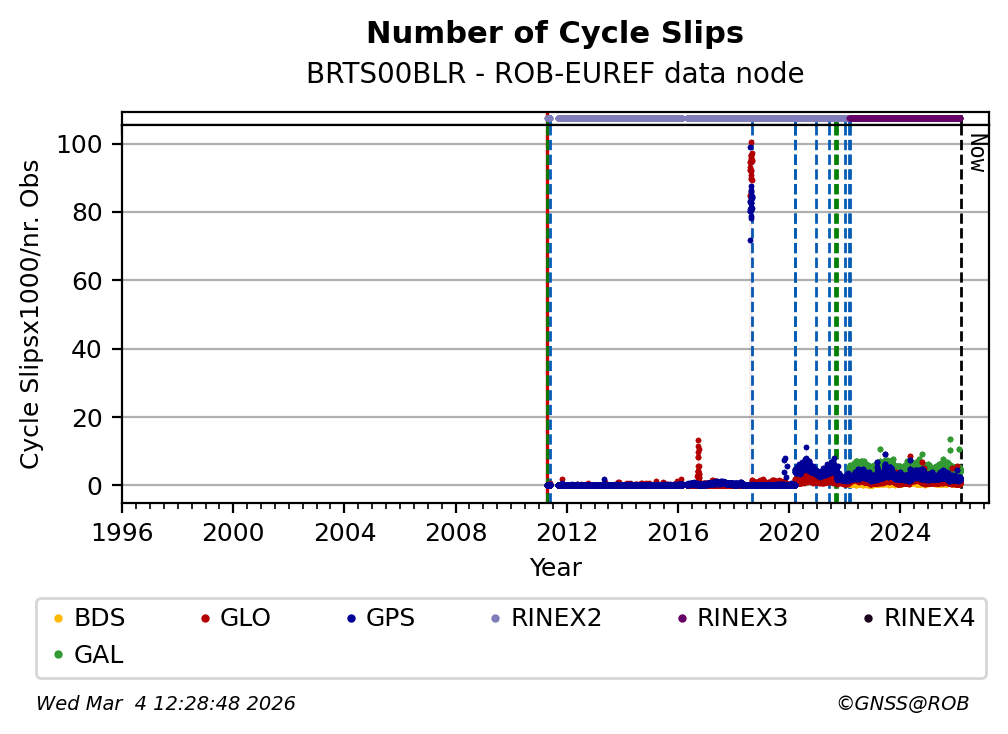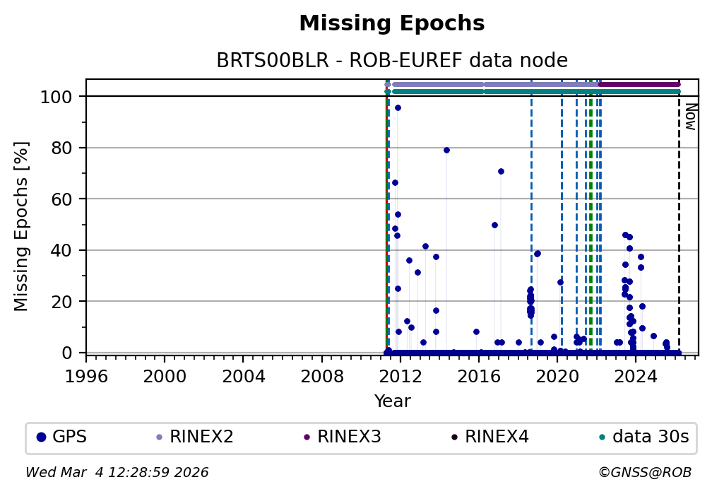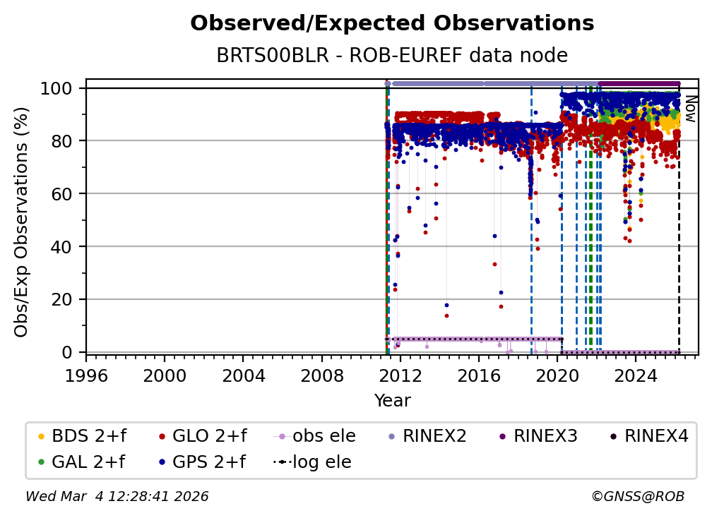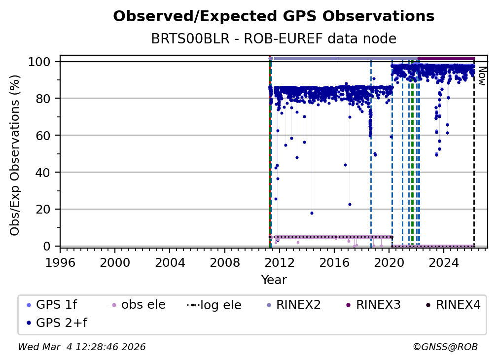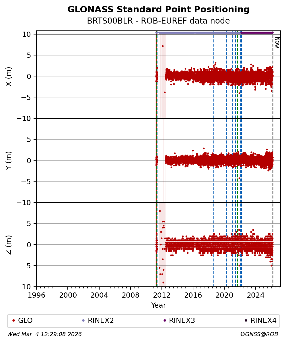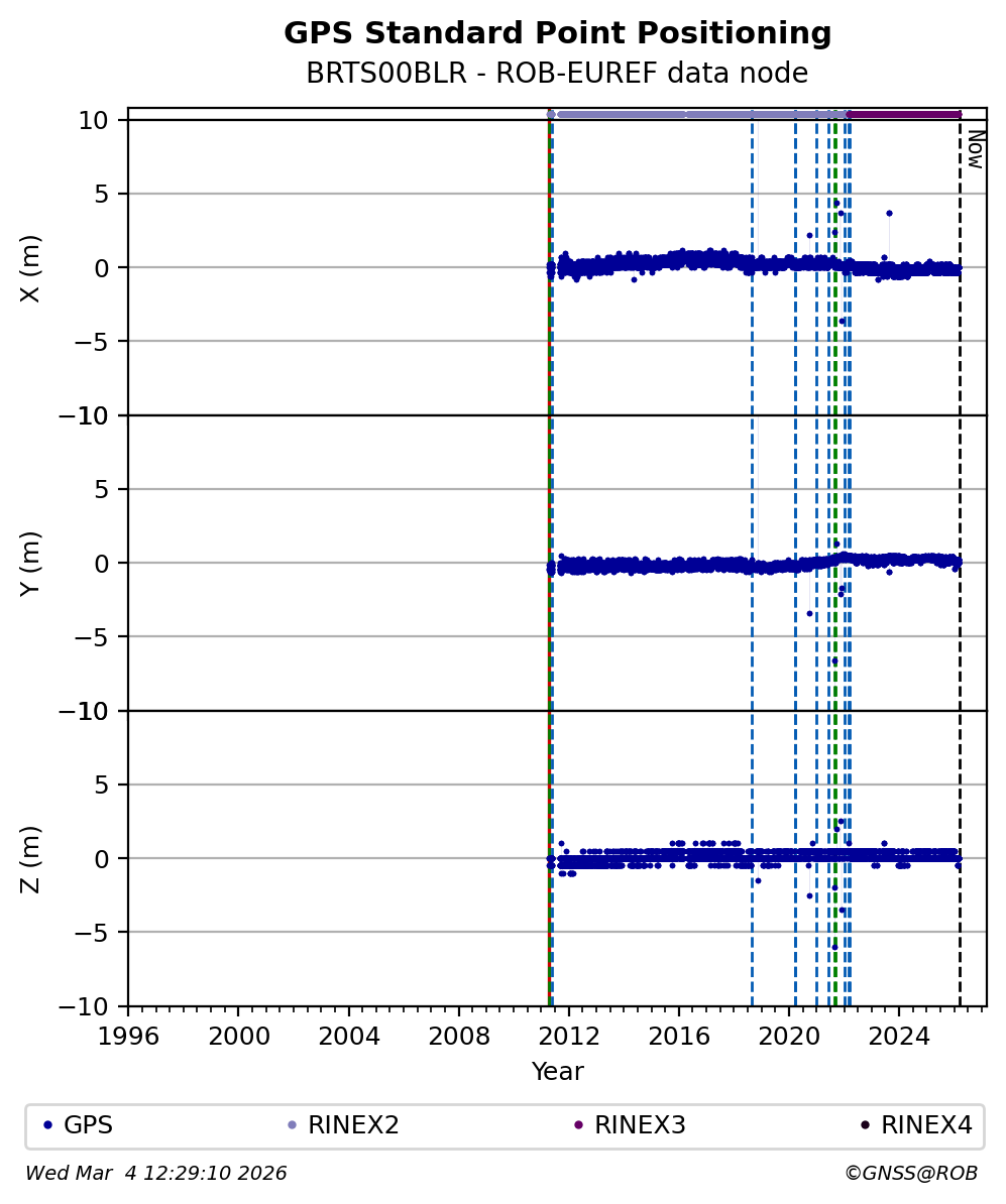 The plots below present the long-term tracking performance of the EPOS-GNSS station BRTS00BLR based on the daily RINEX data available from the ROB-EUREF EPOS-GNSS data node. The data quality metrics have been computed at the data node using the G-Nut/Anubis software.