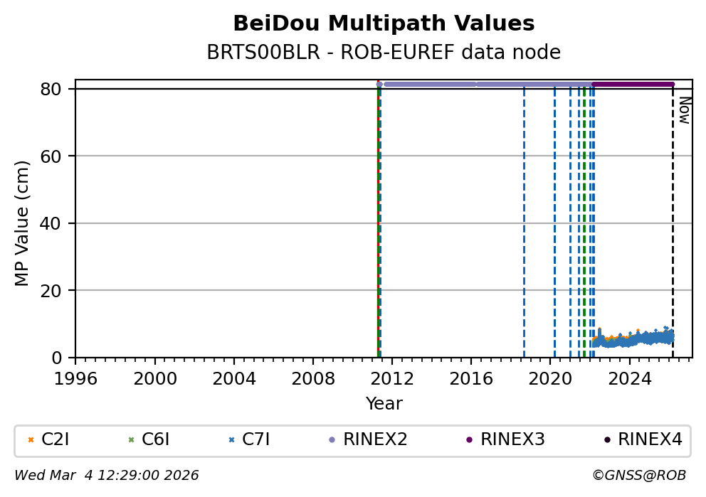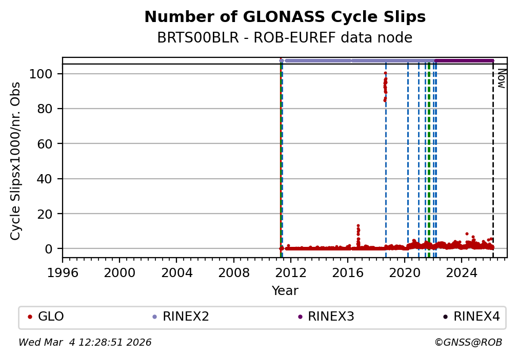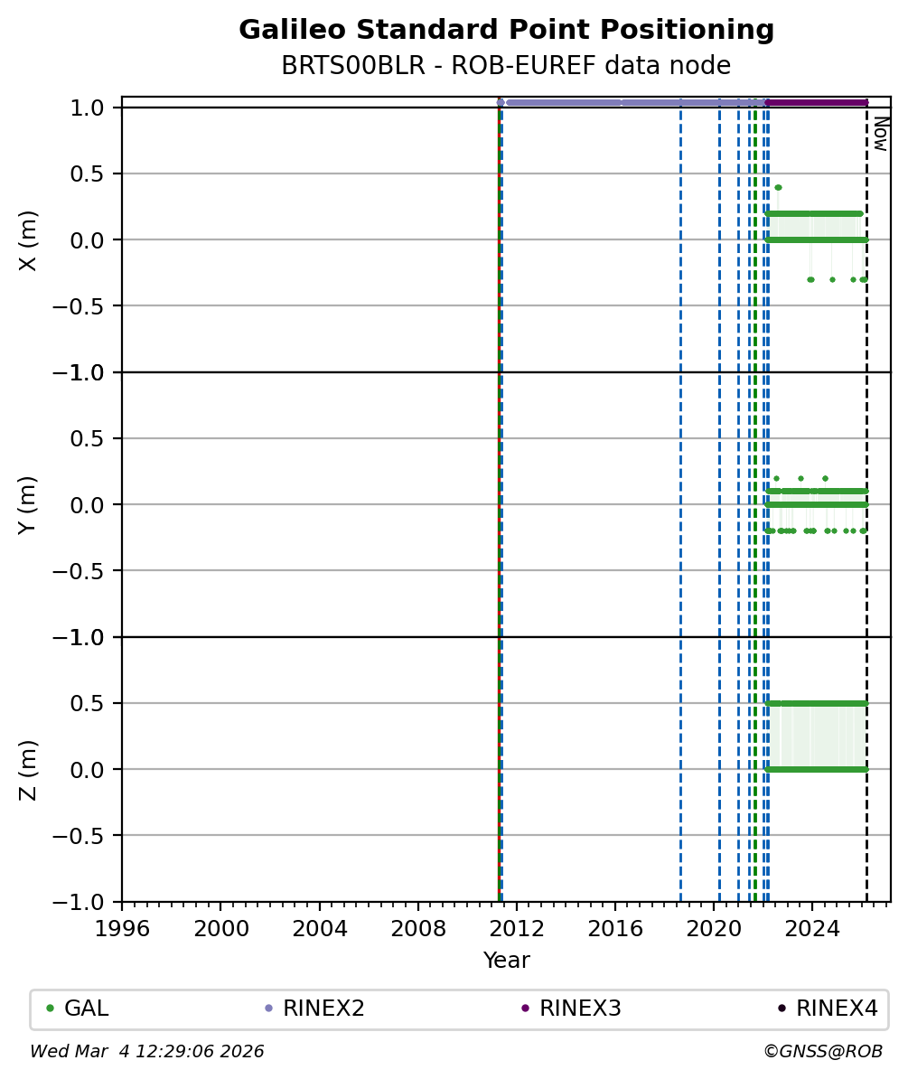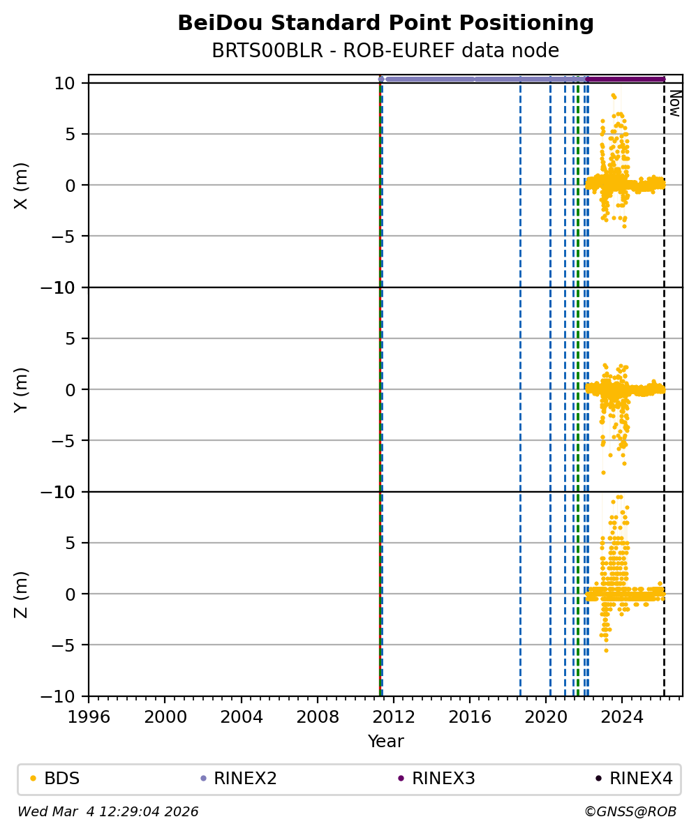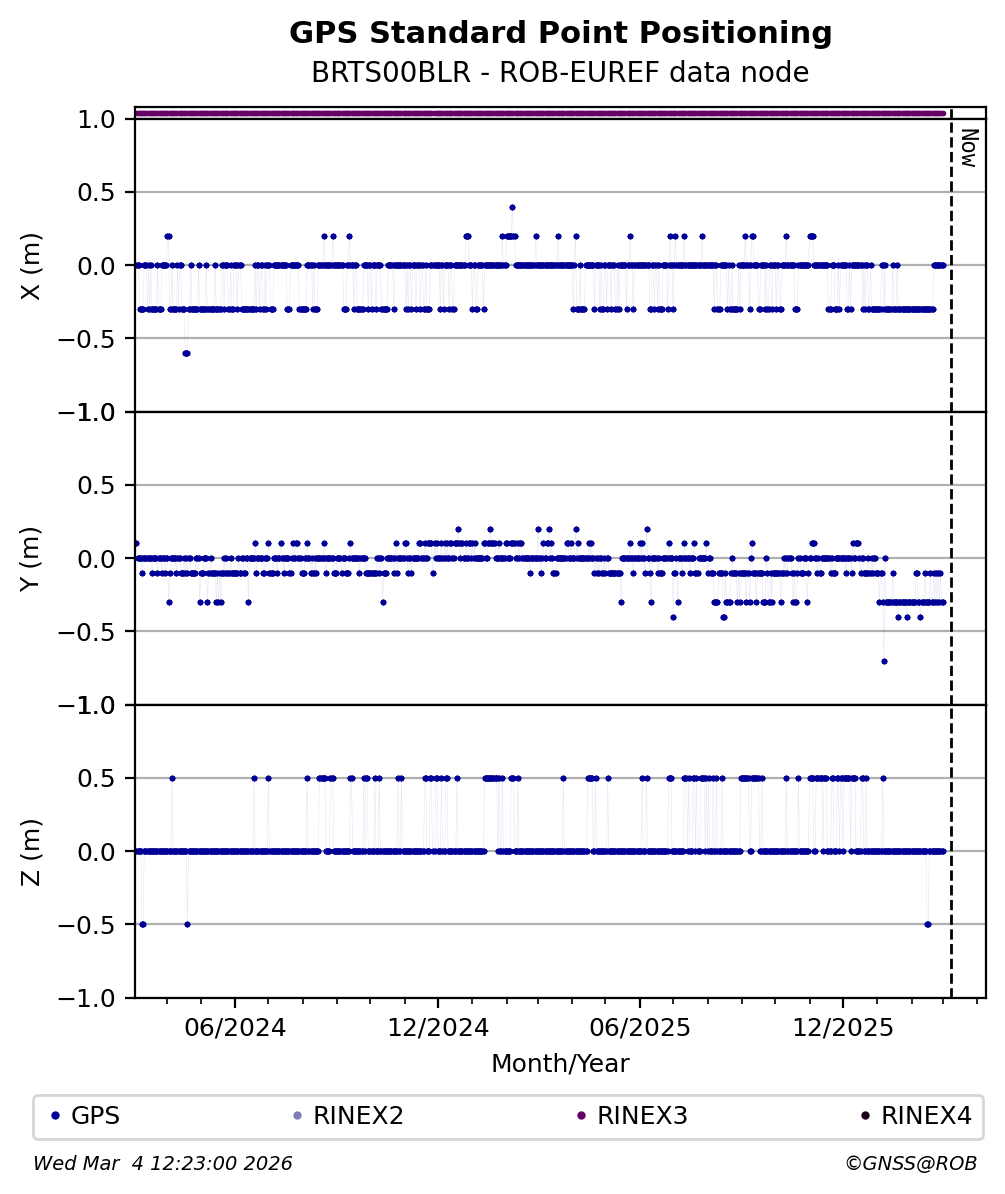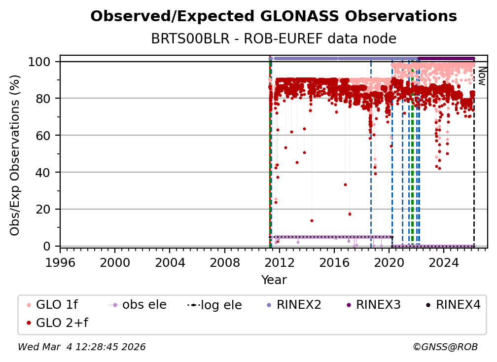The plots below present the long-term tracking performance of the EPOS-GNSS station BRTS00BLR based on the daily RINEX data available from the ROB-EUREF EPOS-GNSS data node. The data quality metrics have been computed at the data node using the G-Nut/Anubis software.