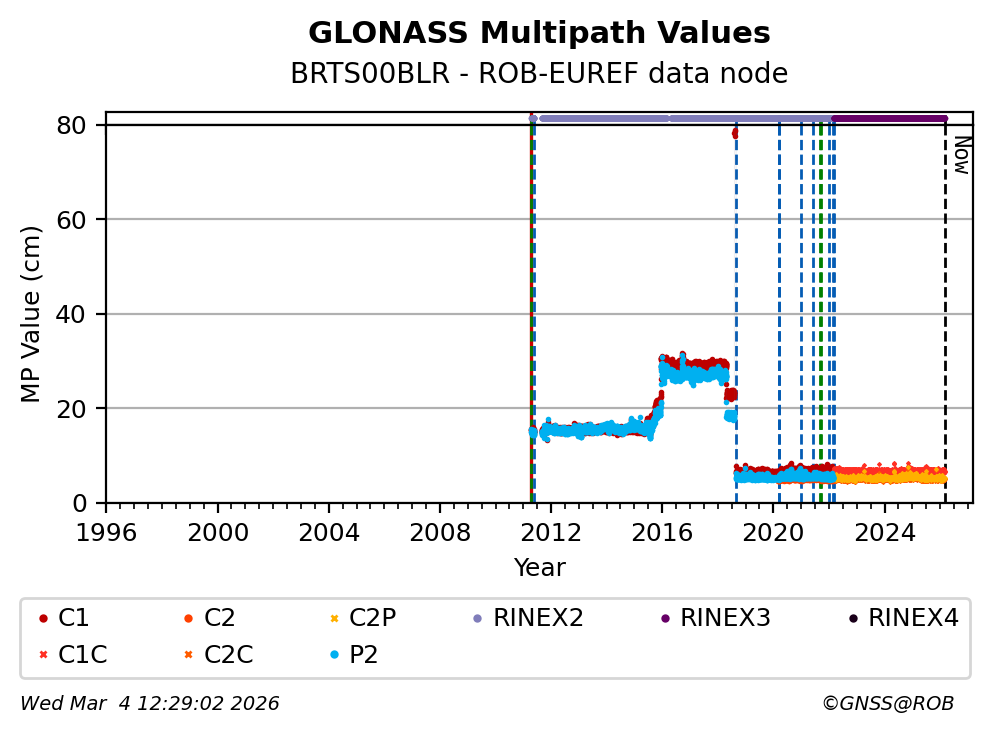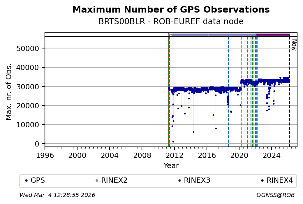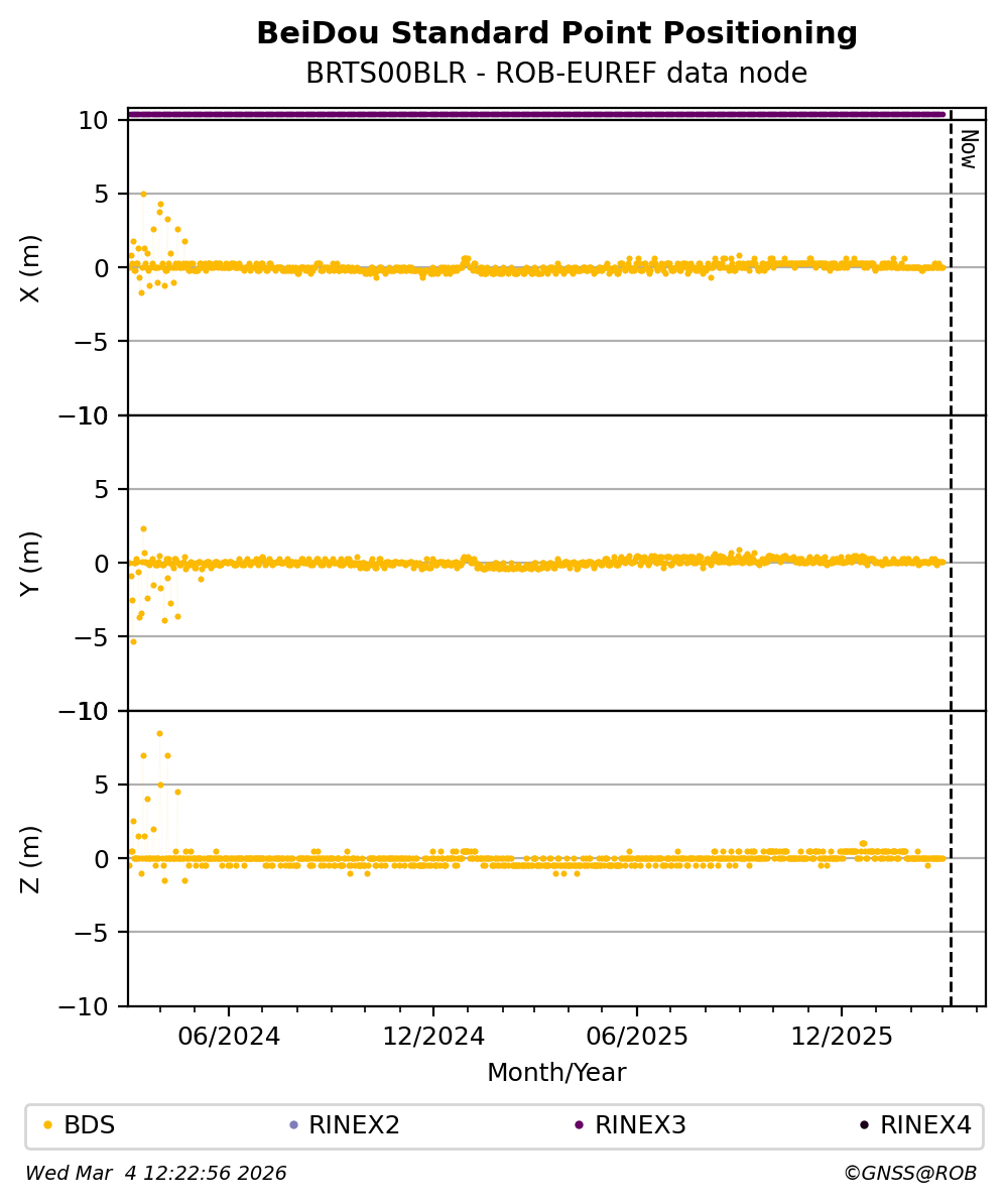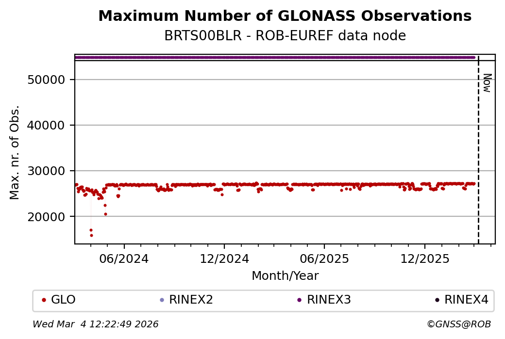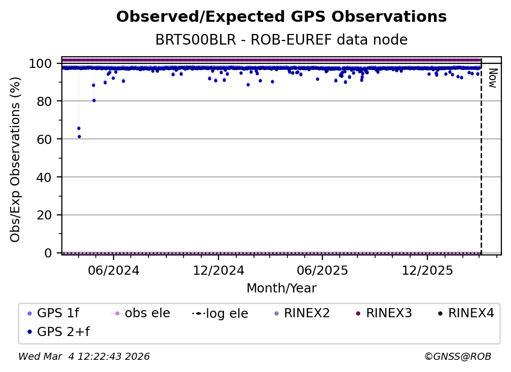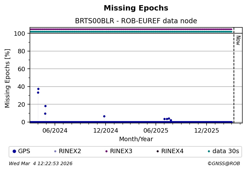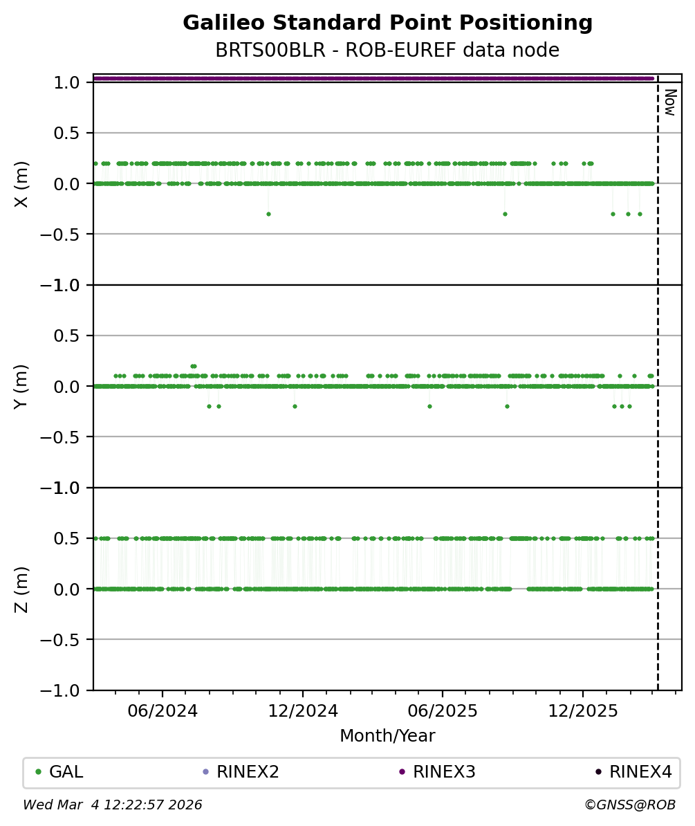 The plots below present the long-term tracking performance of the EPOS-GNSS station BRTS00BLR based on the daily RINEX data available from the ROB-EUREF EPOS-GNSS data node. The data quality metrics have been computed at the data node using the G-Nut/Anubis software.