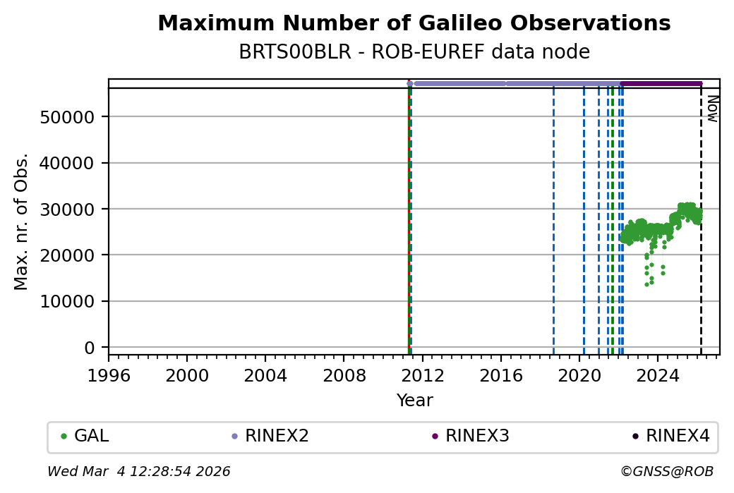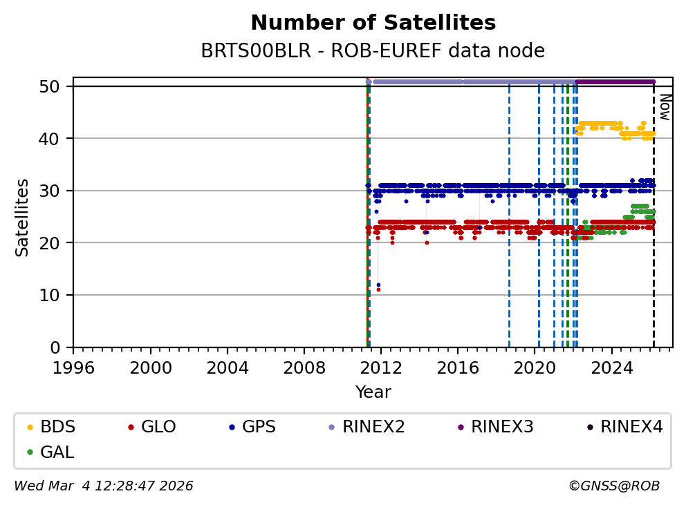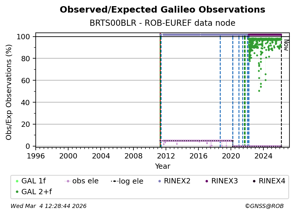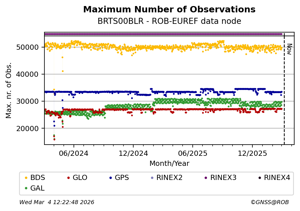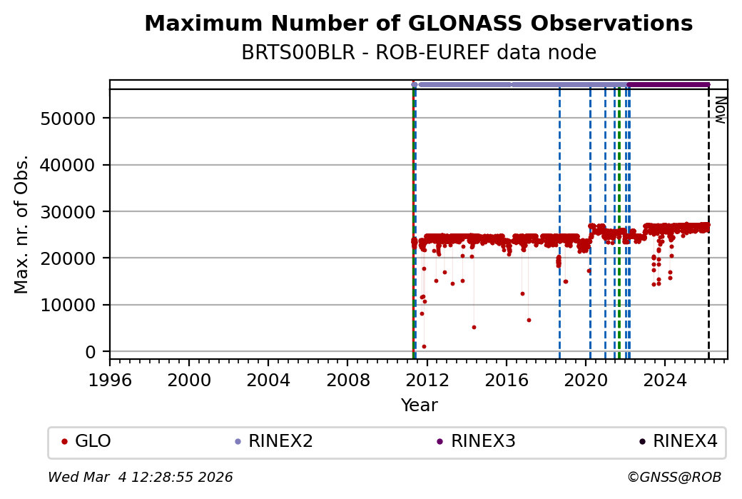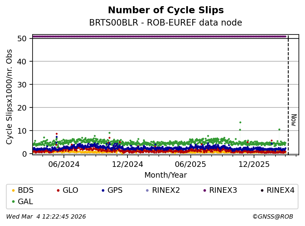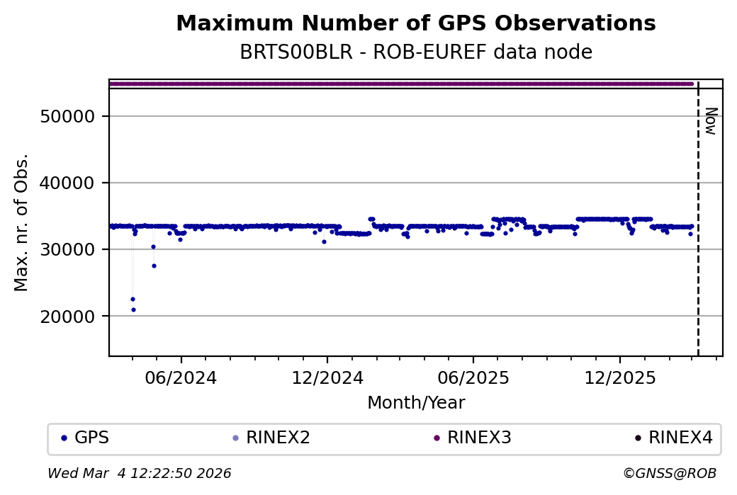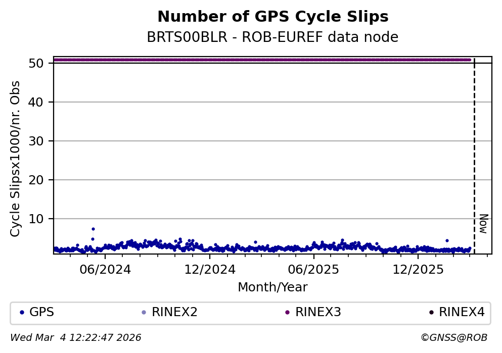The plots below present the long-term tracking performance of the EPOS-GNSS station BRTS00BLR based on the daily RINEX data available from the ROB-EUREF EPOS-GNSS data node. The data quality metrics have been computed at the data node using the G-Nut/Anubis software.