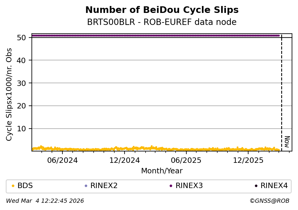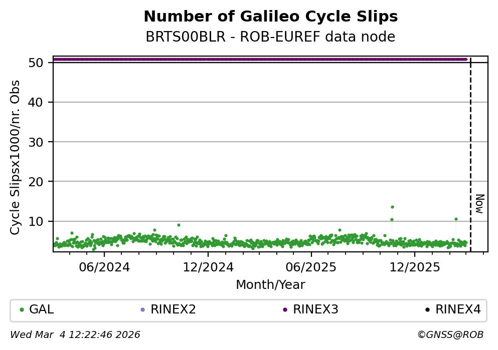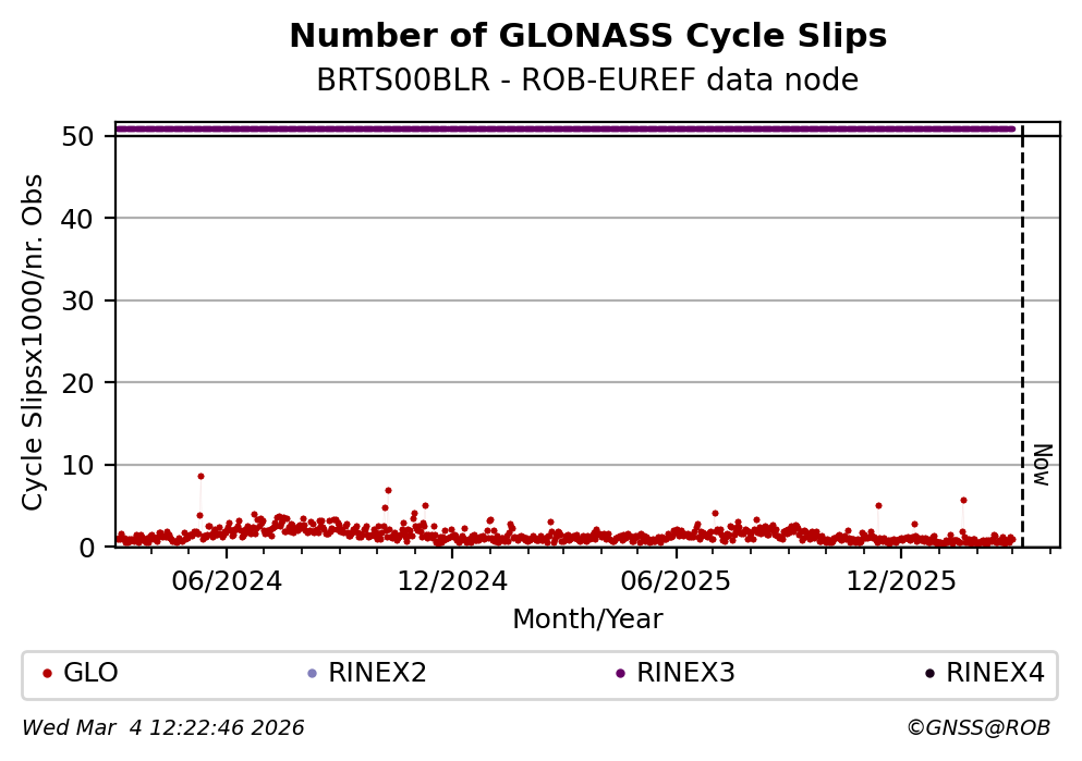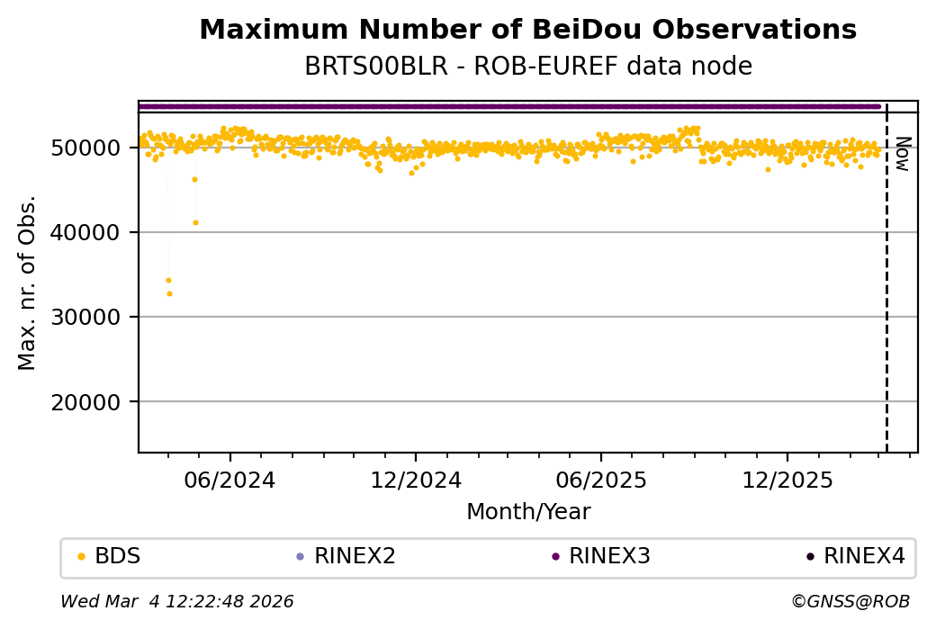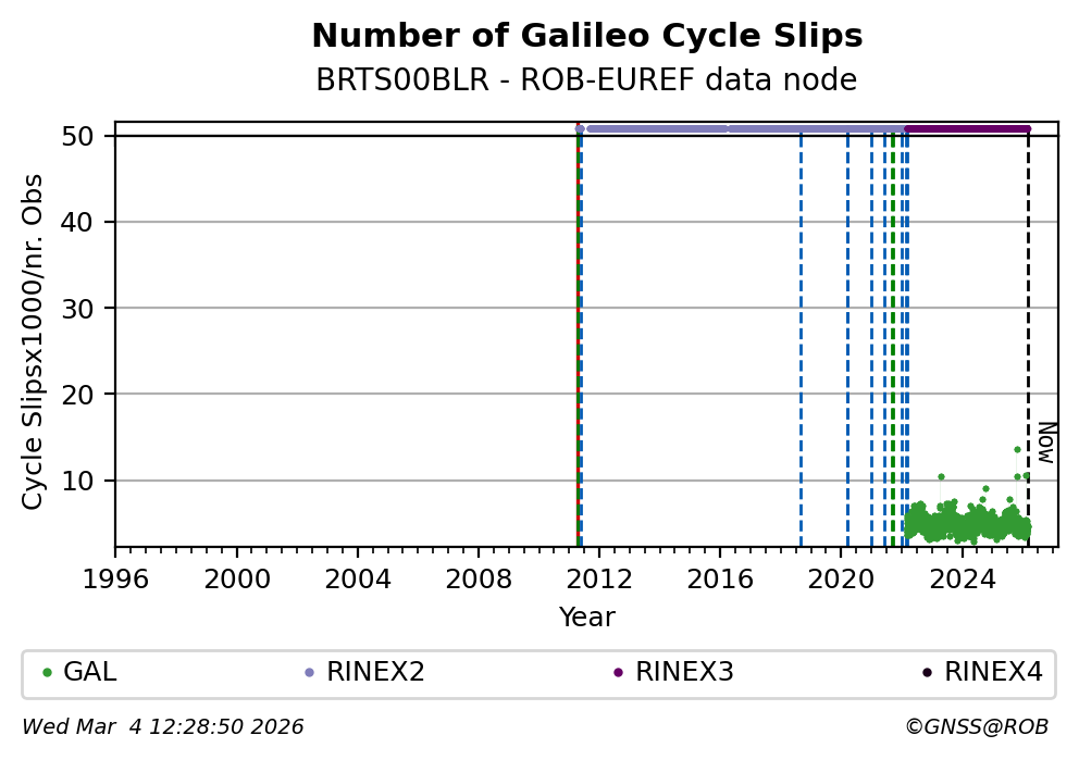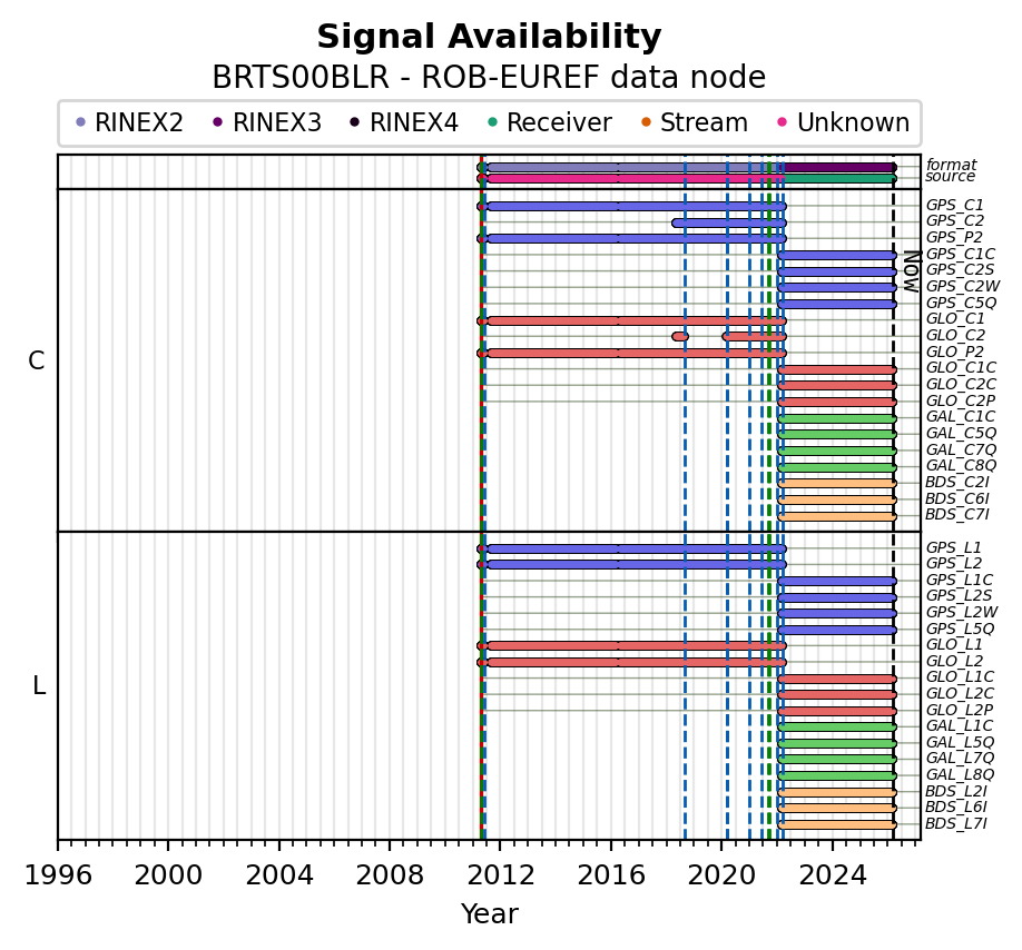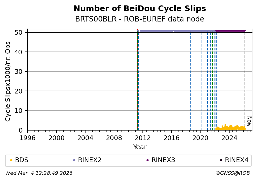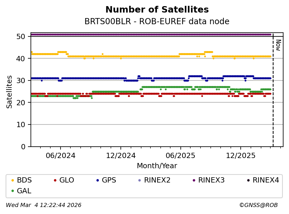 The plots below present the long-term tracking performance of the EPOS-GNSS station BRTS00BLR based on the daily RINEX data available from the ROB-EUREF EPOS-GNSS data node. The data quality metrics have been computed at the data node using the G-Nut/Anubis software.