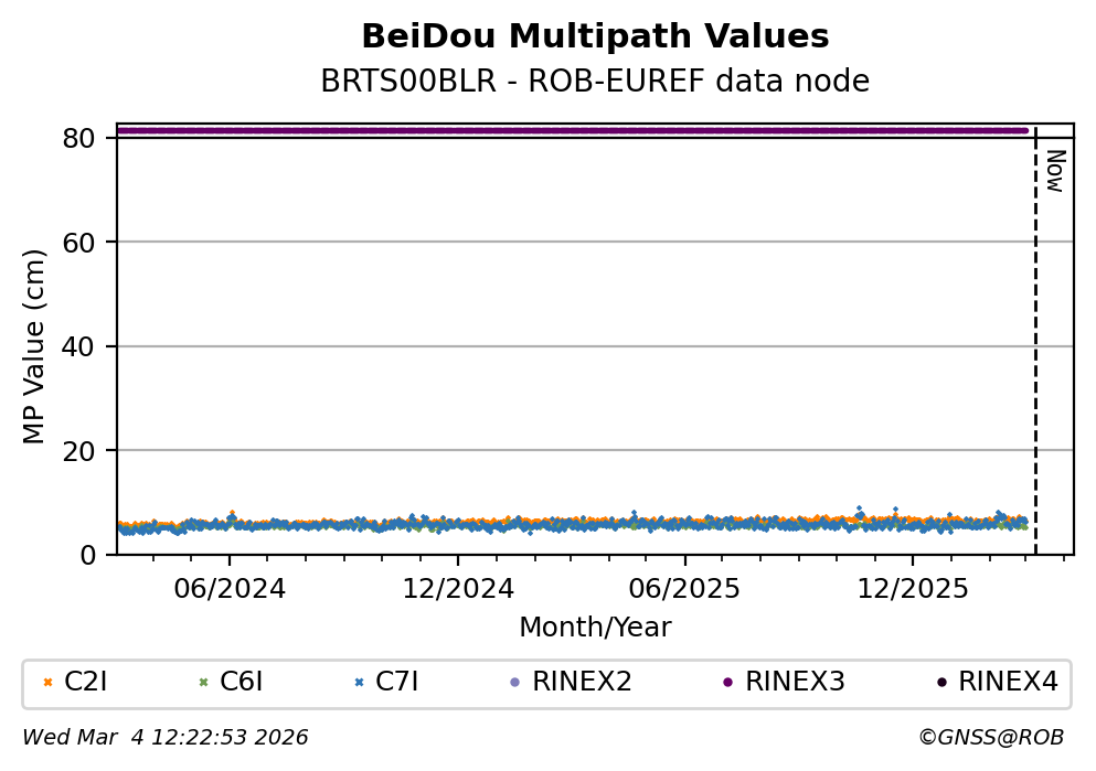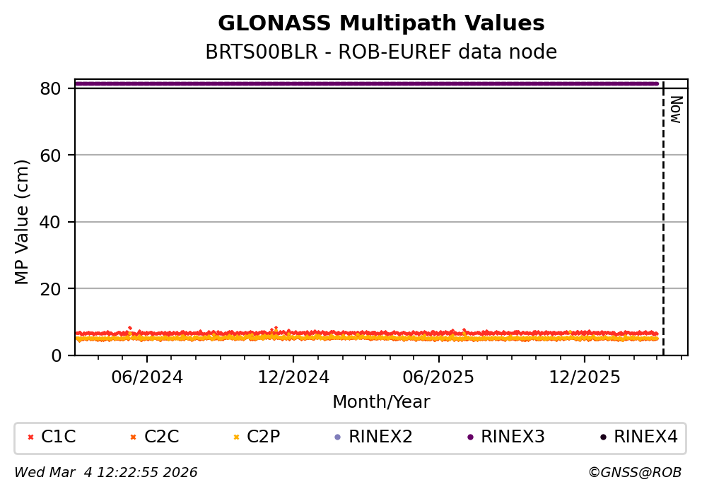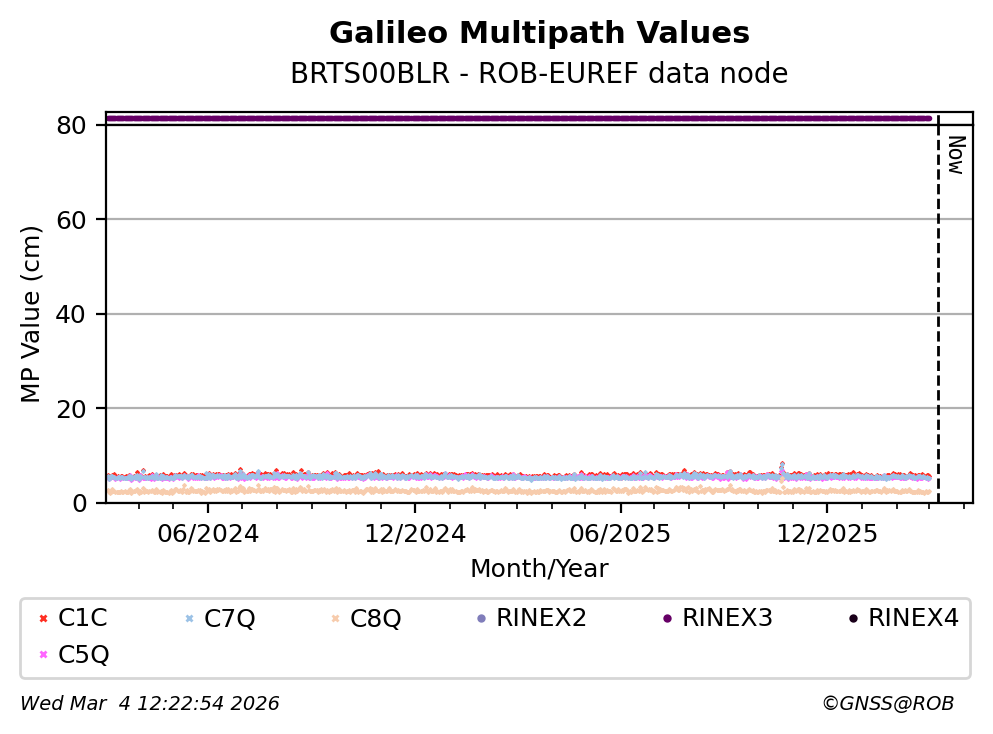These plots display the daily mean of code multipath per frequency band and satellite constellation. Code multipath statistics are calculated for all pseudorange codes of all GNSS satellites providing dual-frequency carrier-phase observations. The code multipath characterizes the quality of the observed signal and the site environment.