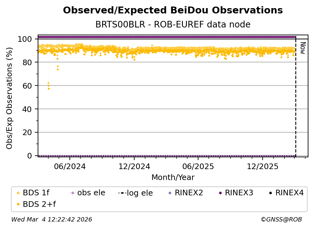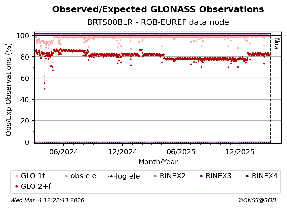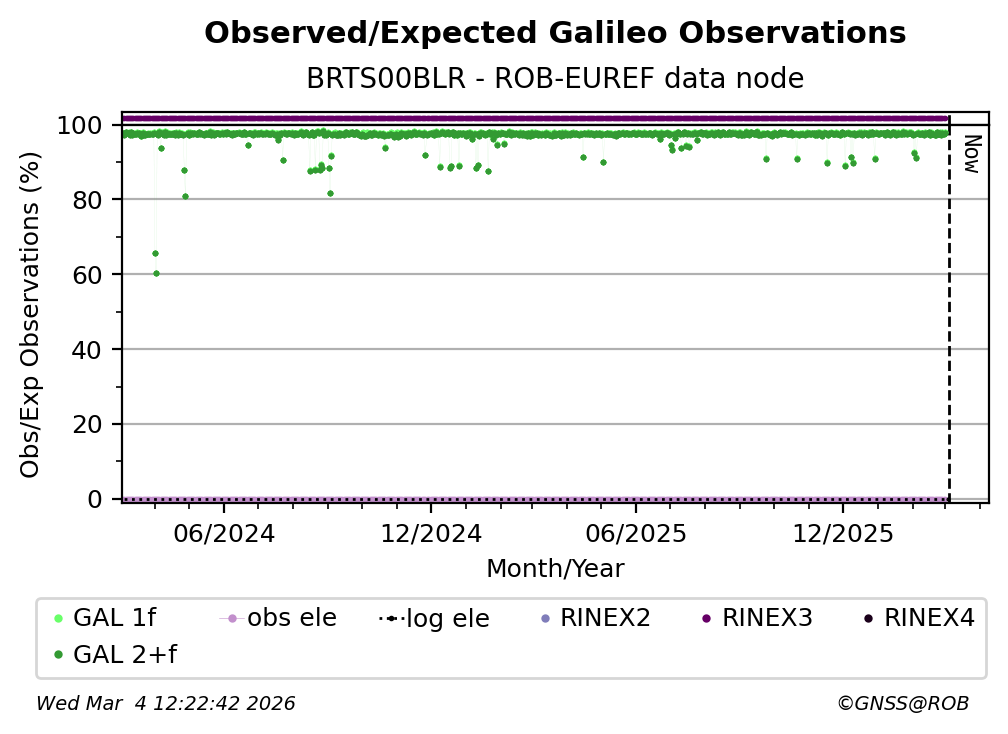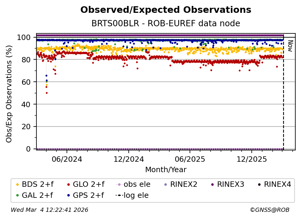 The percentage corresponds, for each constellation tracked by the station, to the ratio of the number of observations in the daily RINEX file with respect to the number of expected observations: