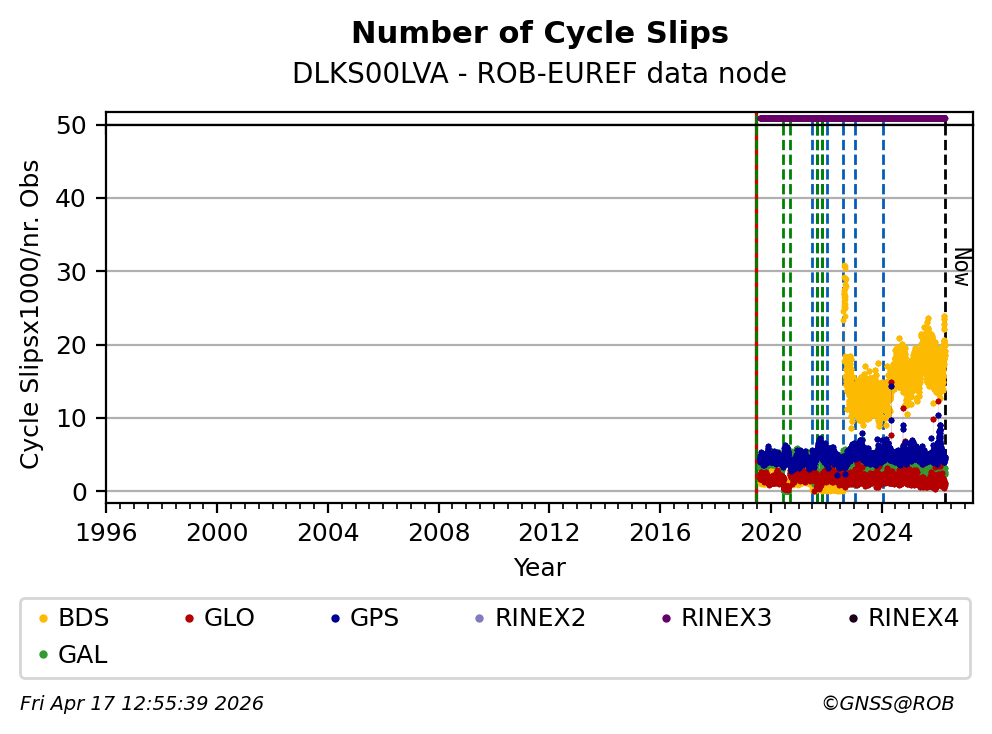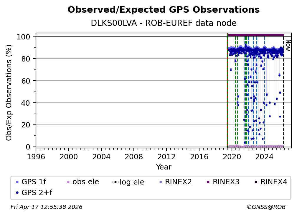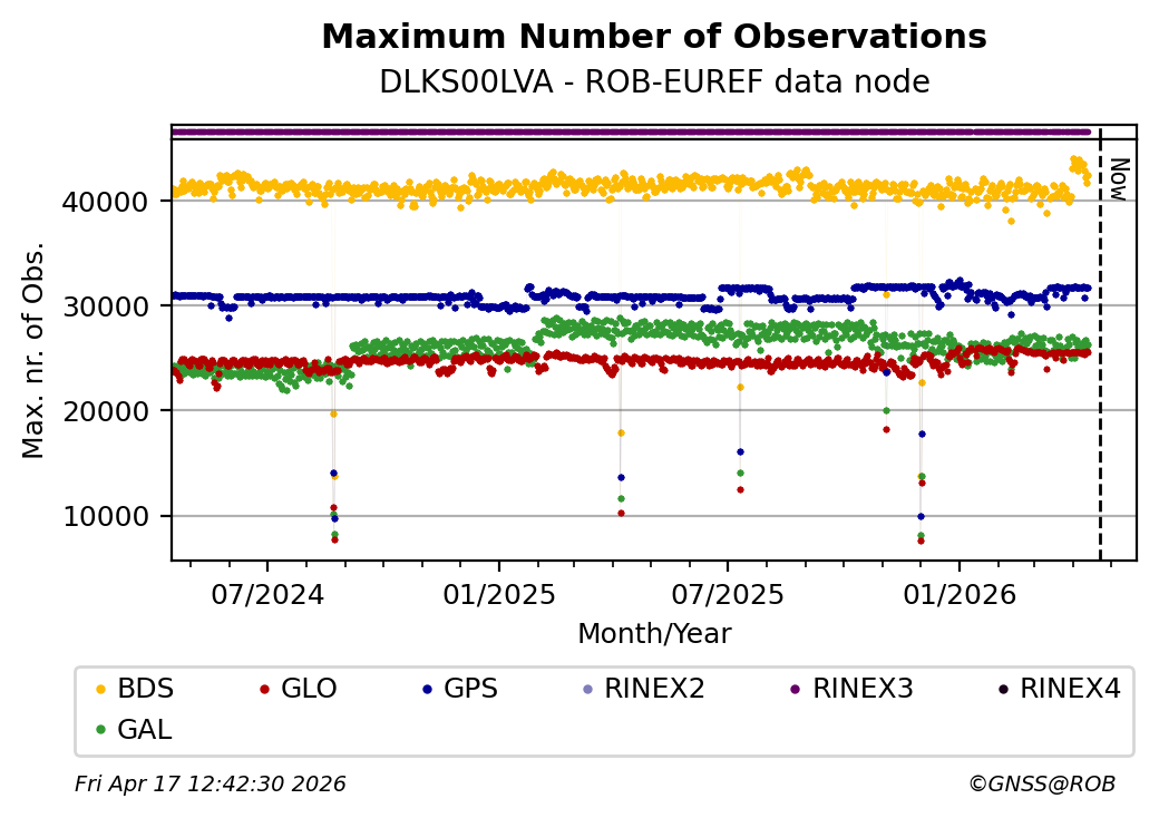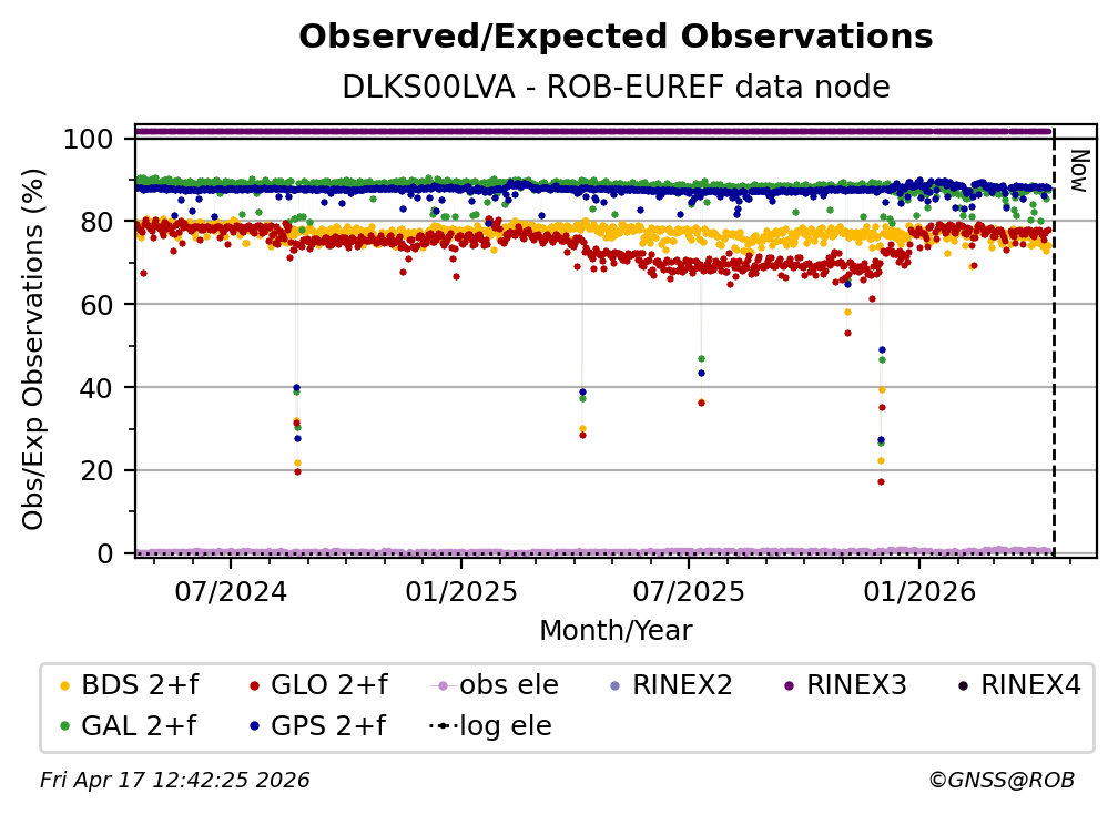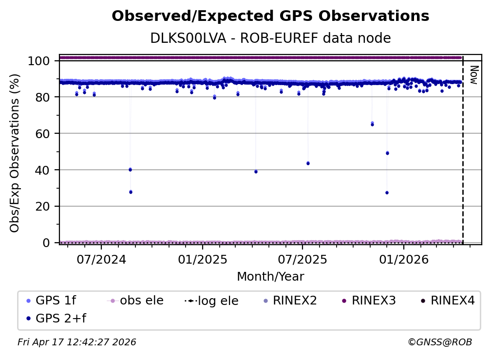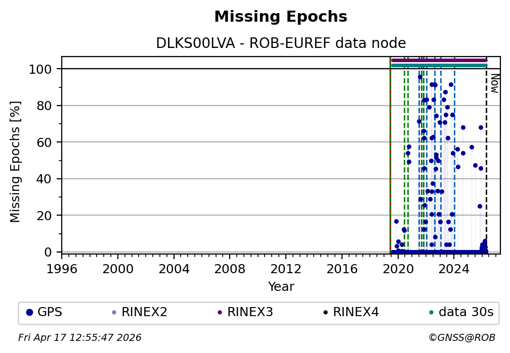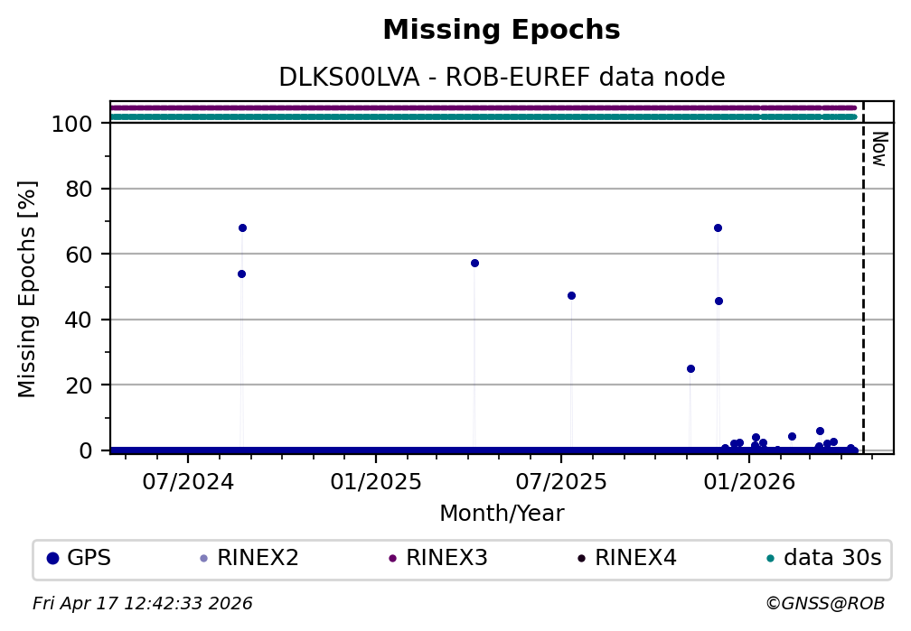 The plots below present the long-term tracking performance of the EPOS-GNSS station DLKS00LVA based on the daily RINEX data available from the ROB-EUREF EPOS-GNSS data node. The data quality metrics have been computed at the data node using the G-Nut/Anubis software.