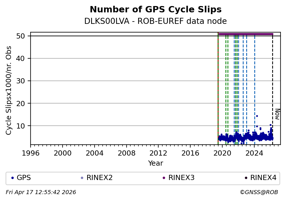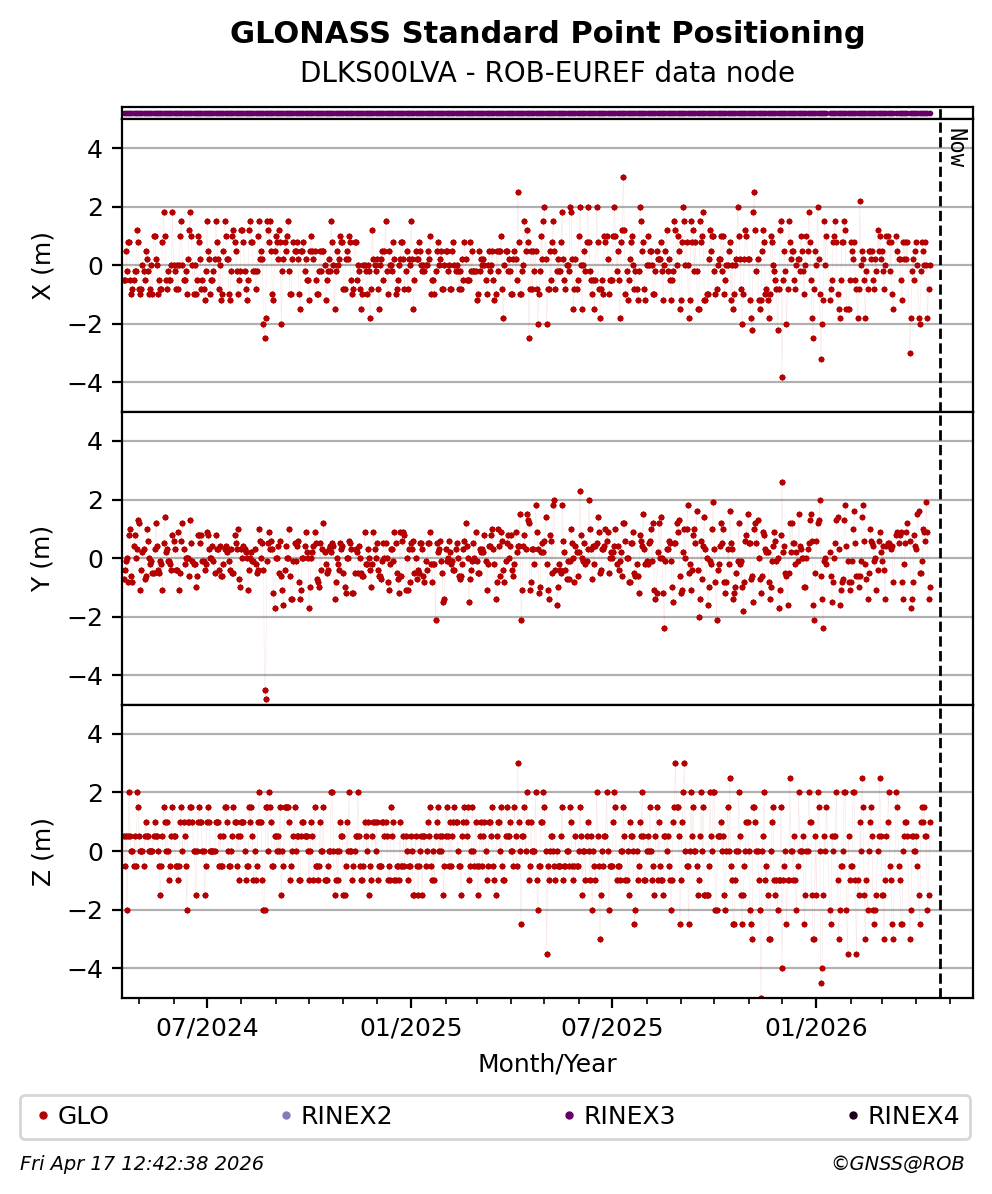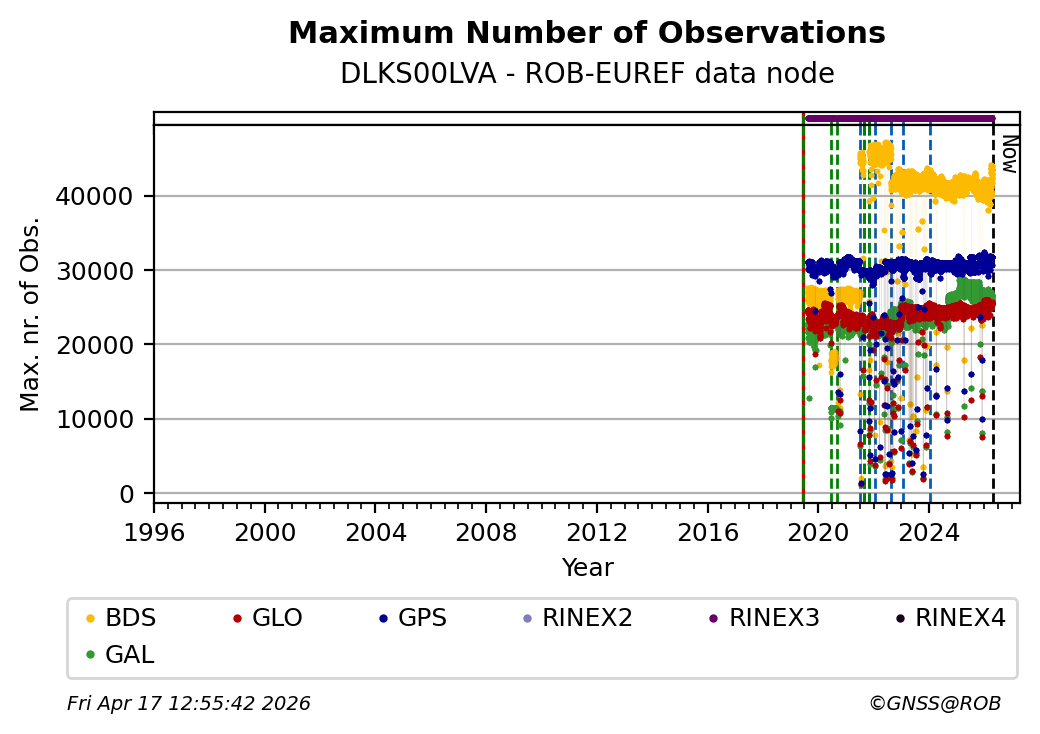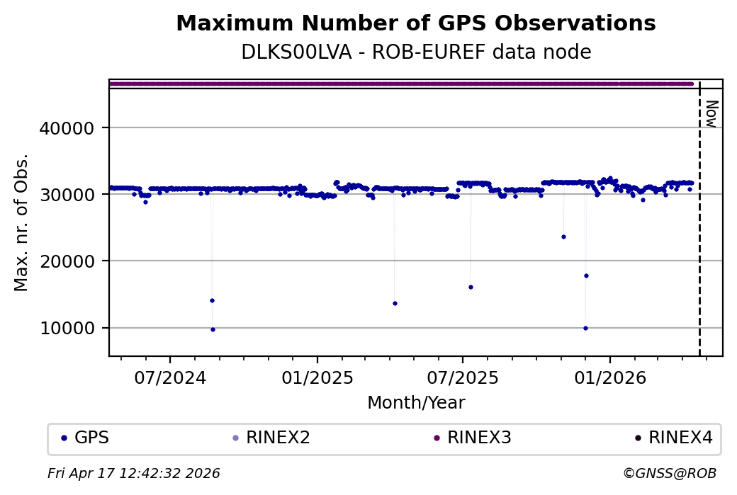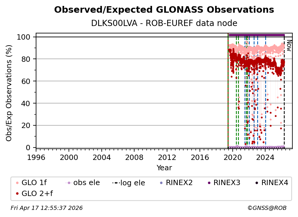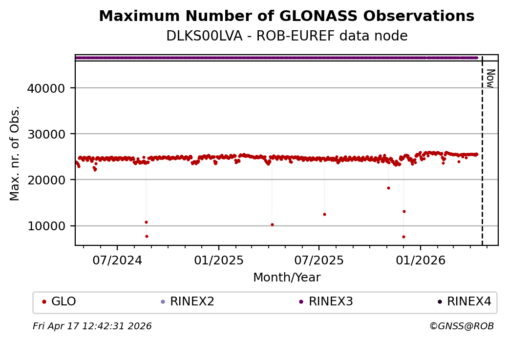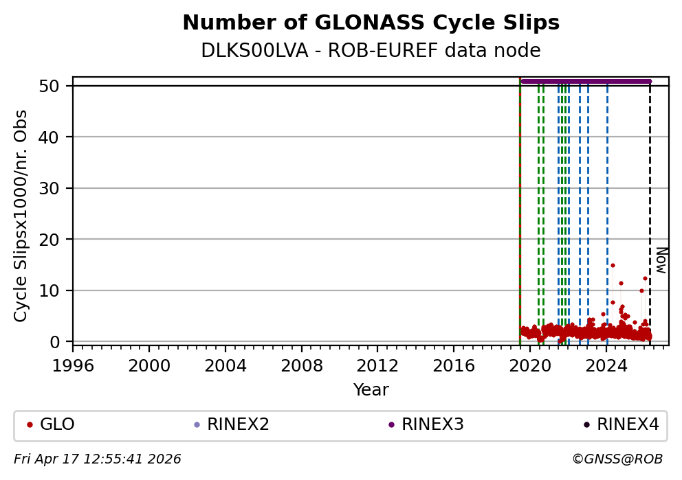The plots below present the long-term tracking performance of the EPOS-GNSS station DLKS00LVA based on the daily RINEX data available from the ROB-EUREF EPOS-GNSS data node. The data quality metrics have been computed at the data node using the G-Nut/Anubis software.