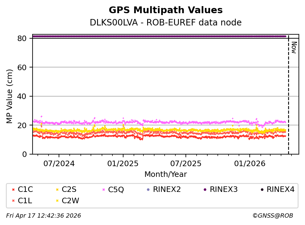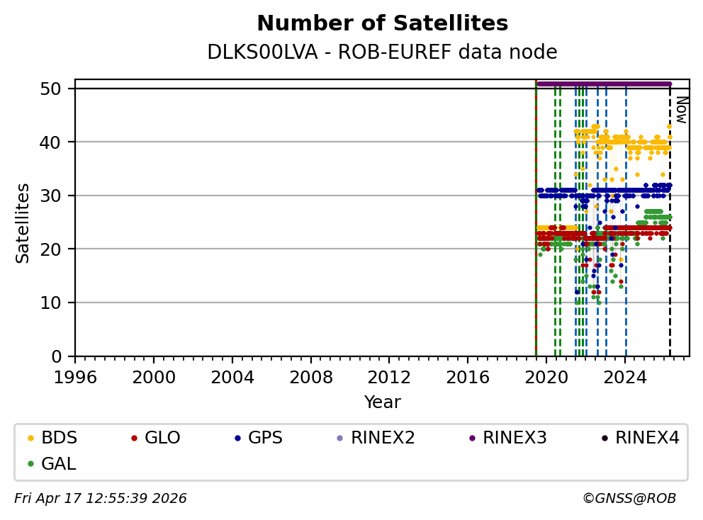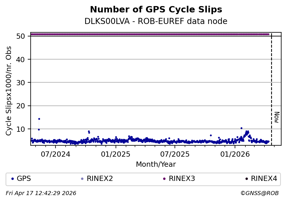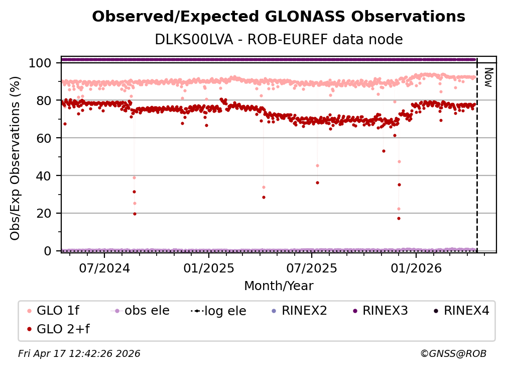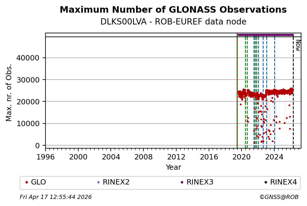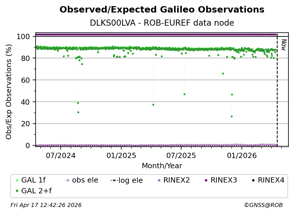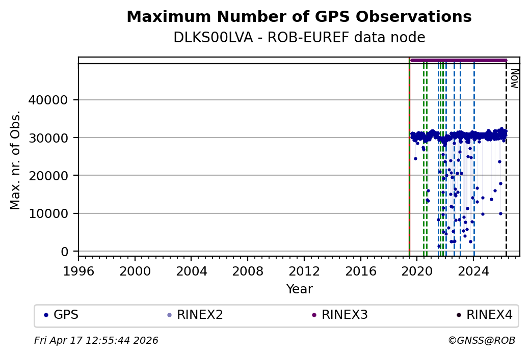 The plots below present the long-term tracking performance of the EPOS-GNSS station DLKS00LVA based on the daily RINEX data available from the ROB-EUREF EPOS-GNSS data node. The data quality metrics have been computed at the data node using the G-Nut/Anubis software.