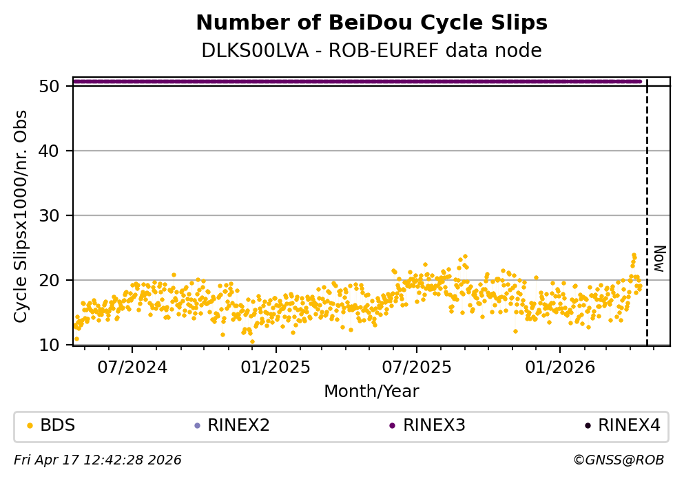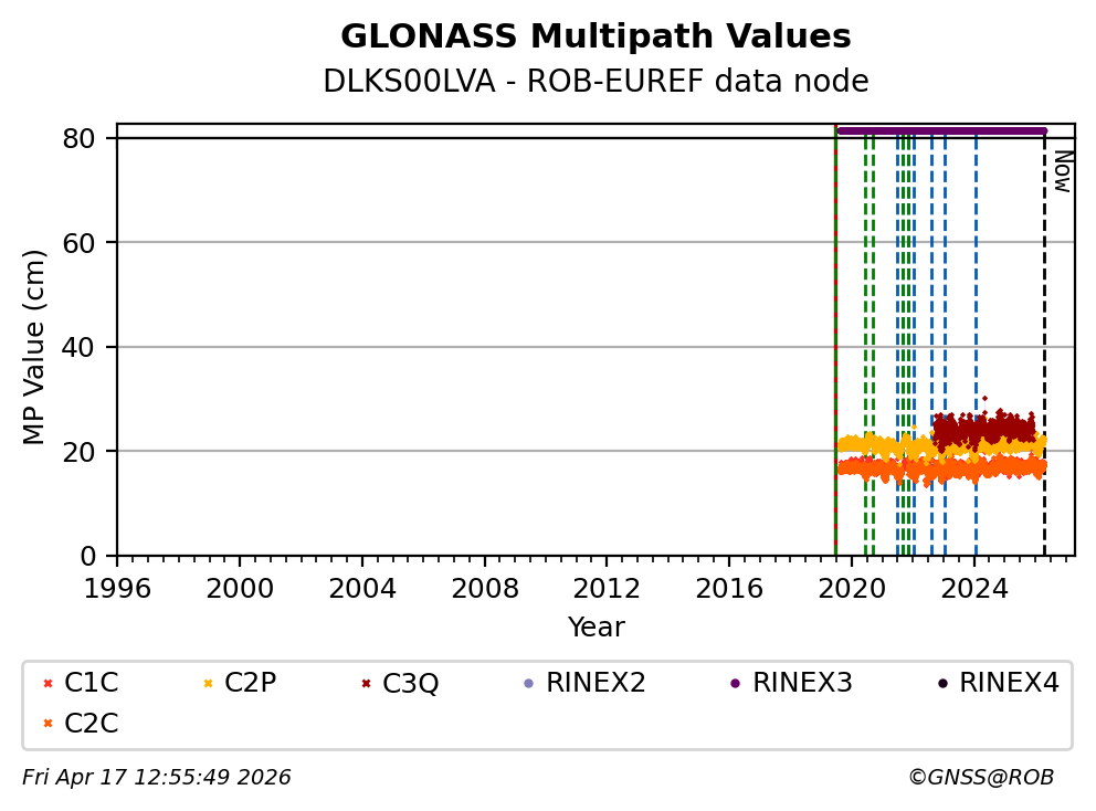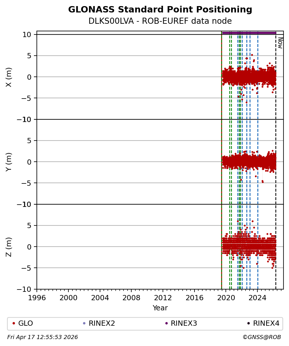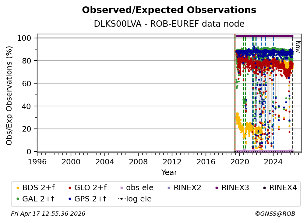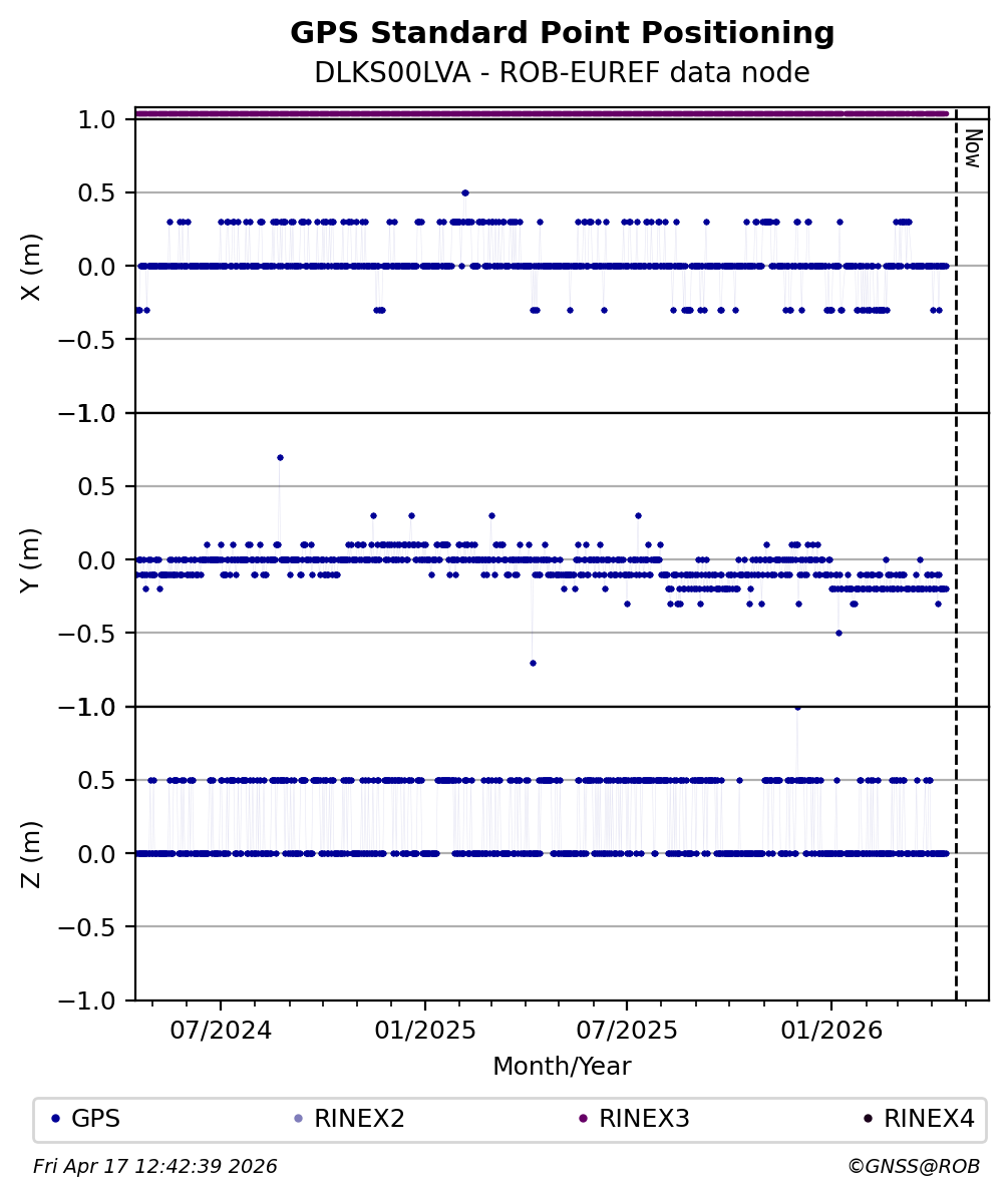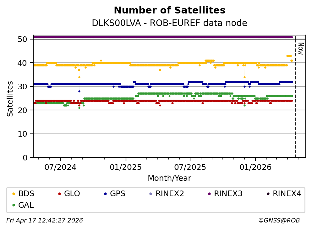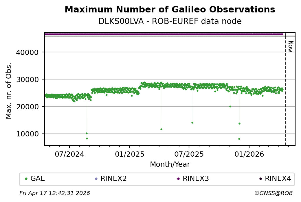 The plots below present the long-term tracking performance of the EPOS-GNSS station DLKS00LVA based on the daily RINEX data available from the ROB-EUREF EPOS-GNSS data node. The data quality metrics have been computed at the data node using the G-Nut/Anubis software.