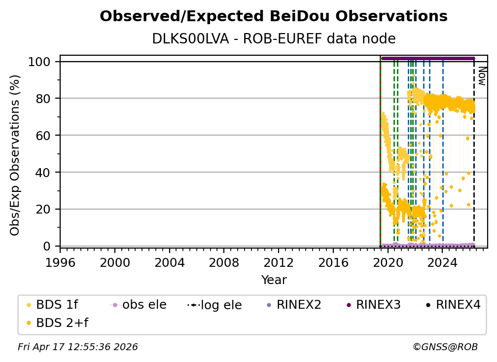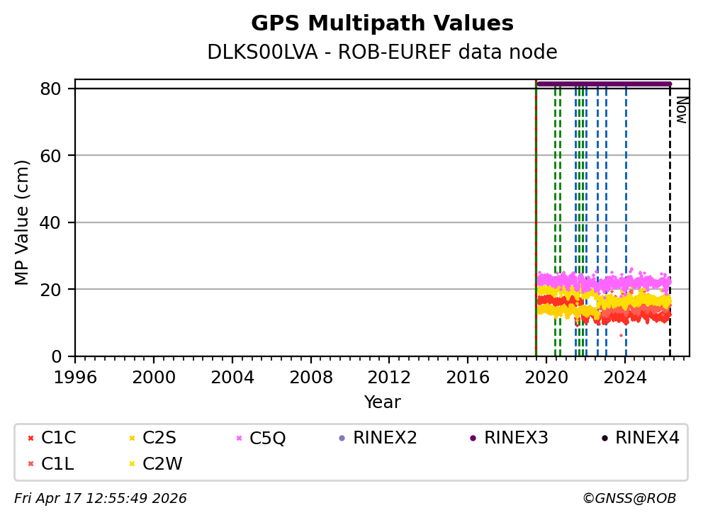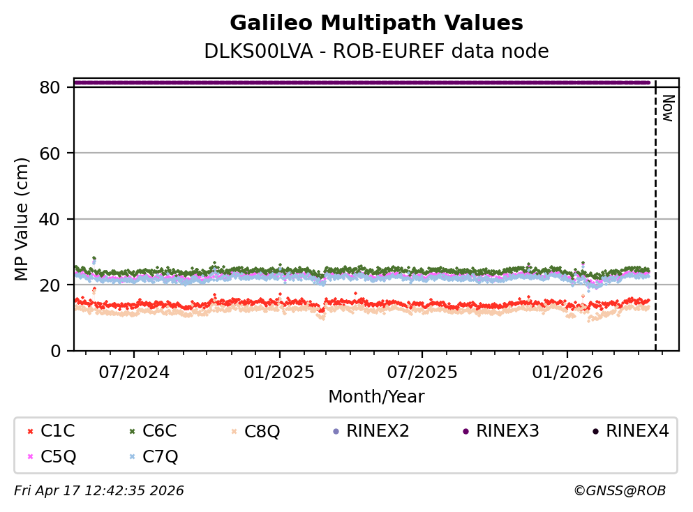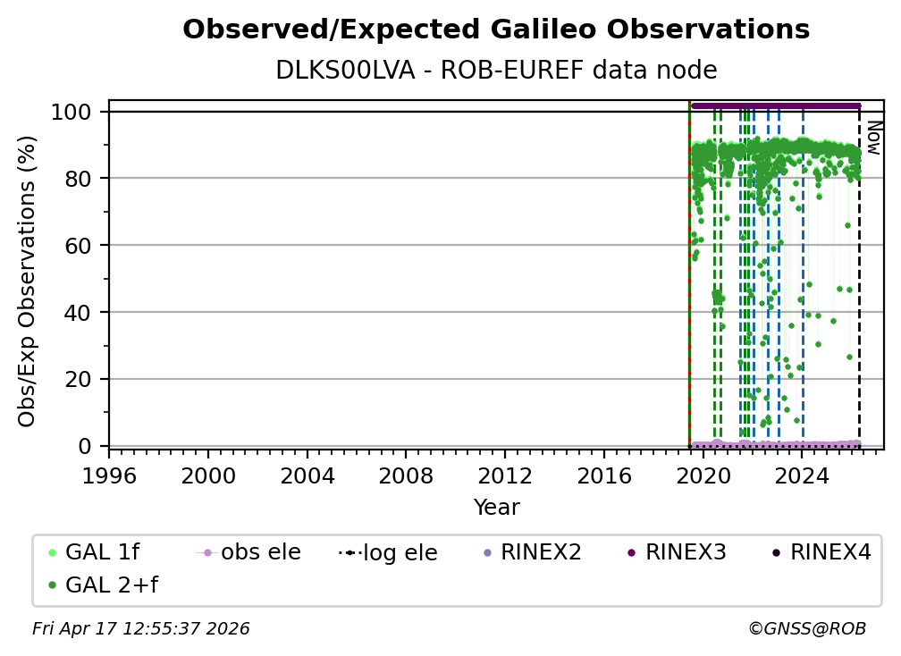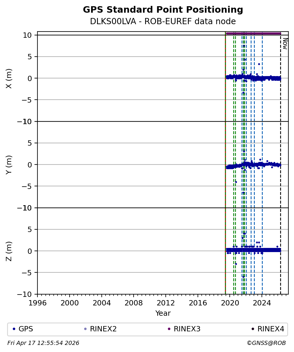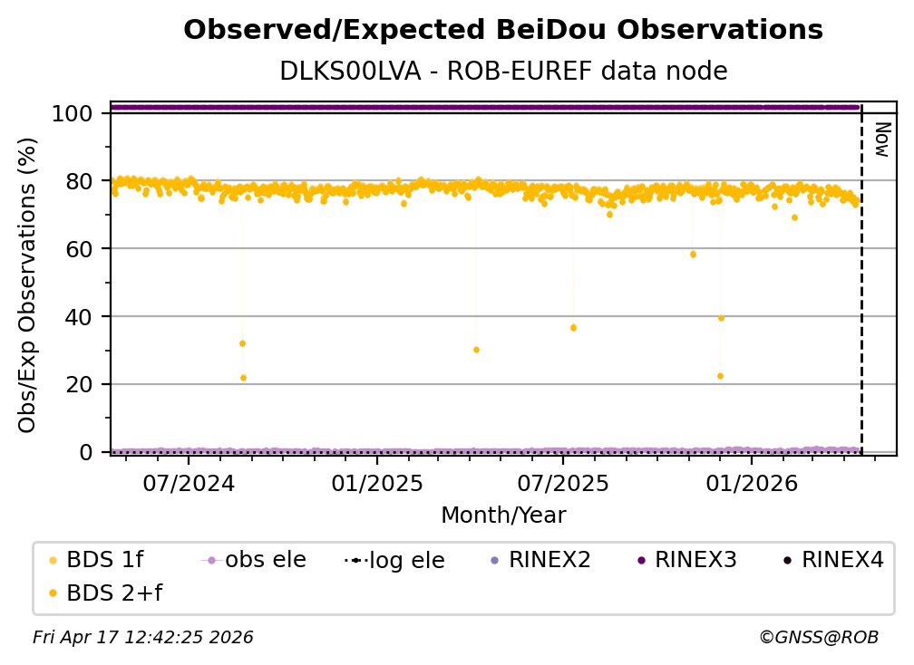 The plots below present the long-term tracking performance of the EPOS-GNSS station DLKS00LVA based on the daily RINEX data available from the ROB-EUREF EPOS-GNSS data node. The data quality metrics have been computed at the data node using the G-Nut/Anubis software.