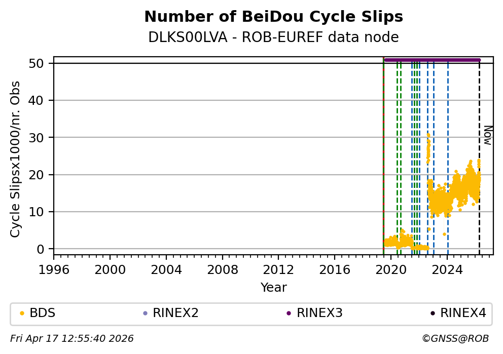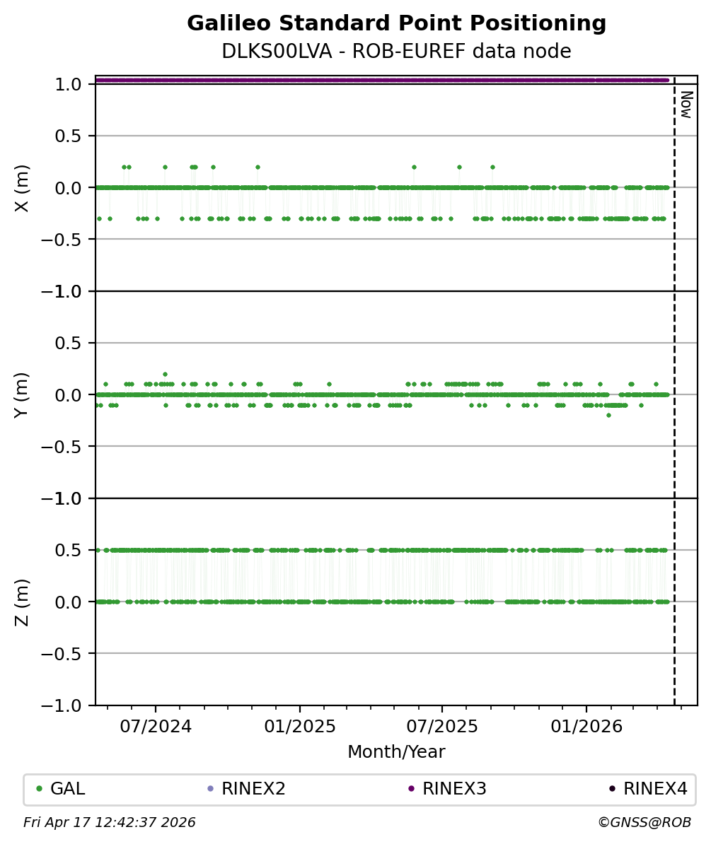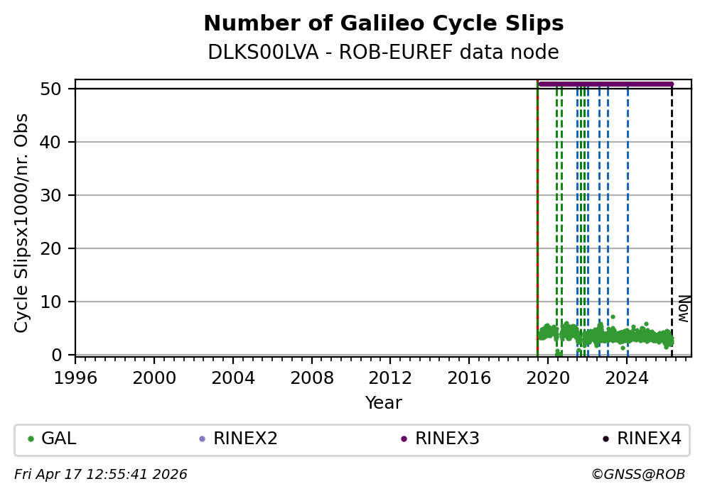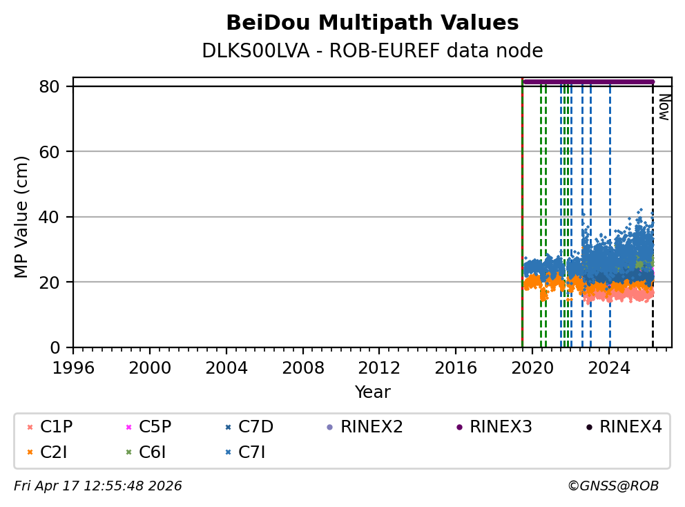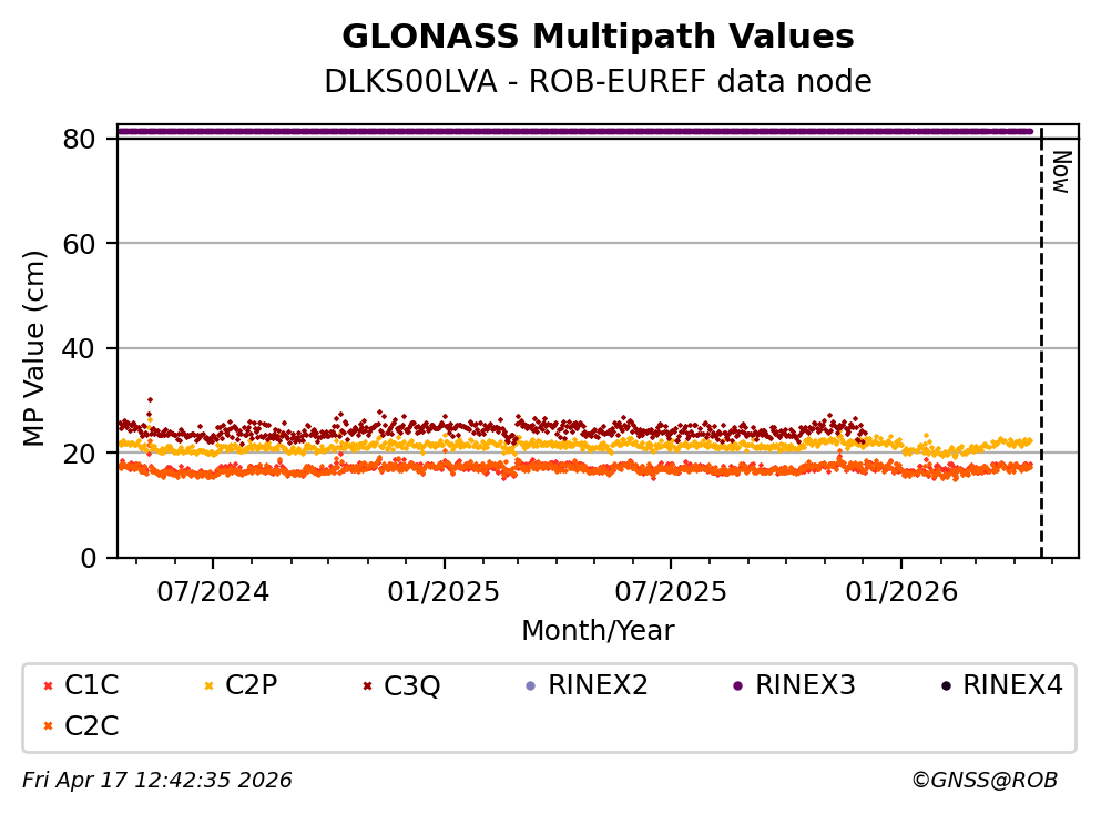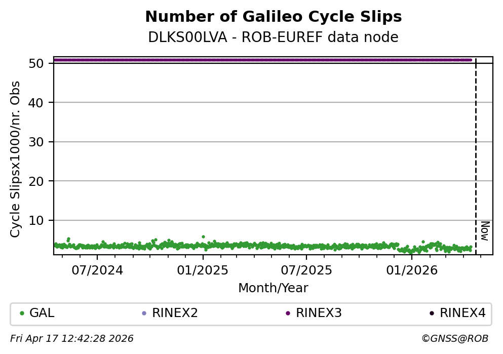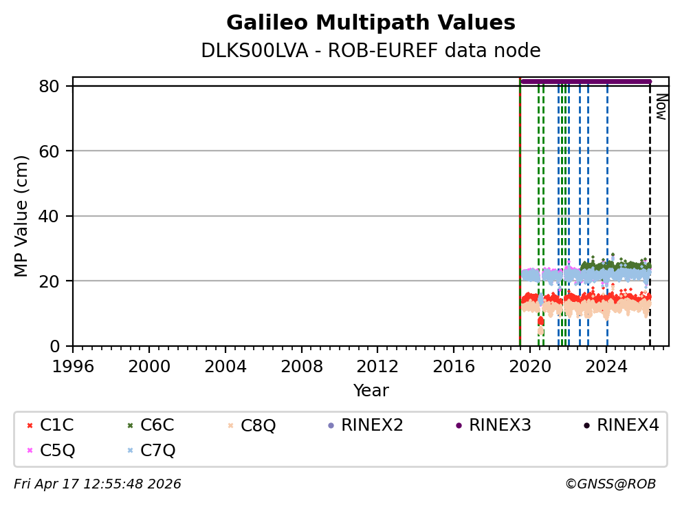 The plots below present the long-term tracking performance of the EPOS-GNSS station DLKS00LVA based on the daily RINEX data available from the ROB-EUREF EPOS-GNSS data node. The data quality metrics have been computed at the data node using the G-Nut/Anubis software.