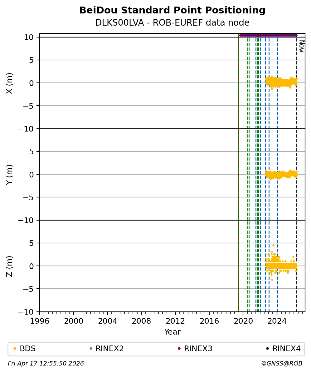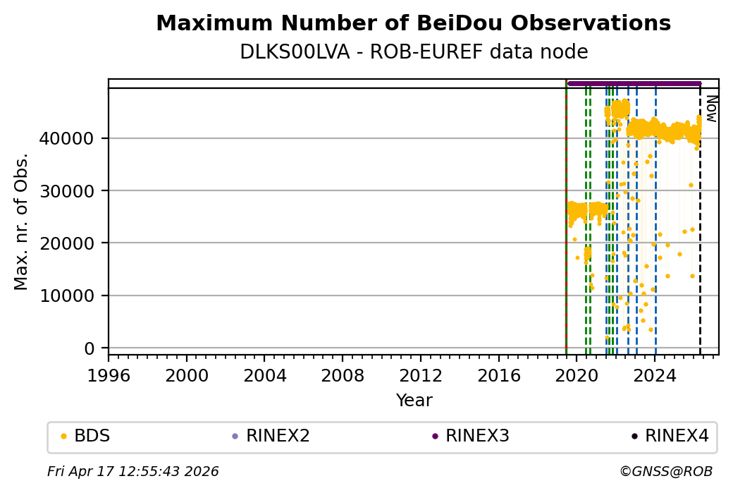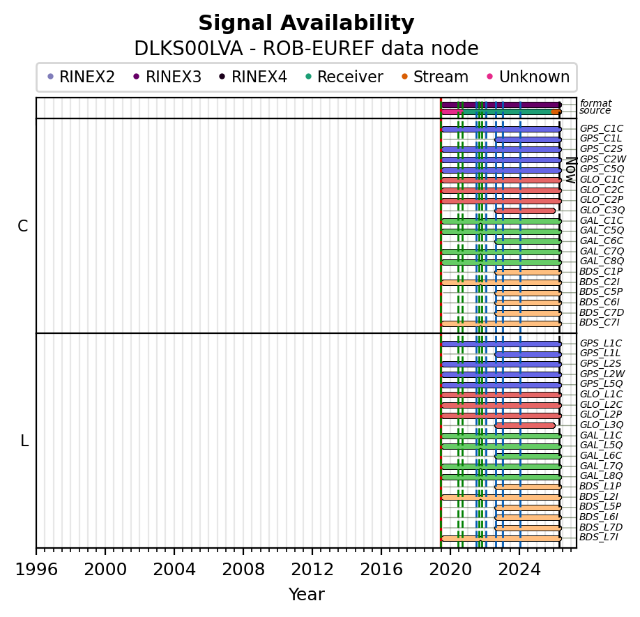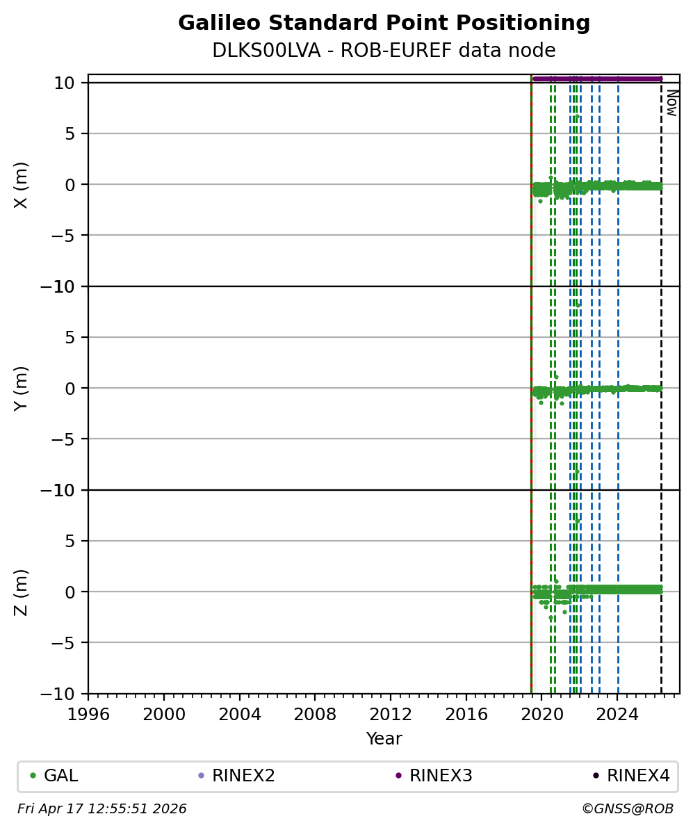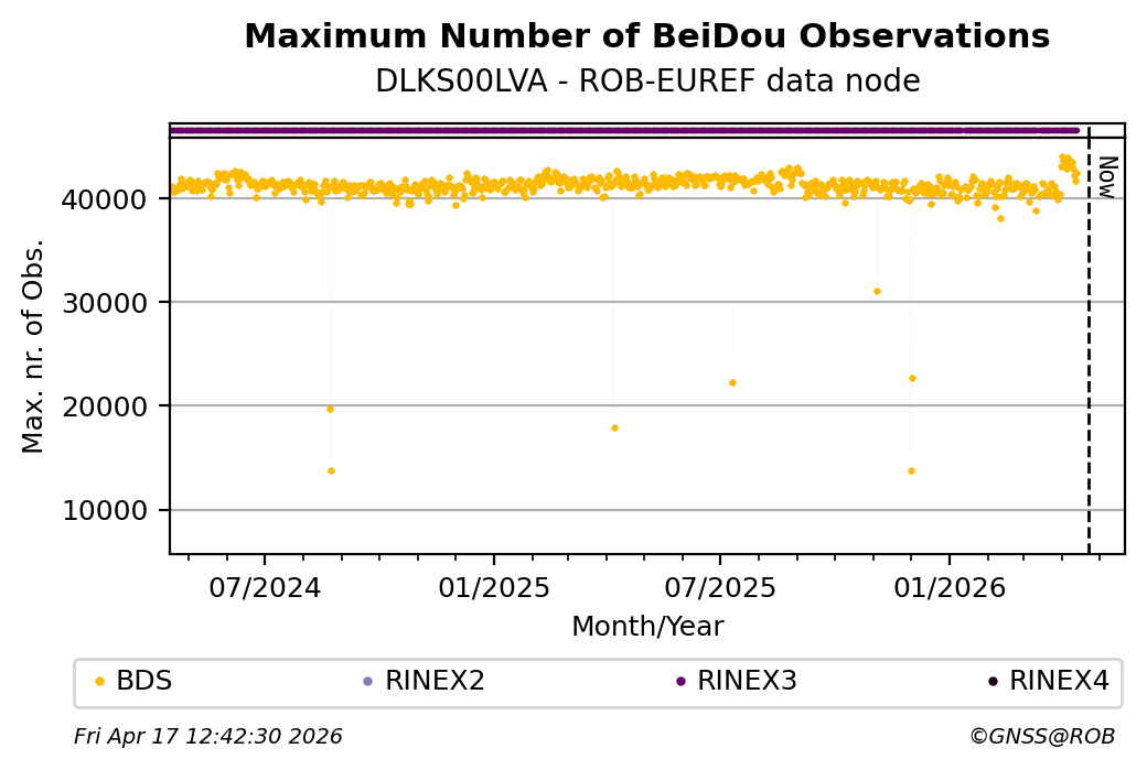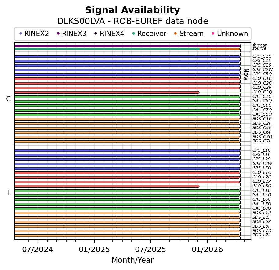 The plots below present the long-term tracking performance of the EPOS-GNSS station DLKS00LVA based on the daily RINEX data available from the ROB-EUREF EPOS-GNSS data node. The data quality metrics have been computed at the data node using the G-Nut/Anubis software.