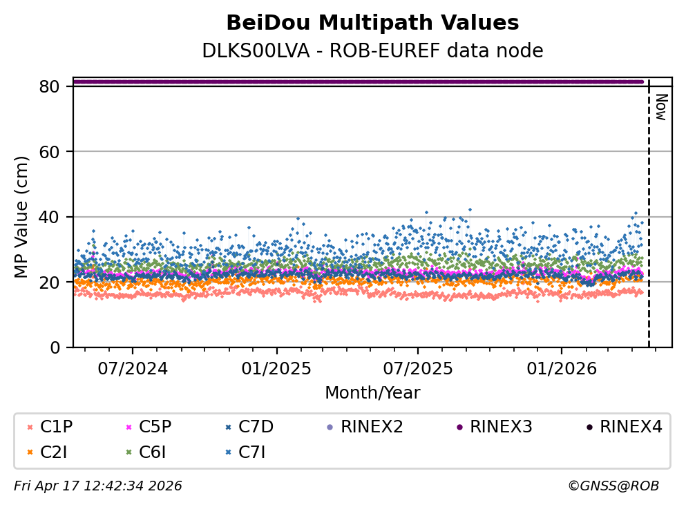 These plots display the daily mean of code multipath per frequency band and satellite constellation. Code multipath statistics are calculated for all pseudorange codes of all GNSS satellites providing dual-frequency carrier-phase observations. The code multipath characterizes the quality of the observed signal and the site environment.