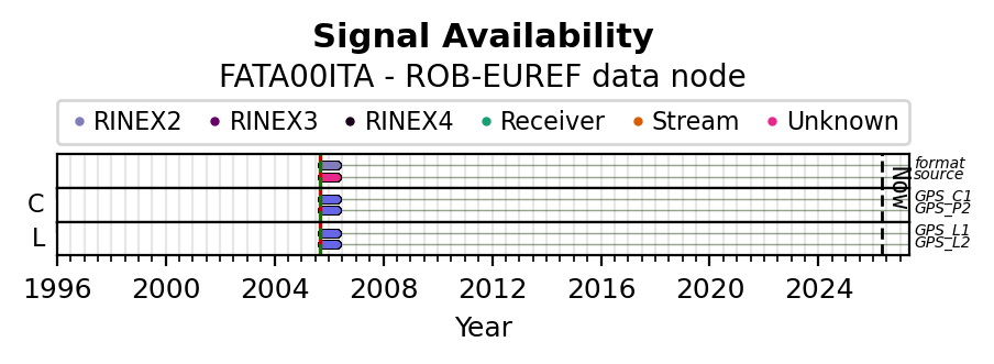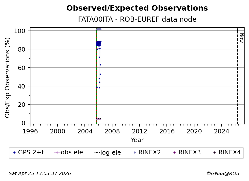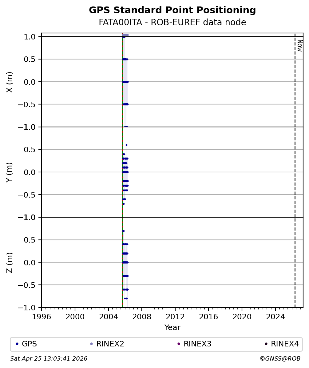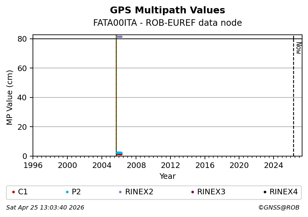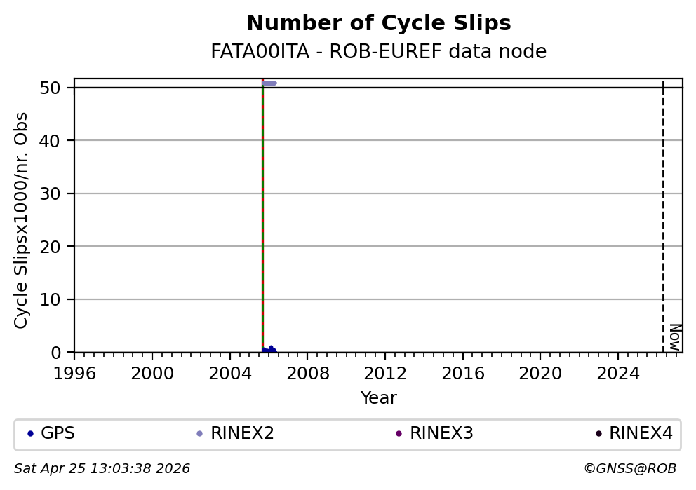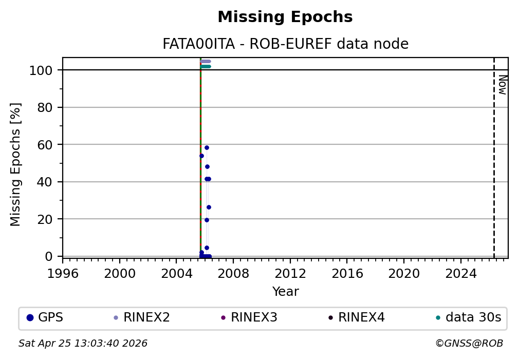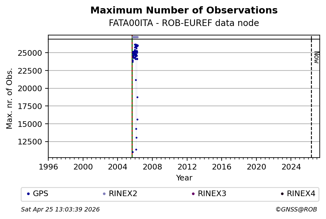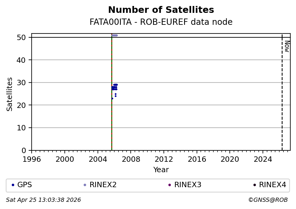 The plots below present the long-term tracking performance of the EPOS-GNSS station FATA00ITA based on the daily RINEX data available from the ROB-EUREF EPOS-GNSS data node. The data quality metrics have been computed at the data node using the G-Nut/Anubis software. Input files are the daily RINEX (V2 or V3) observation files available from ROB-EUREF EPOS-GNSS data node.