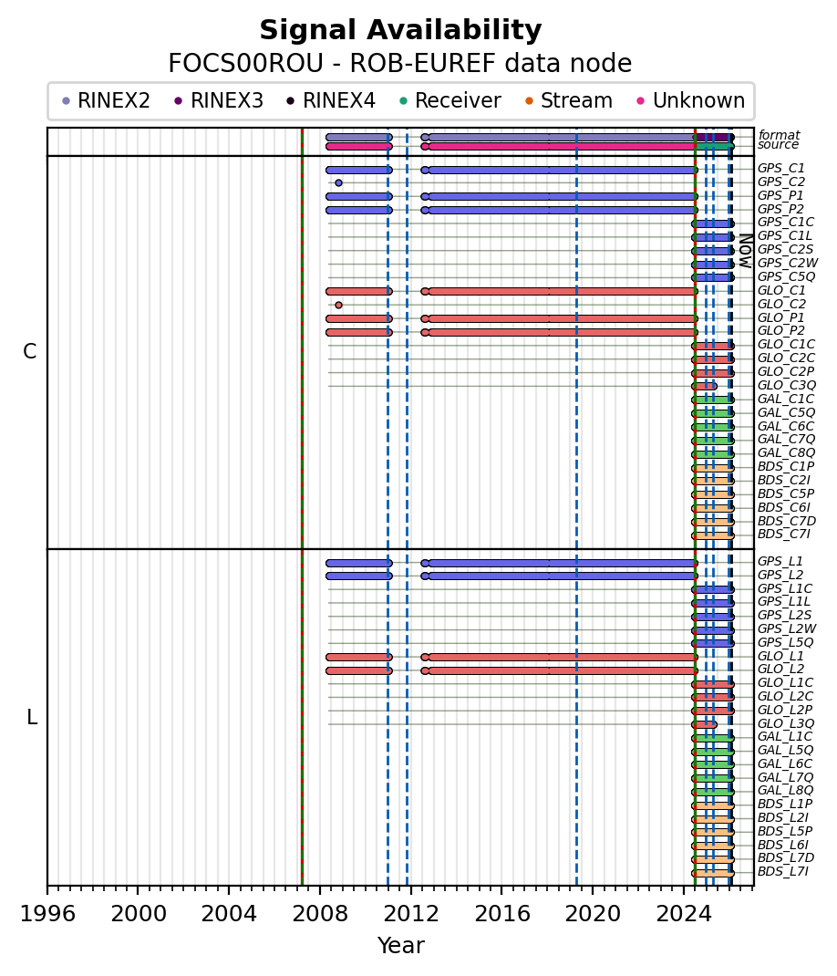 Red vertical lines, green and blue vertical dotted lines indicate respectively a change of antenna, receiver or receiver configuration (including firmware) as indicated by the station manager in the station site log available from the M3G GNSS Metadata Catalog. The purple points in the top of the plot indicate the daily RINEX data availability at the data node.