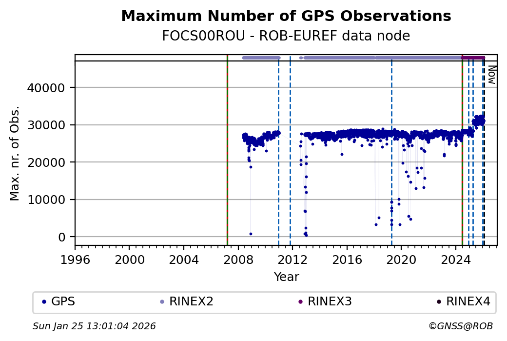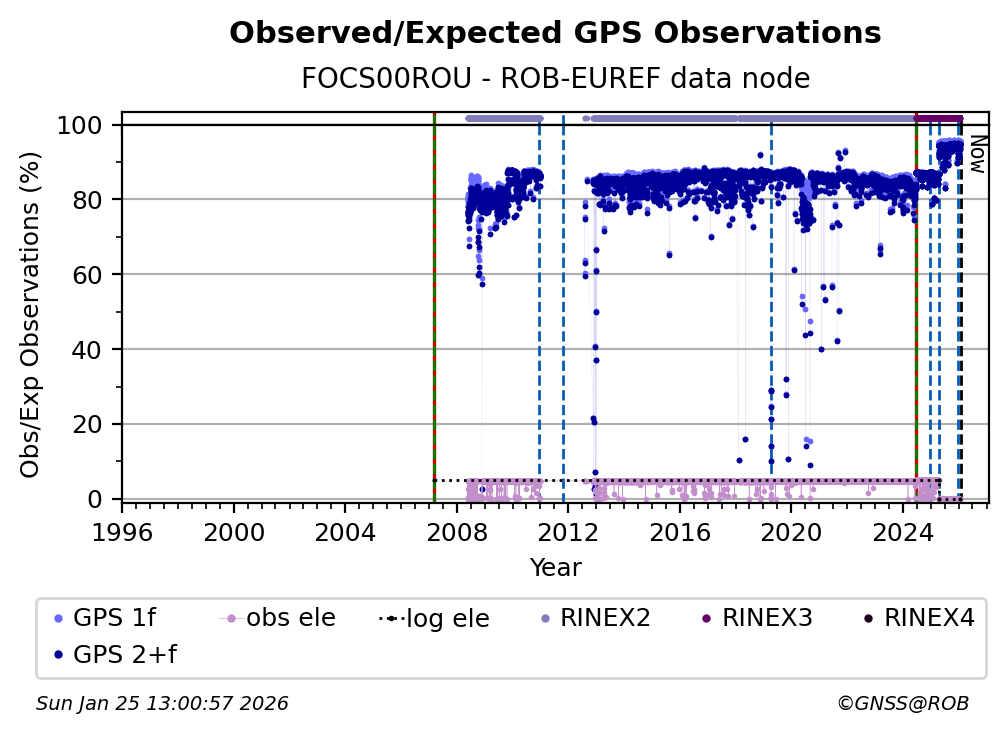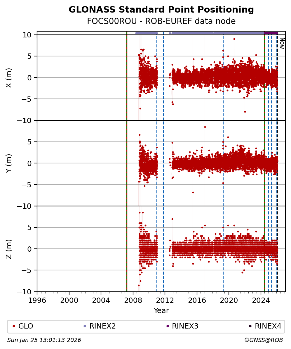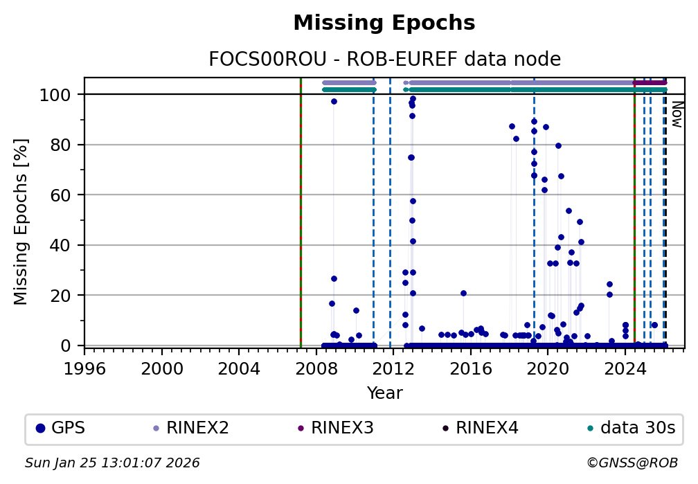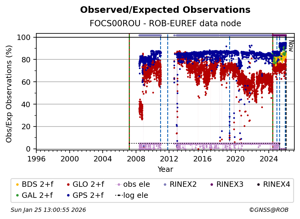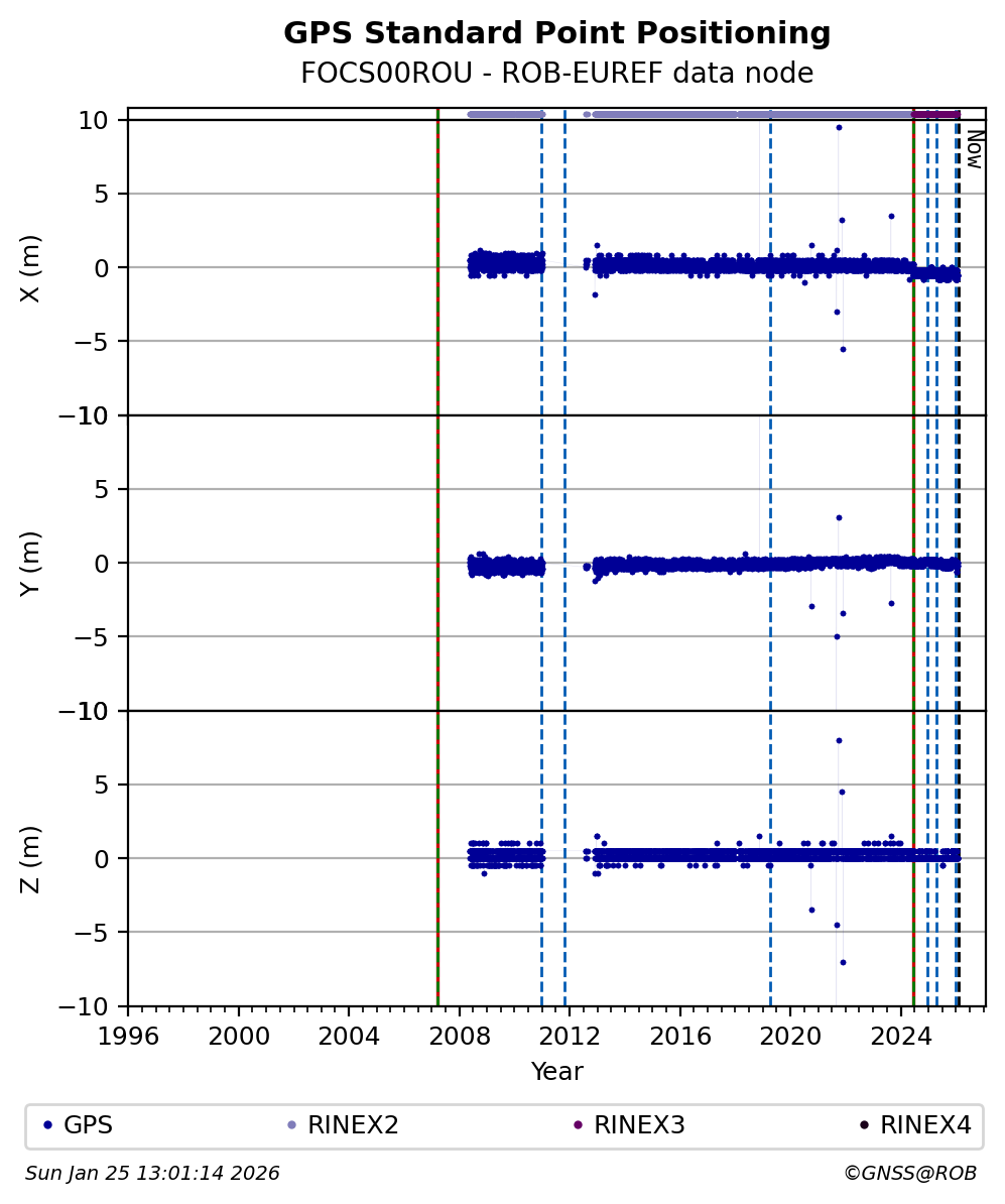 The plots below present the long-term tracking performance of the EPOS-GNSS station FOCS00ROU based on the daily RINEX data available from the ROB-EUREF EPOS-GNSS data node. The data quality metrics have been computed at the data node using the G-Nut/Anubis software.