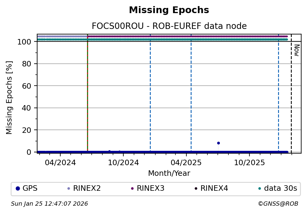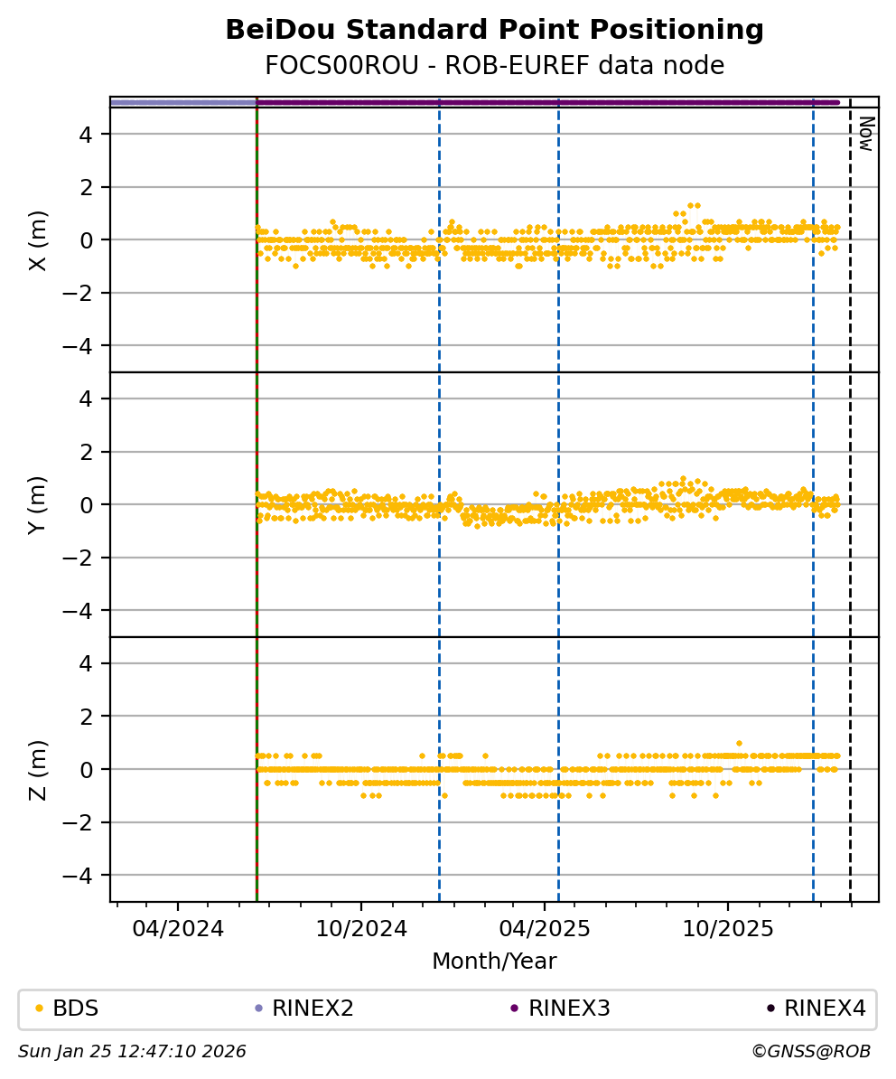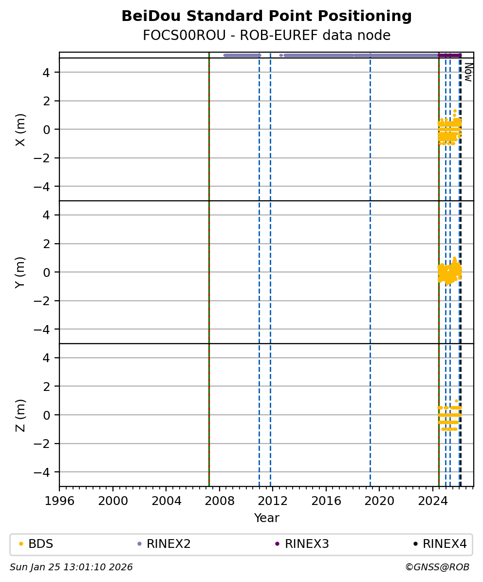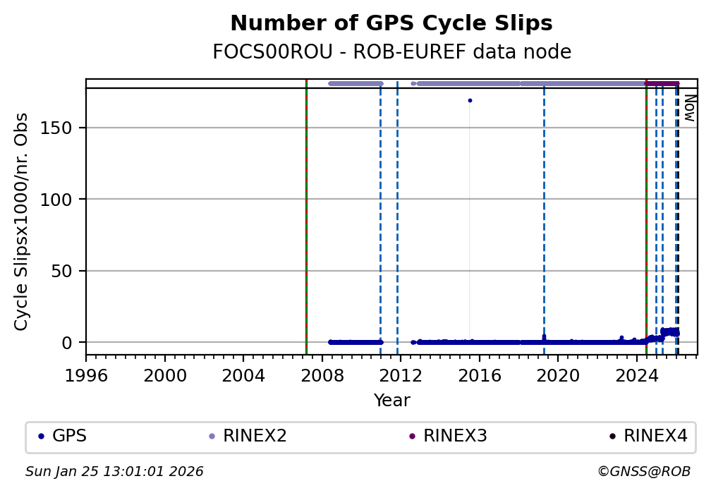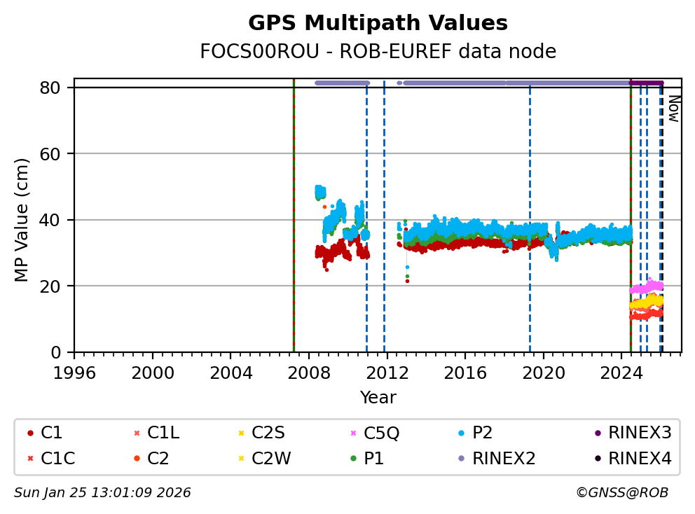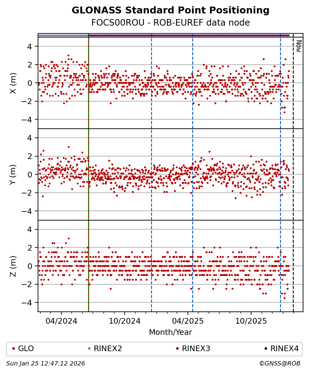 The plots below present the long-term tracking performance of the EPOS-GNSS station FOCS00ROU based on the daily RINEX data available from the ROB-EUREF EPOS-GNSS data node. The data quality metrics have been computed at the data node using the G-Nut/Anubis software.