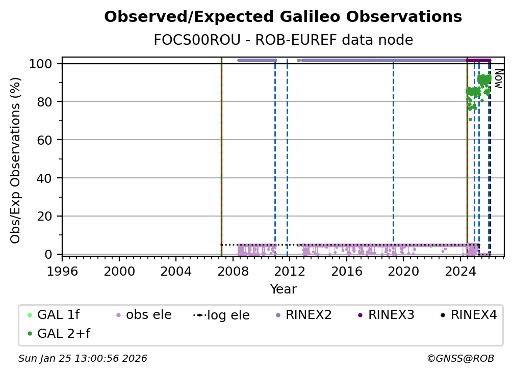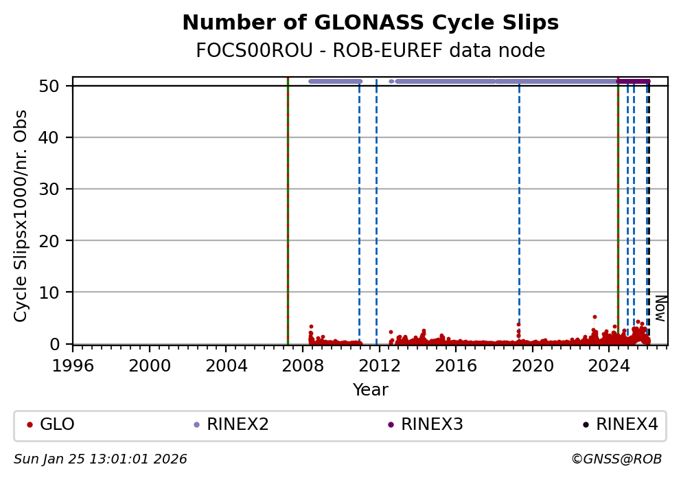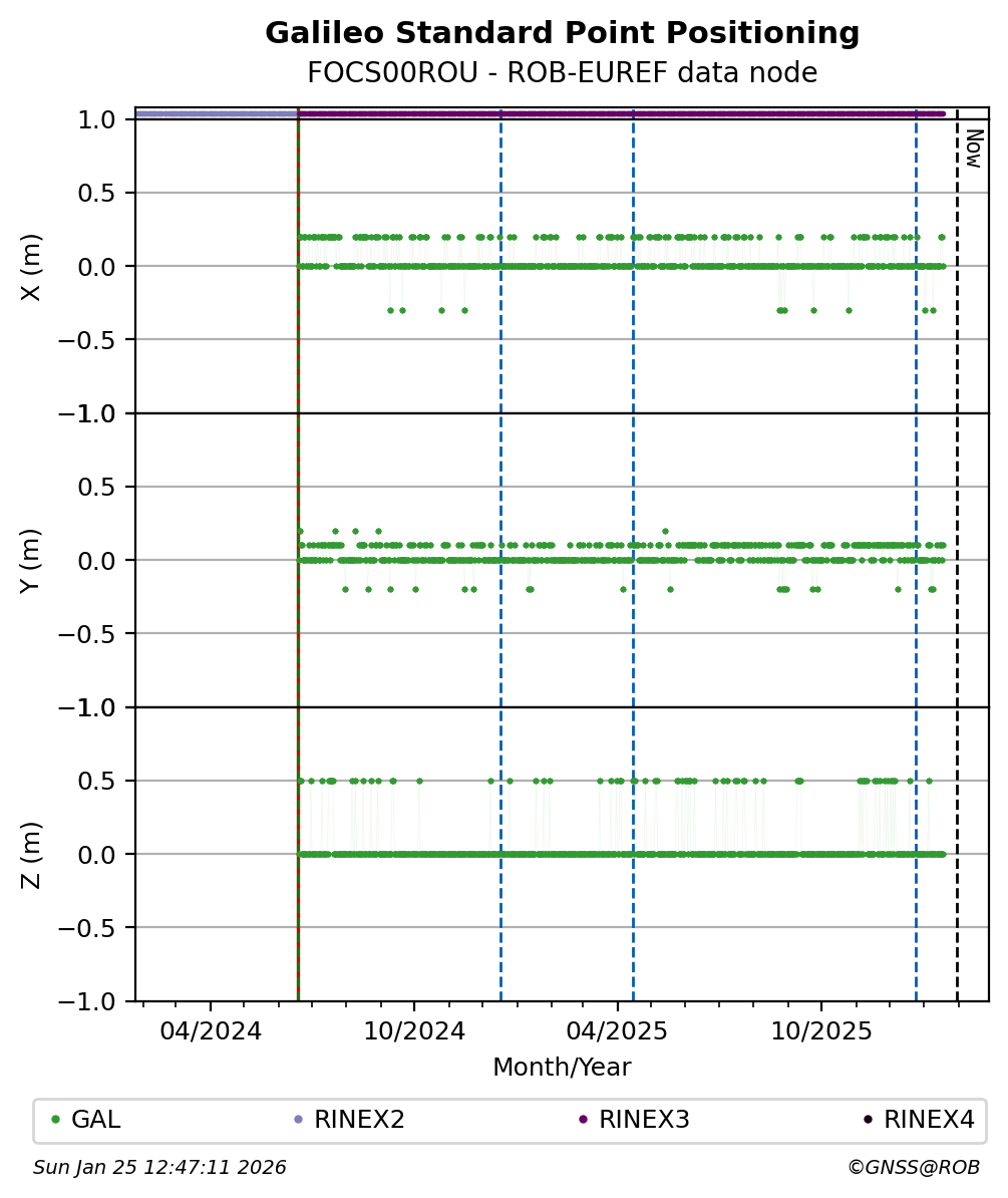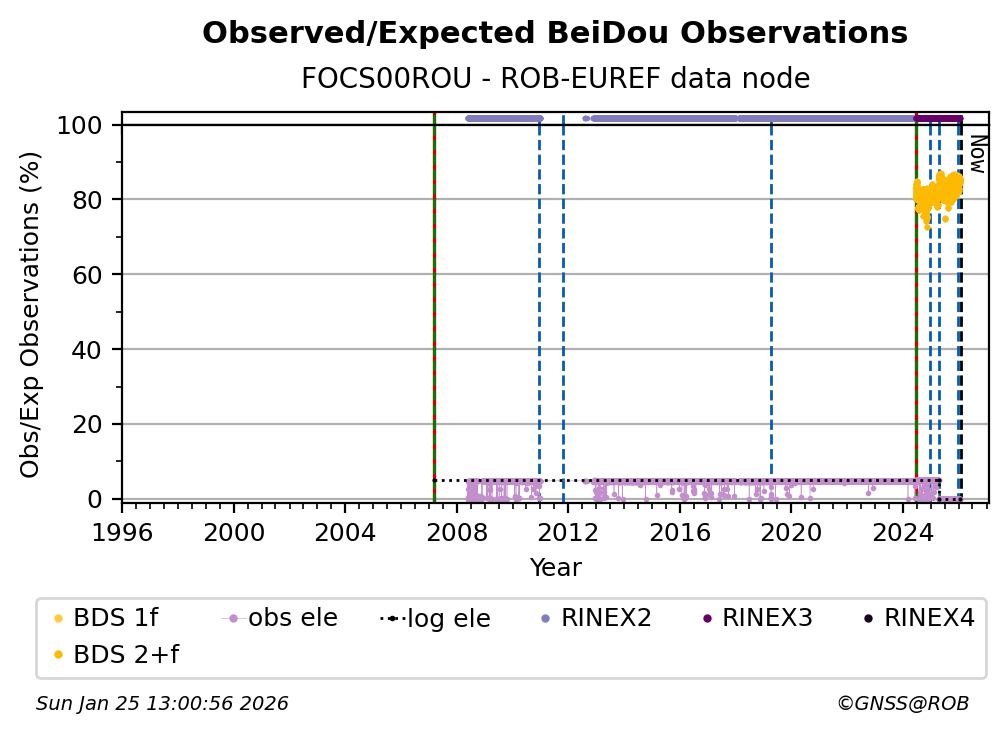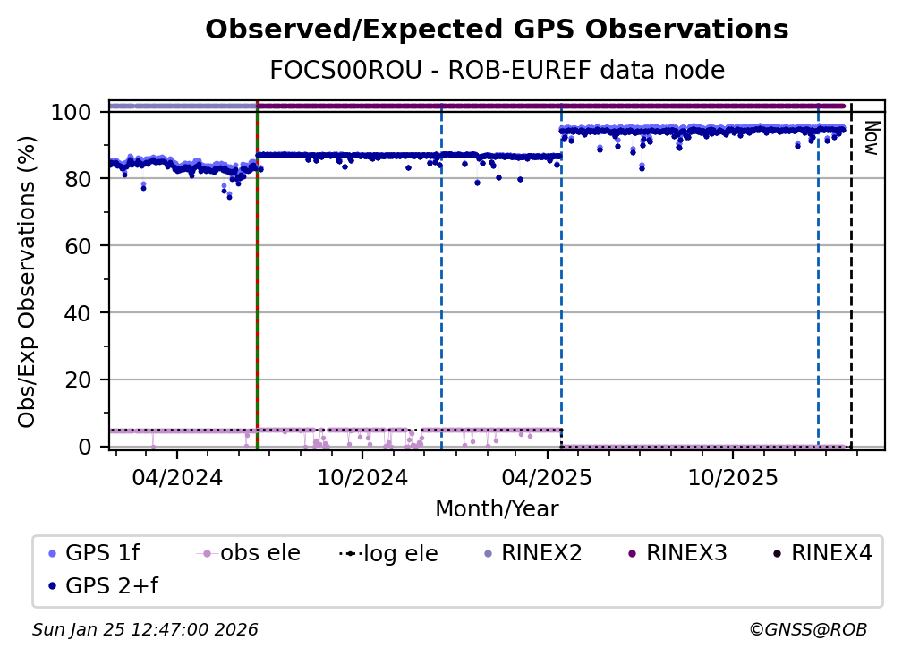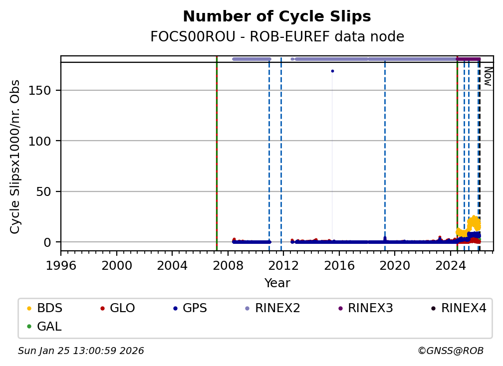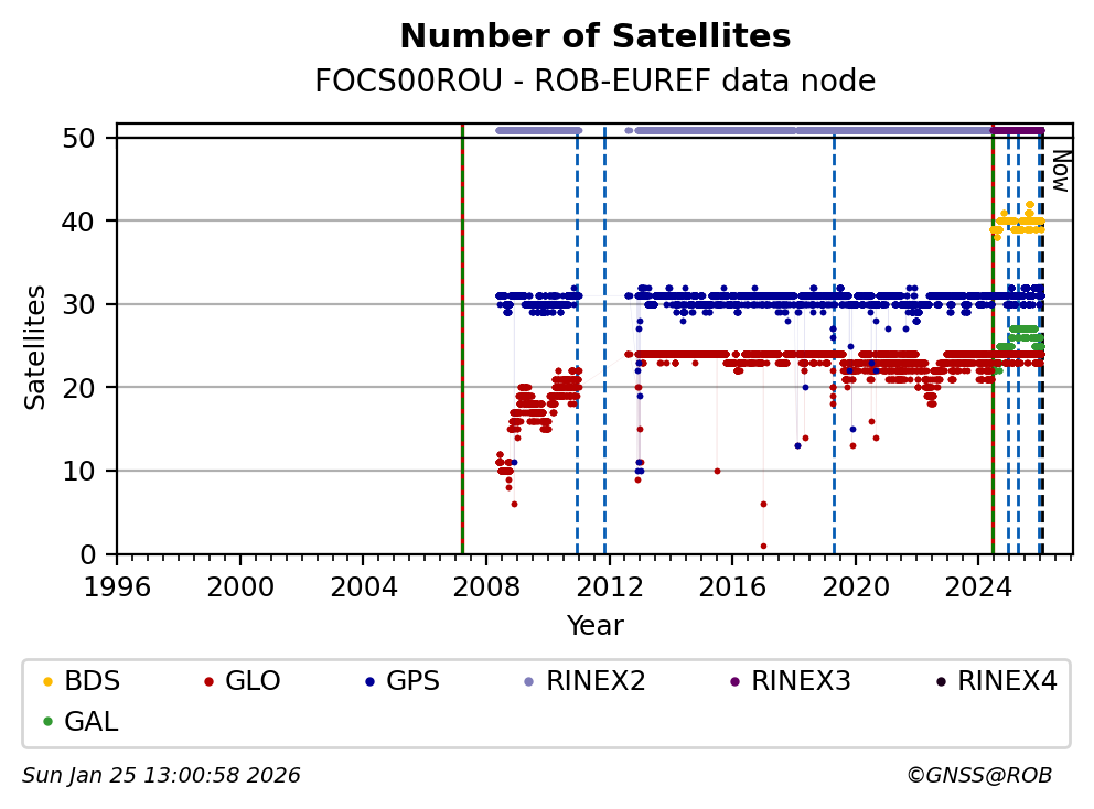 The plots below present the long-term tracking performance of the EPOS-GNSS station FOCS00ROU based on the daily RINEX data available from the ROB-EUREF EPOS-GNSS data node. The data quality metrics have been computed at the data node using the G-Nut/Anubis software.