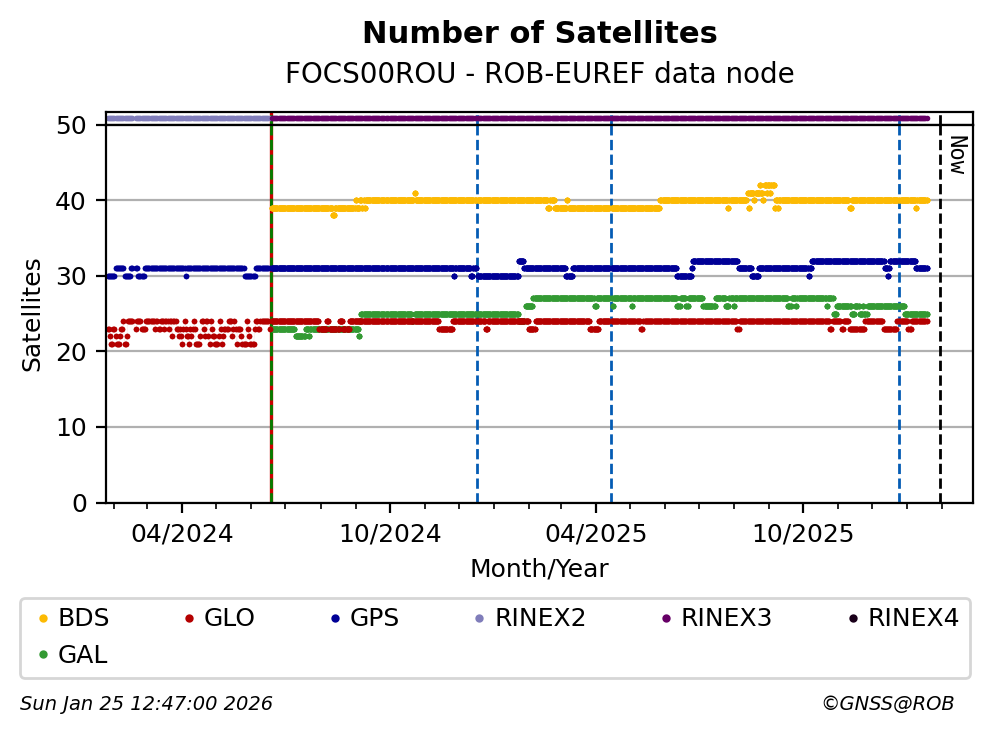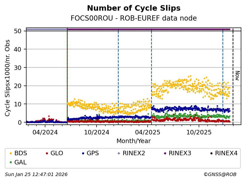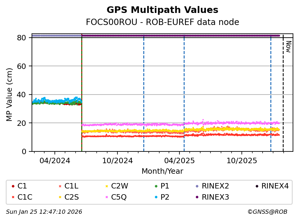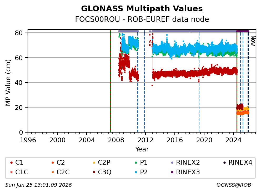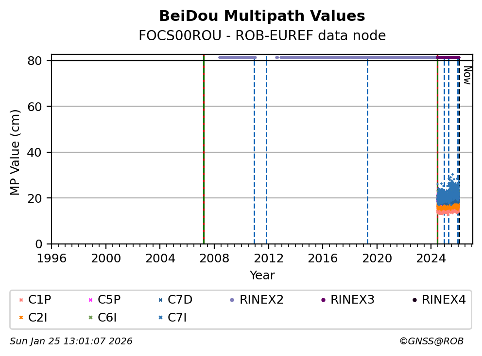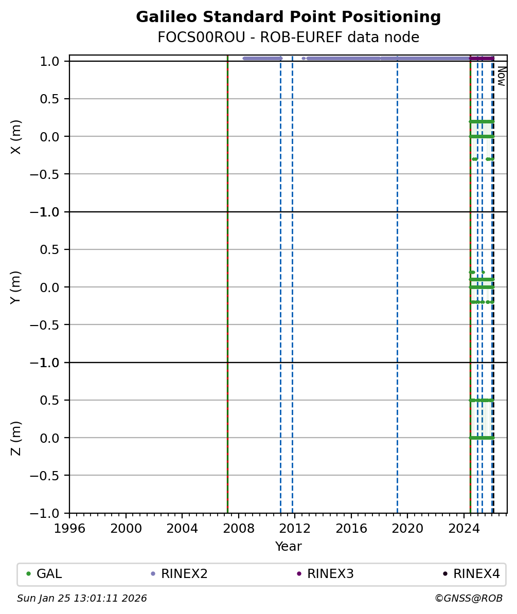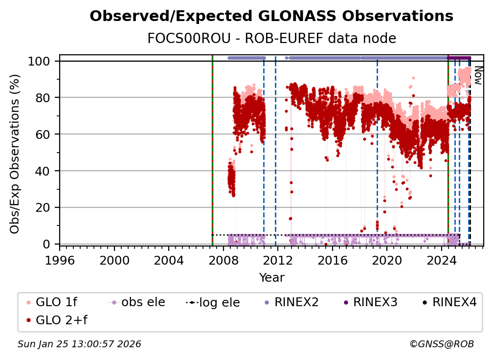 The plots below present the long-term tracking performance of the EPOS-GNSS station FOCS00ROU based on the daily RINEX data available from the ROB-EUREF EPOS-GNSS data node. The data quality metrics have been computed at the data node using the G-Nut/Anubis software.