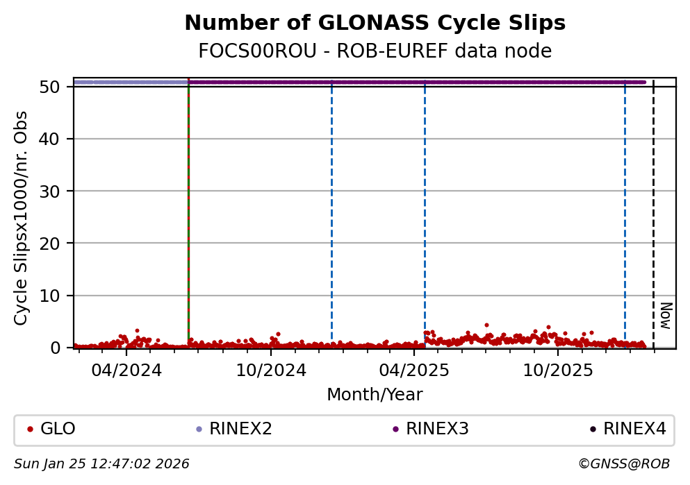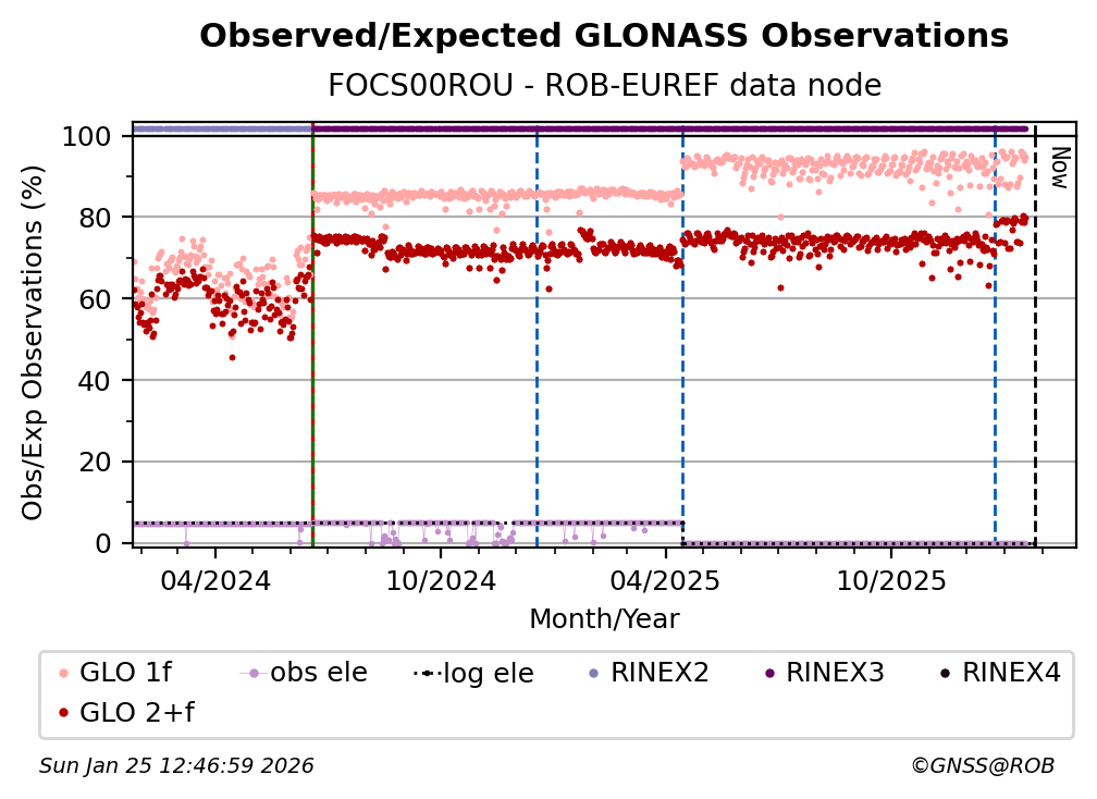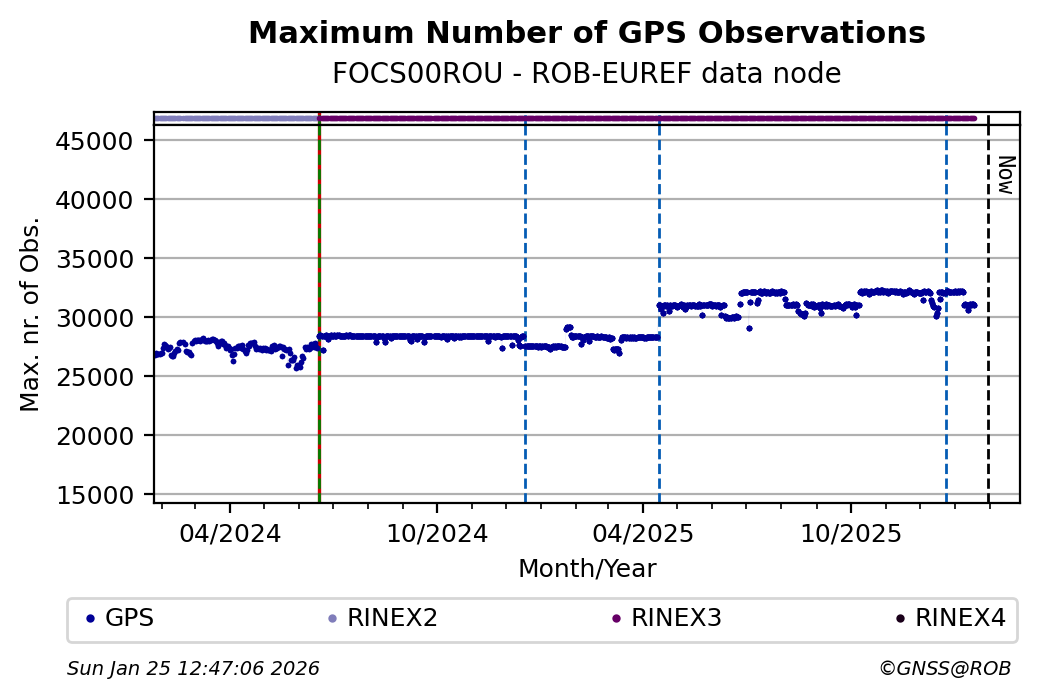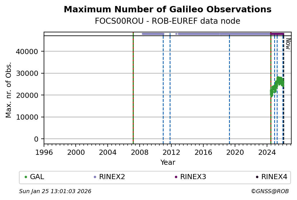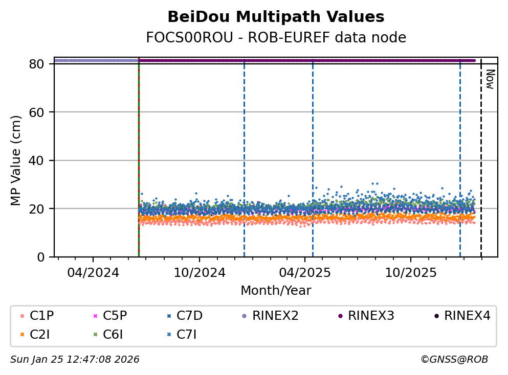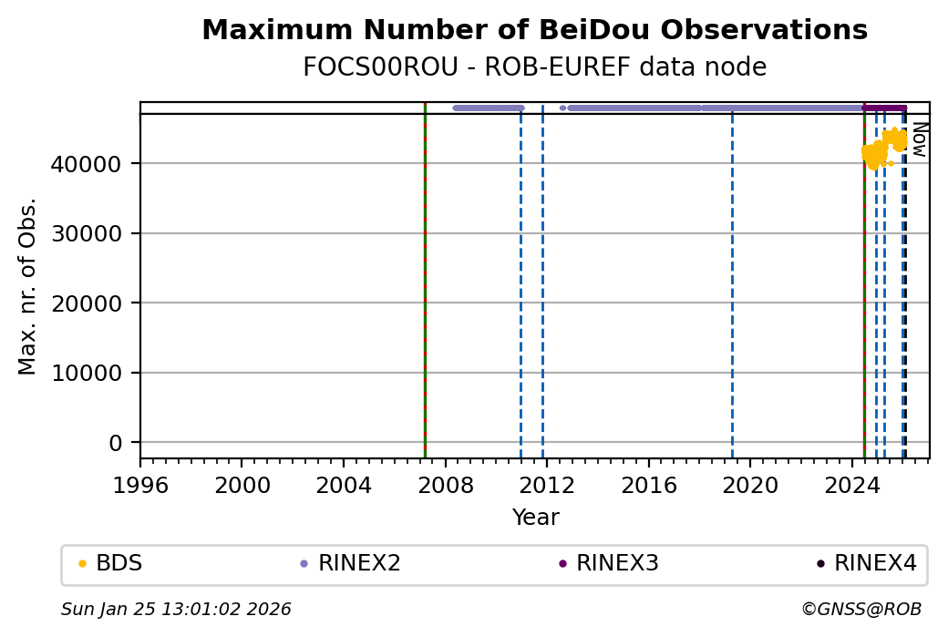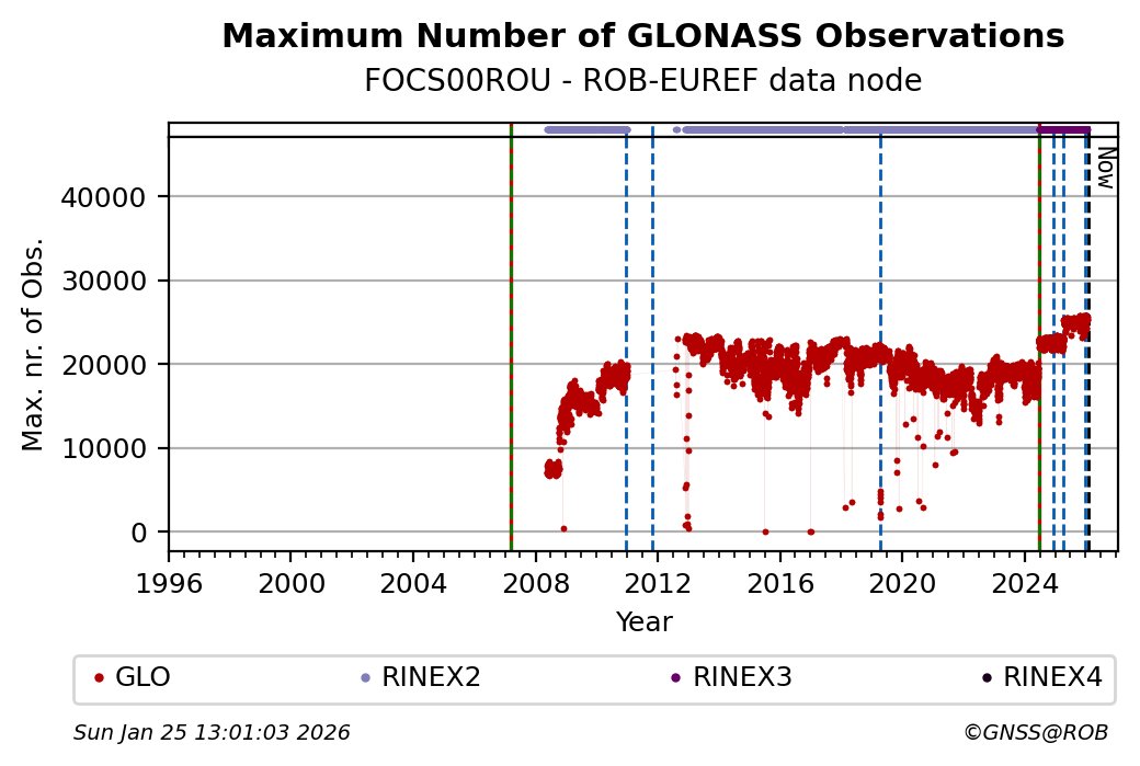 The plots below present the long-term tracking performance of the EPOS-GNSS station FOCS00ROU based on the daily RINEX data available from the ROB-EUREF EPOS-GNSS data node. The data quality metrics have been computed at the data node using the G-Nut/Anubis software.