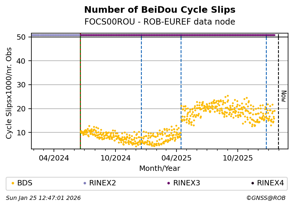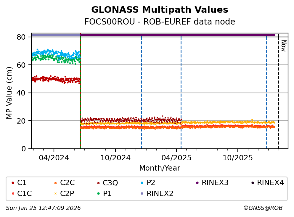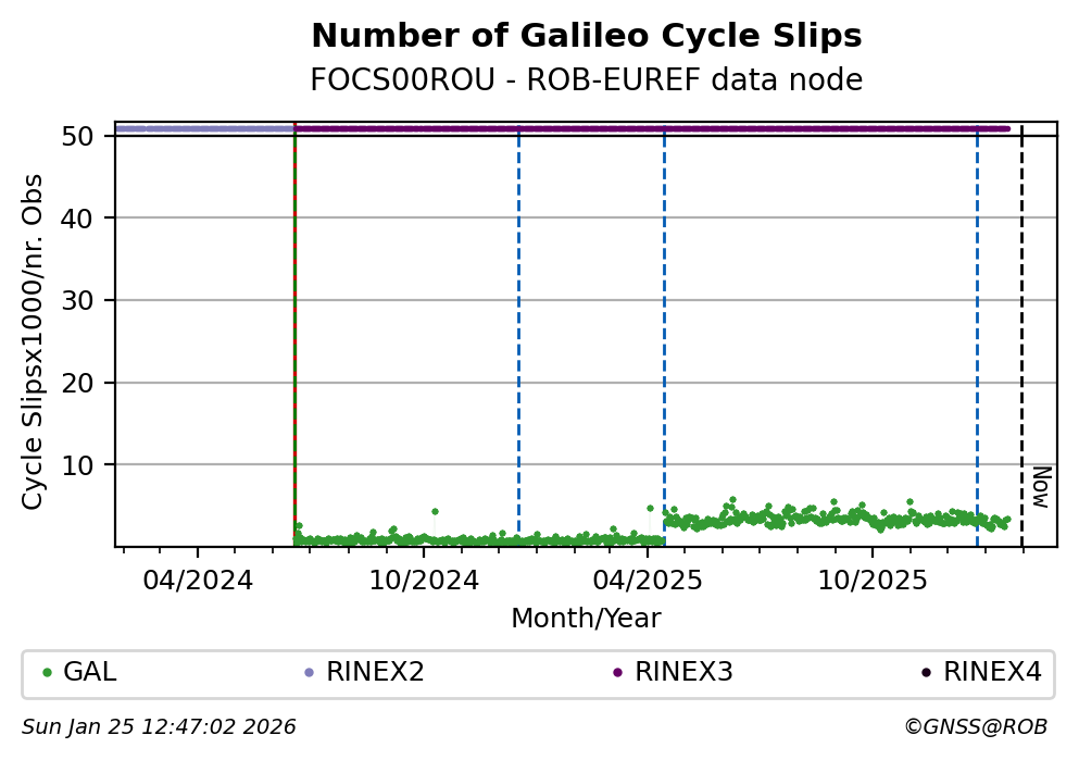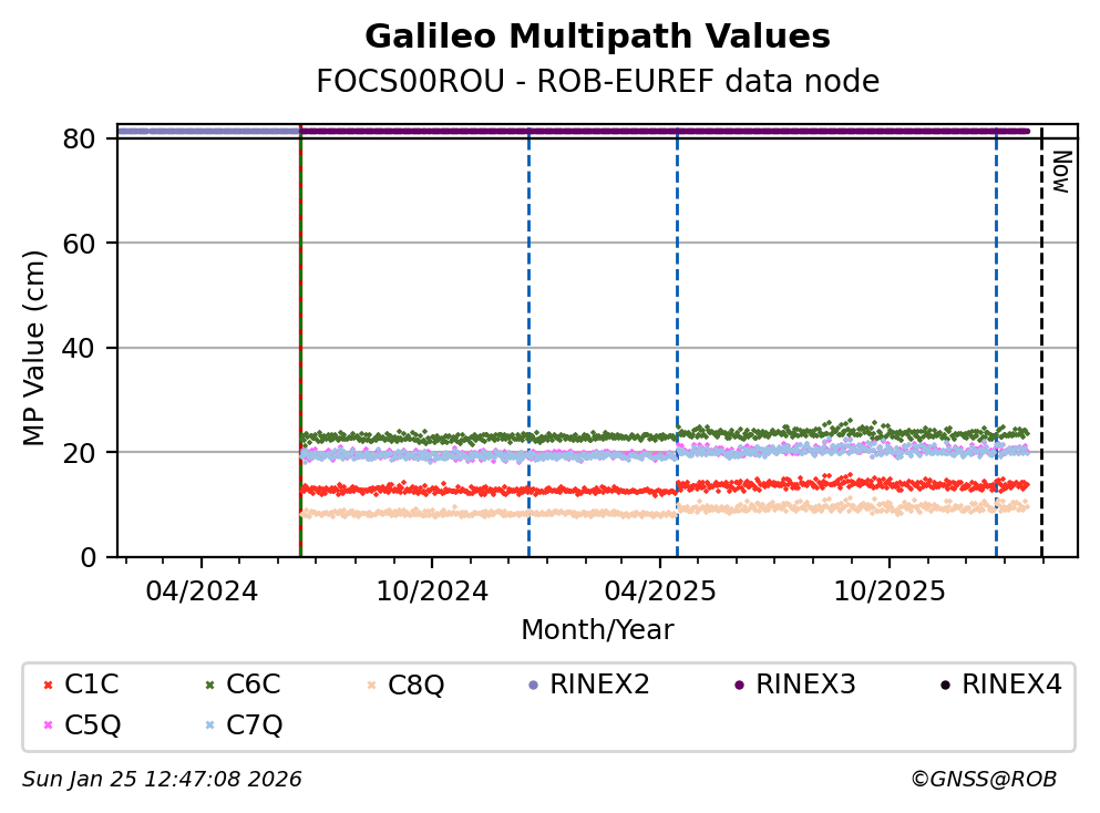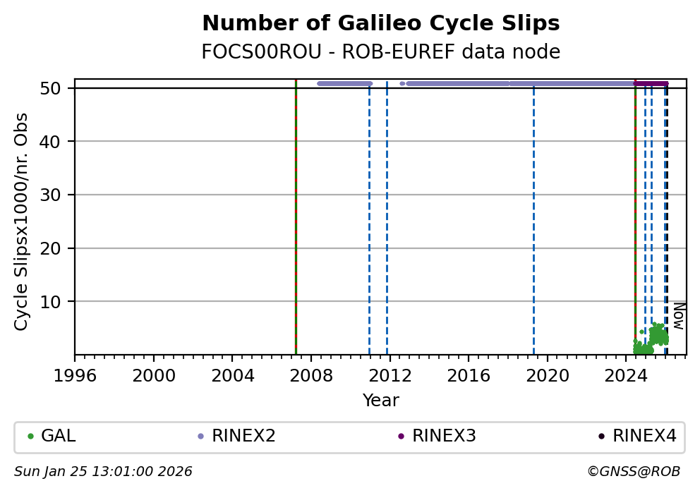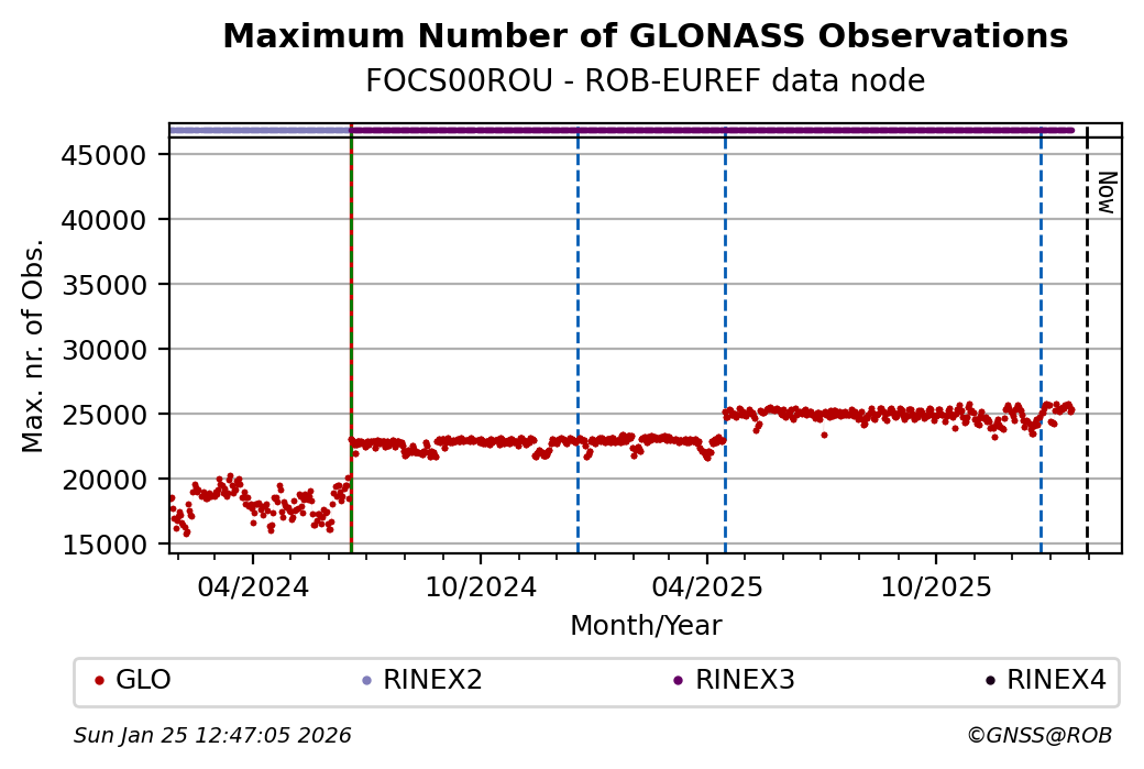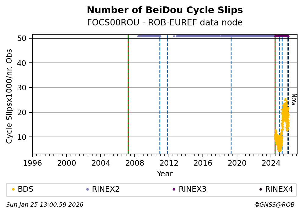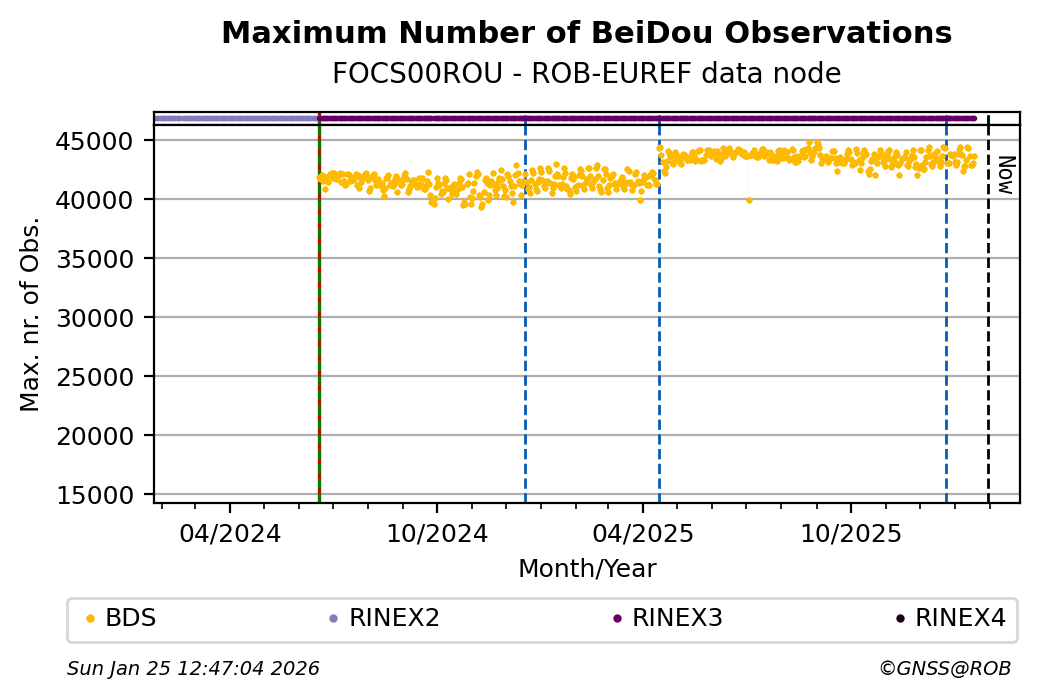 The plots below present the long-term tracking performance of the EPOS-GNSS station FOCS00ROU based on the daily RINEX data available from the ROB-EUREF EPOS-GNSS data node. The data quality metrics have been computed at the data node using the G-Nut/Anubis software.