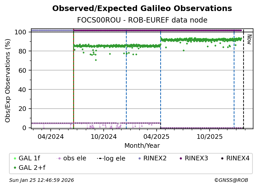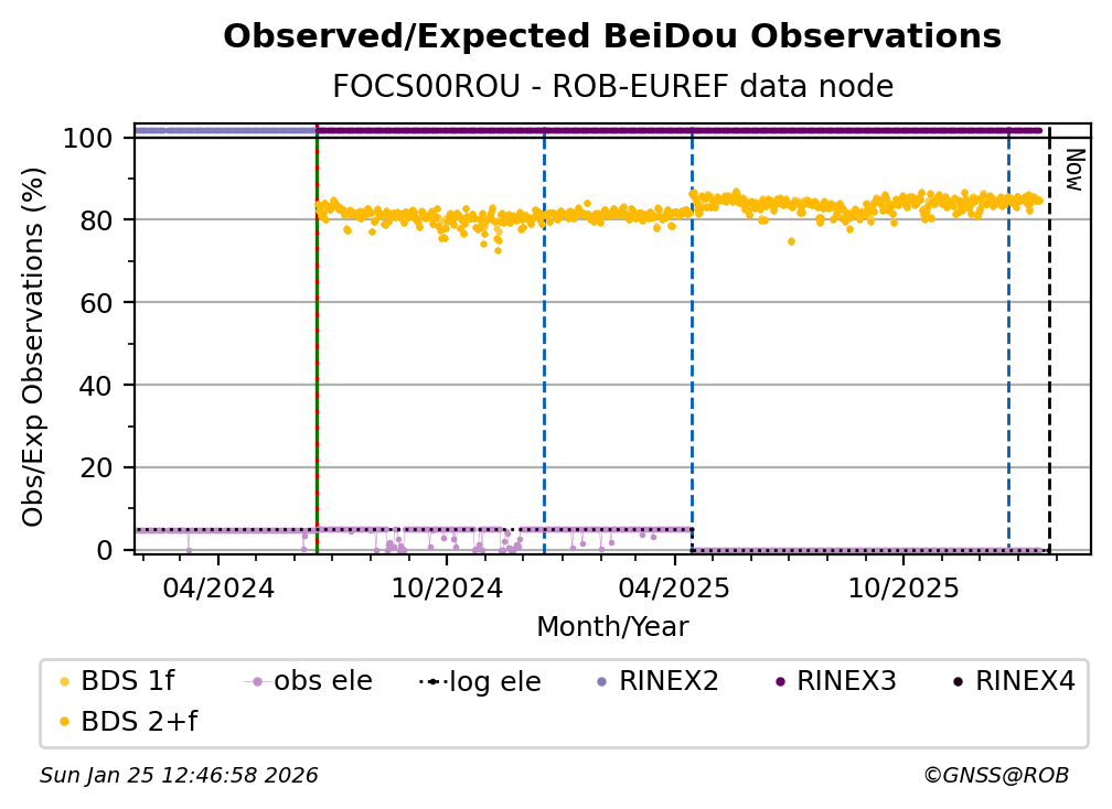 The percentage corresponds, for each constellation tracked by the station, to the ratio of the number of observations in the daily RINEX file with respect to the number of expected observations: