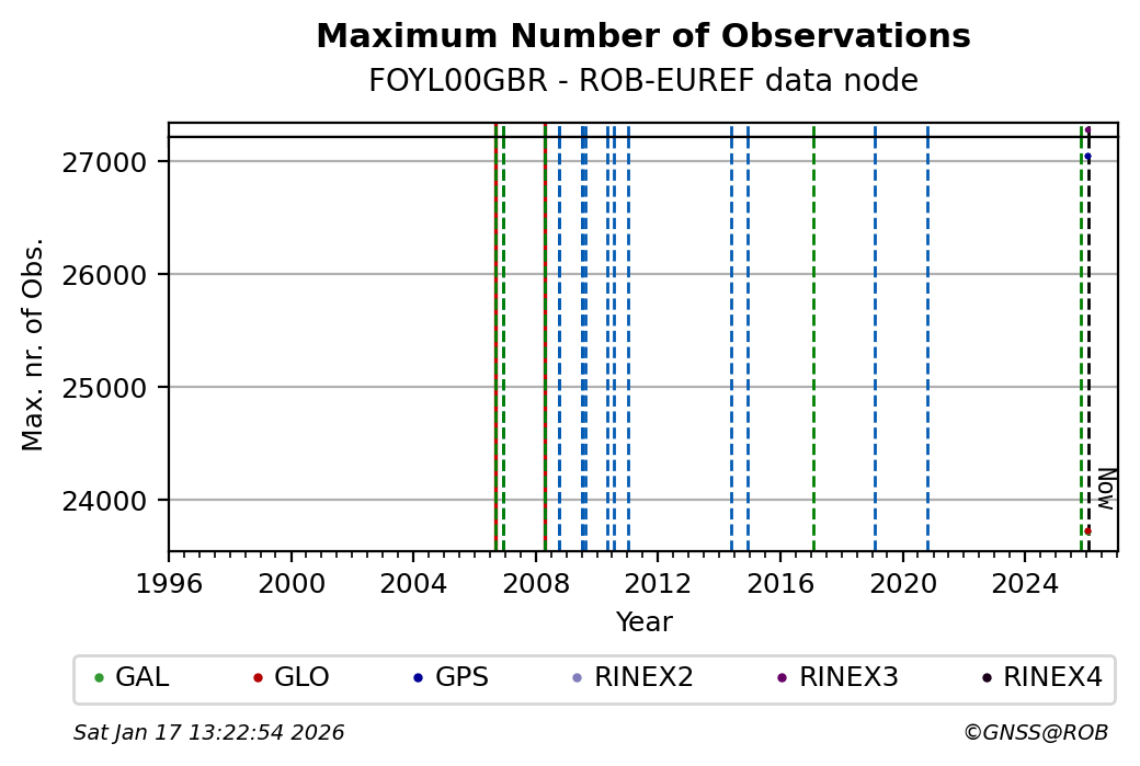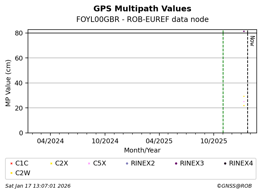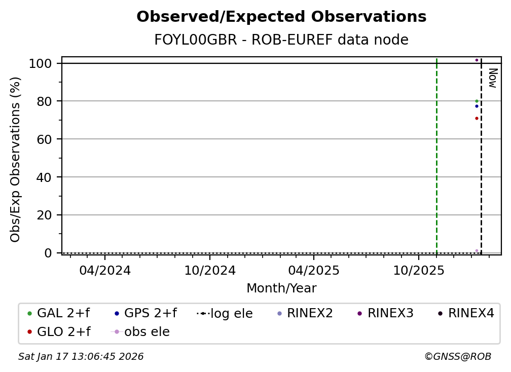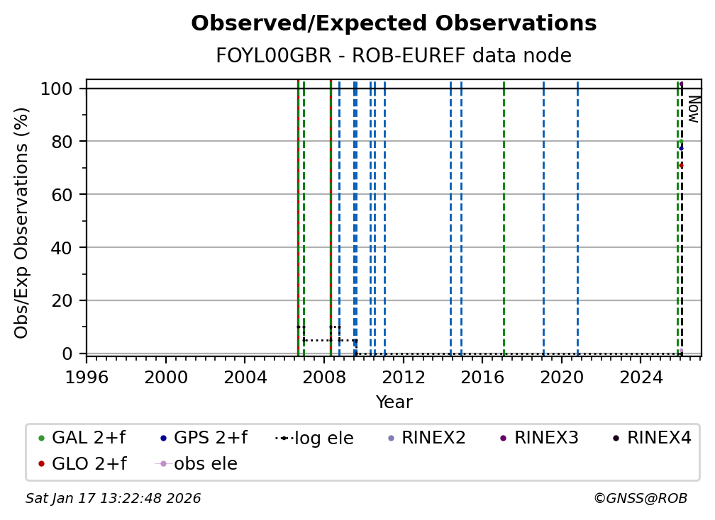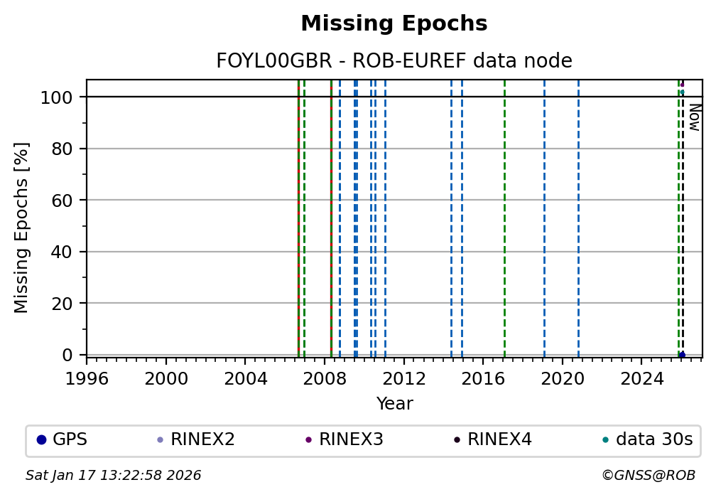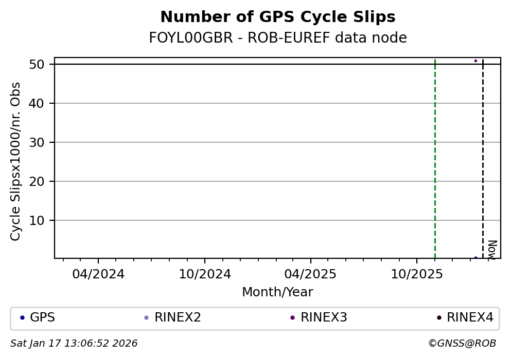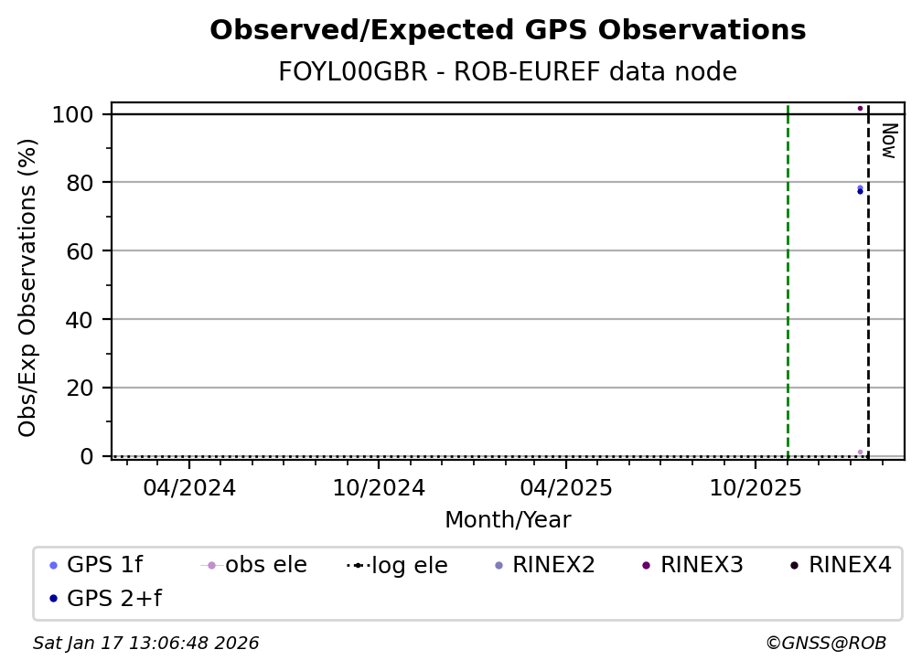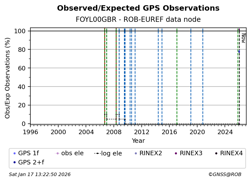 The plots below present the long-term tracking performance of the EPOS-GNSS station FOYL00GBR based on the daily RINEX data available from the ROB-EUREF EPOS-GNSS data node. The data quality metrics have been computed at the data node using the G-Nut/Anubis software.