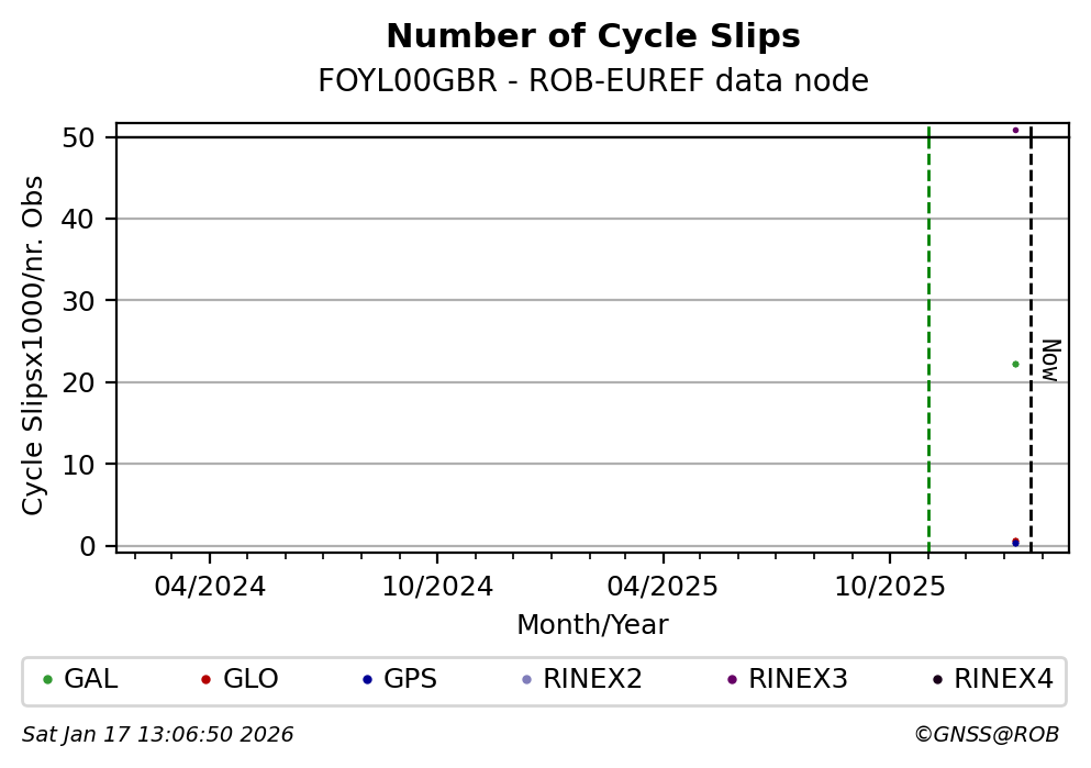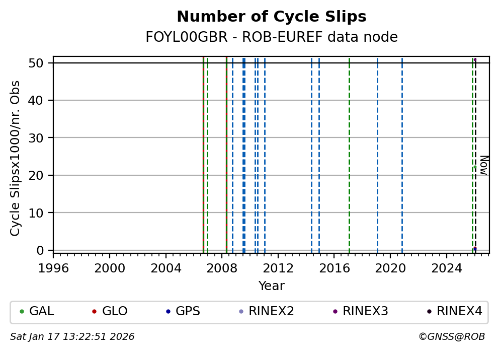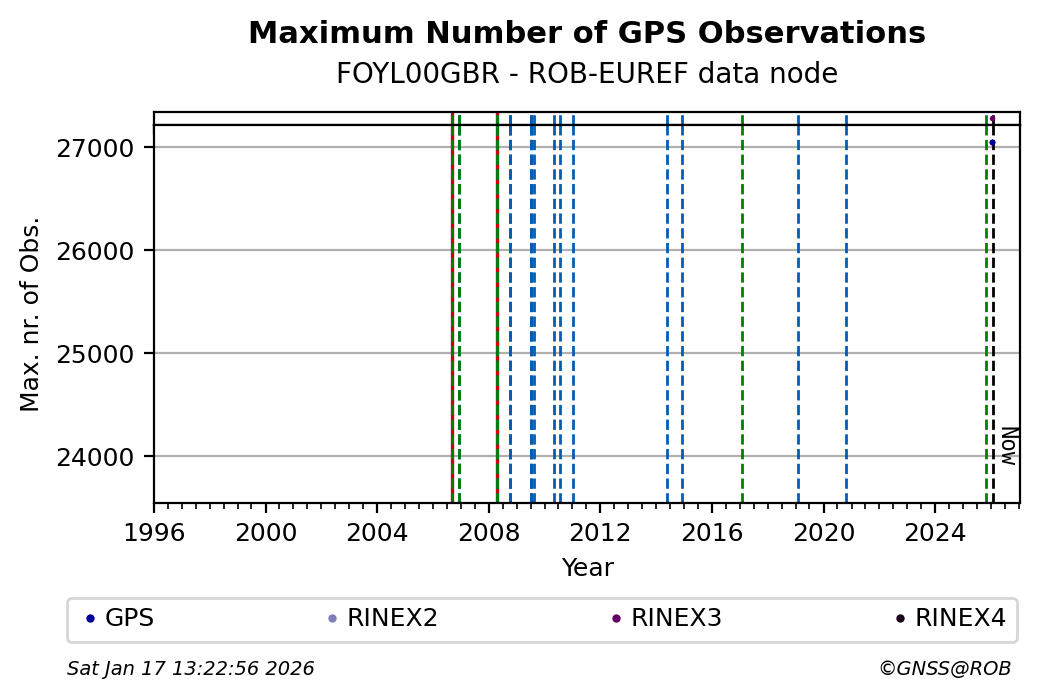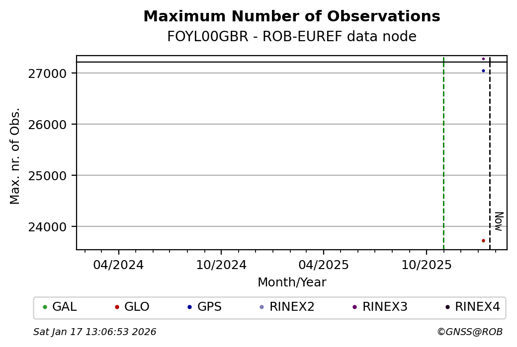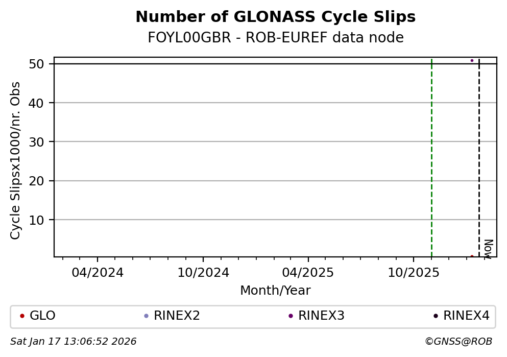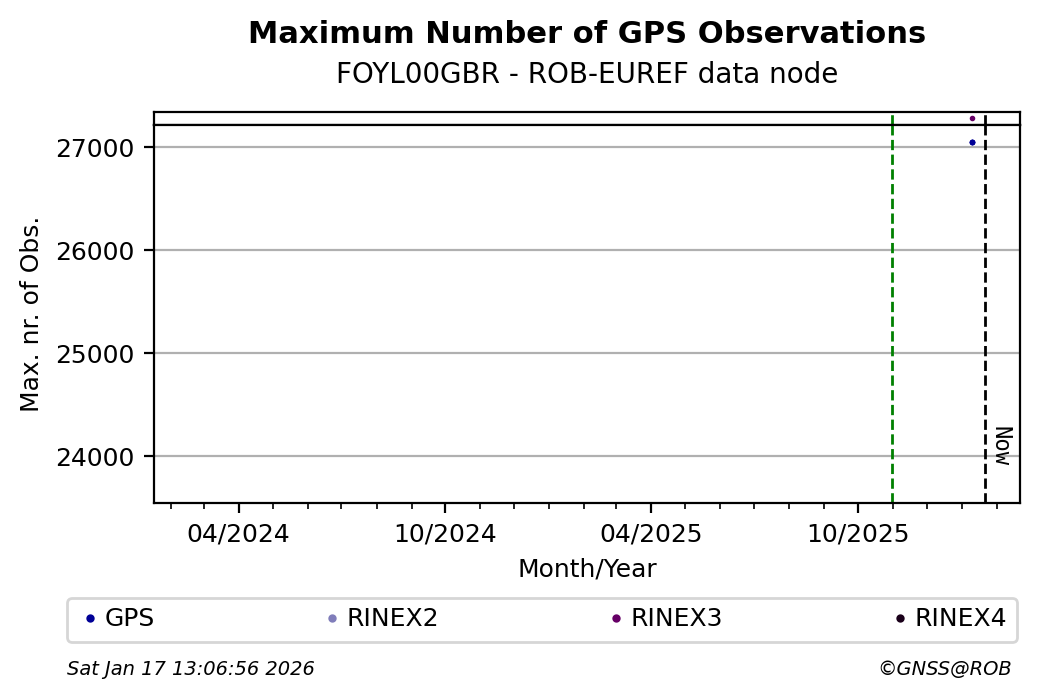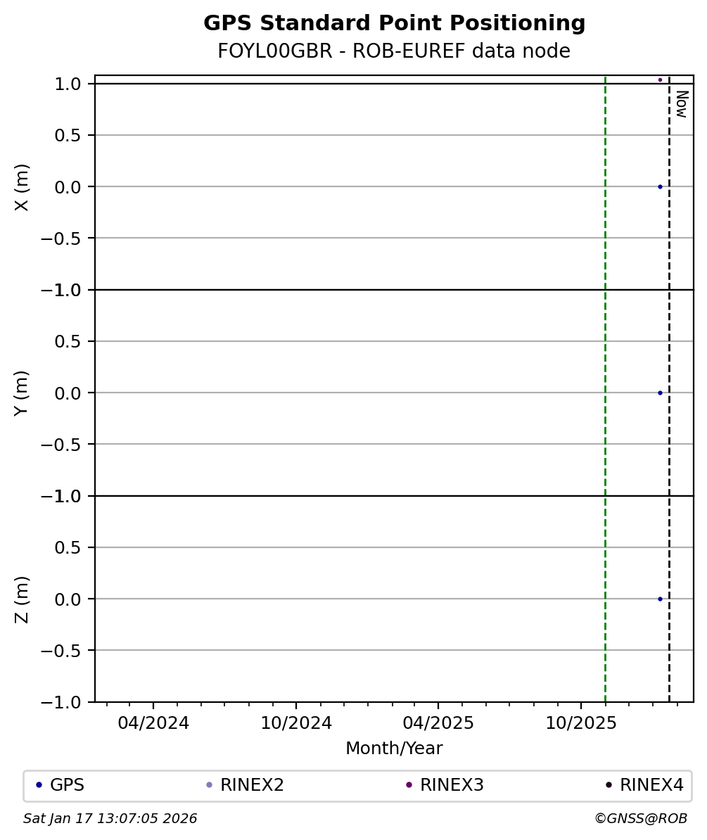 The plots below present the long-term tracking performance of the EPOS-GNSS station FOYL00GBR based on the daily RINEX data available from the ROB-EUREF EPOS-GNSS data node. The data quality metrics have been computed at the data node using the G-Nut/Anubis software.