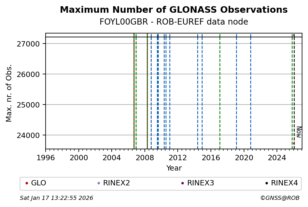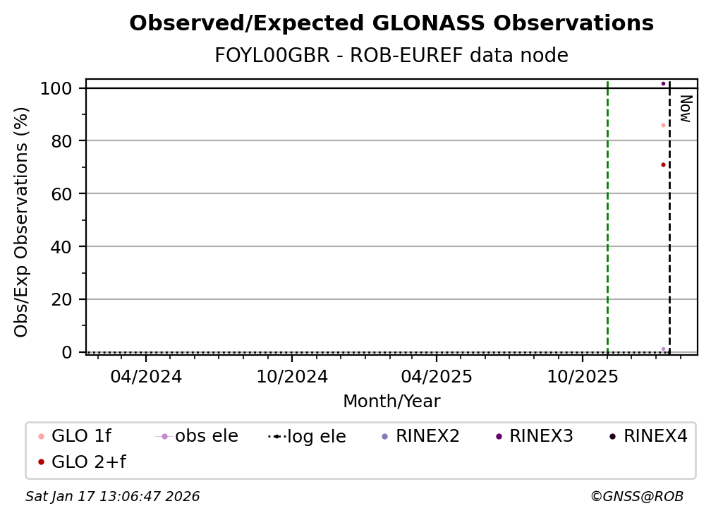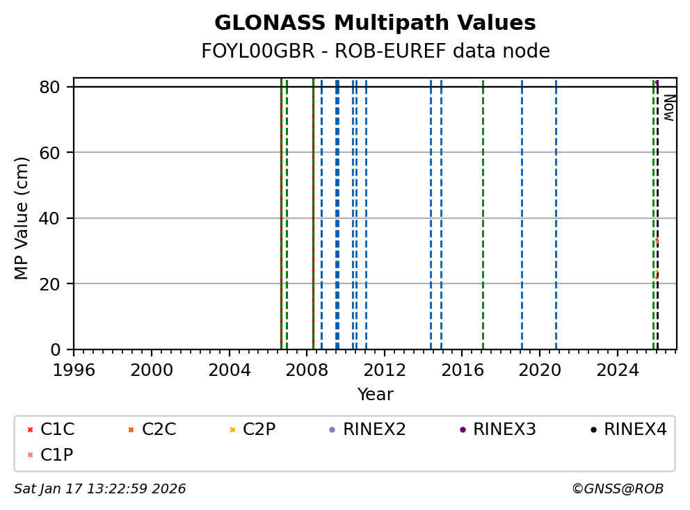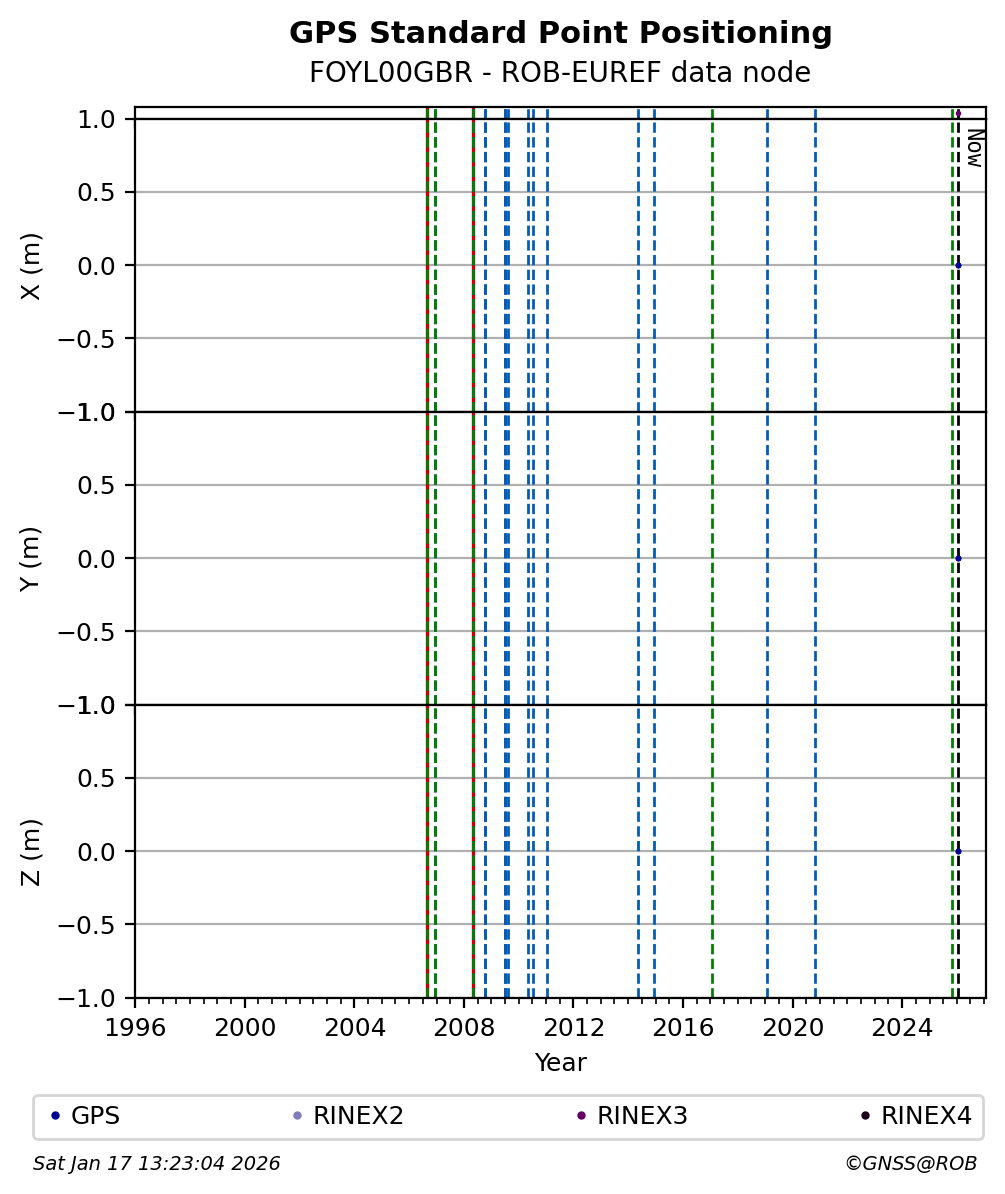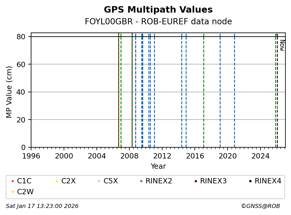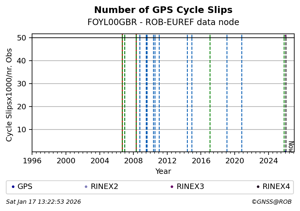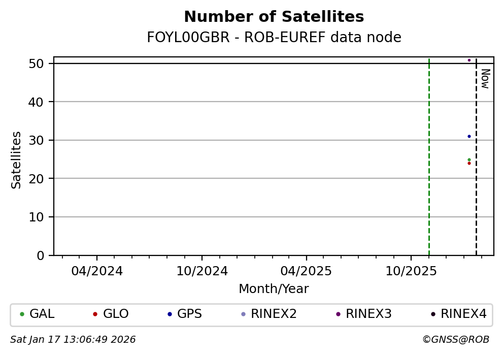 The plots below present the long-term tracking performance of the EPOS-GNSS station FOYL00GBR based on the daily RINEX data available from the ROB-EUREF EPOS-GNSS data node. The data quality metrics have been computed at the data node using the G-Nut/Anubis software.