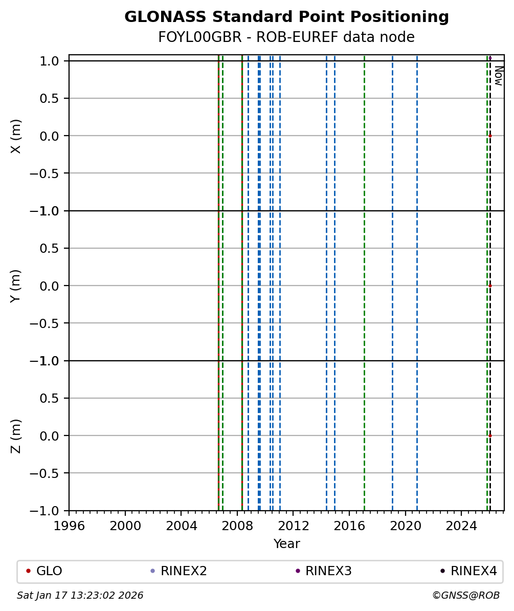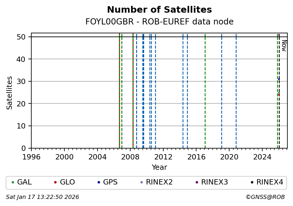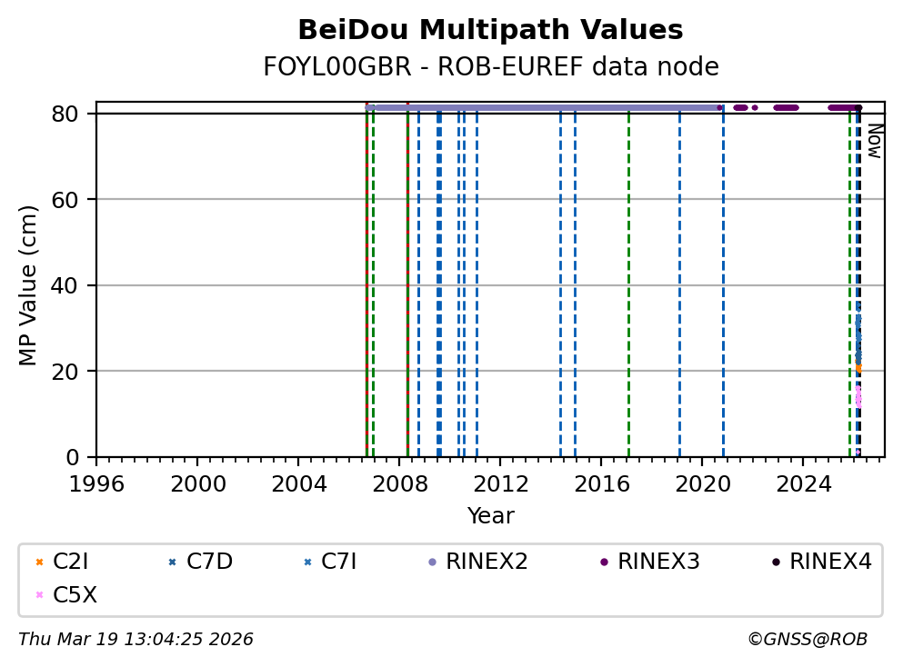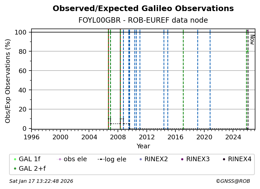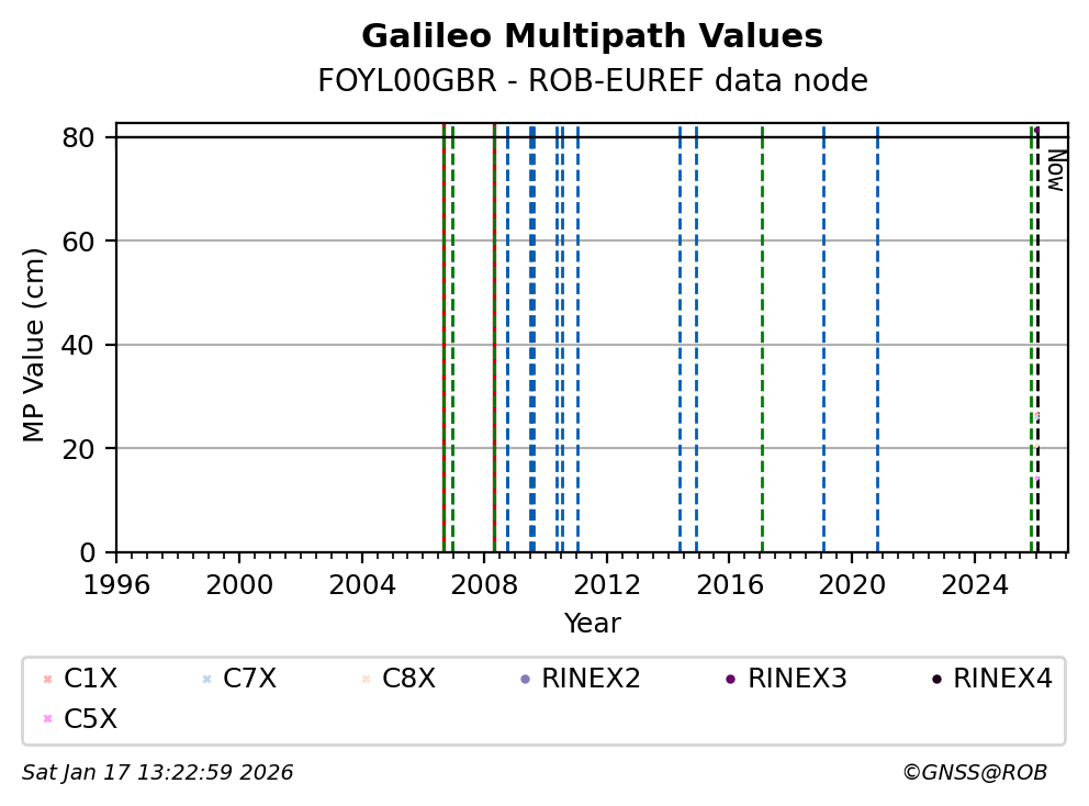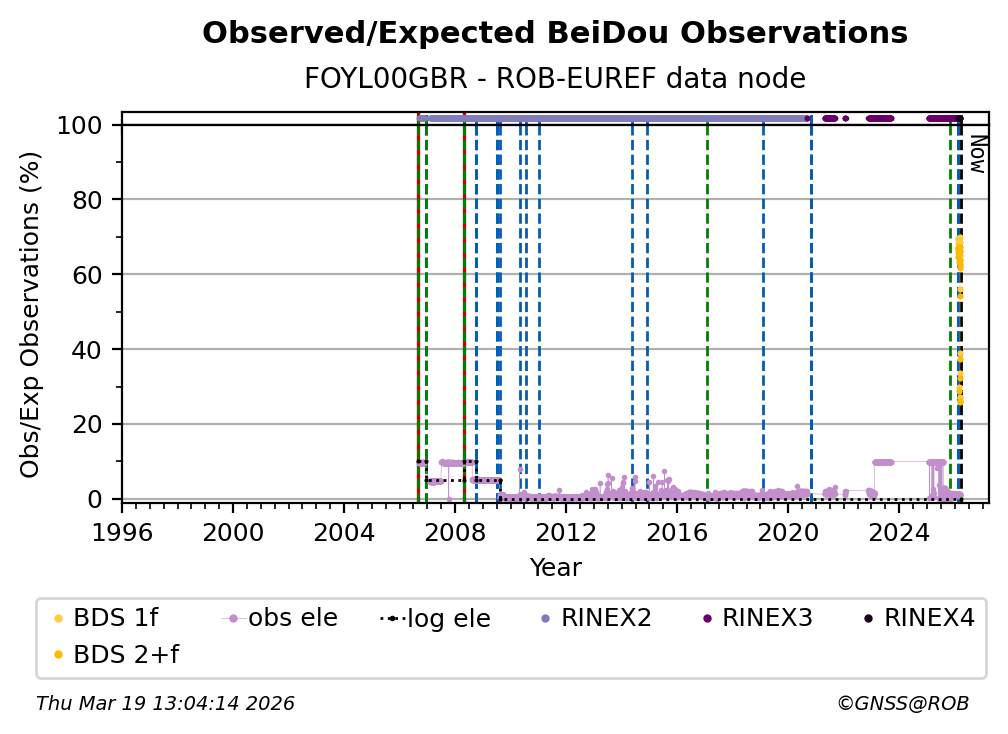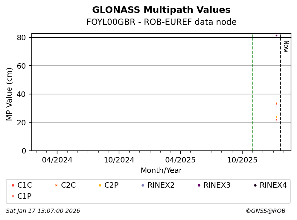 The plots below present the long-term tracking performance of the EPOS-GNSS station FOYL00GBR based on the daily RINEX data available from the ROB-EUREF EPOS-GNSS data node. The data quality metrics have been computed at the data node using the G-Nut/Anubis software.